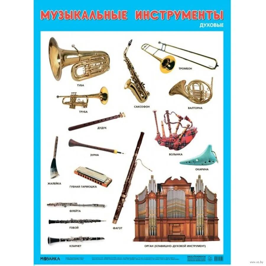 Данный тематический плакат предназначен для знакомства детей с духовыми музыкальными инструментами.