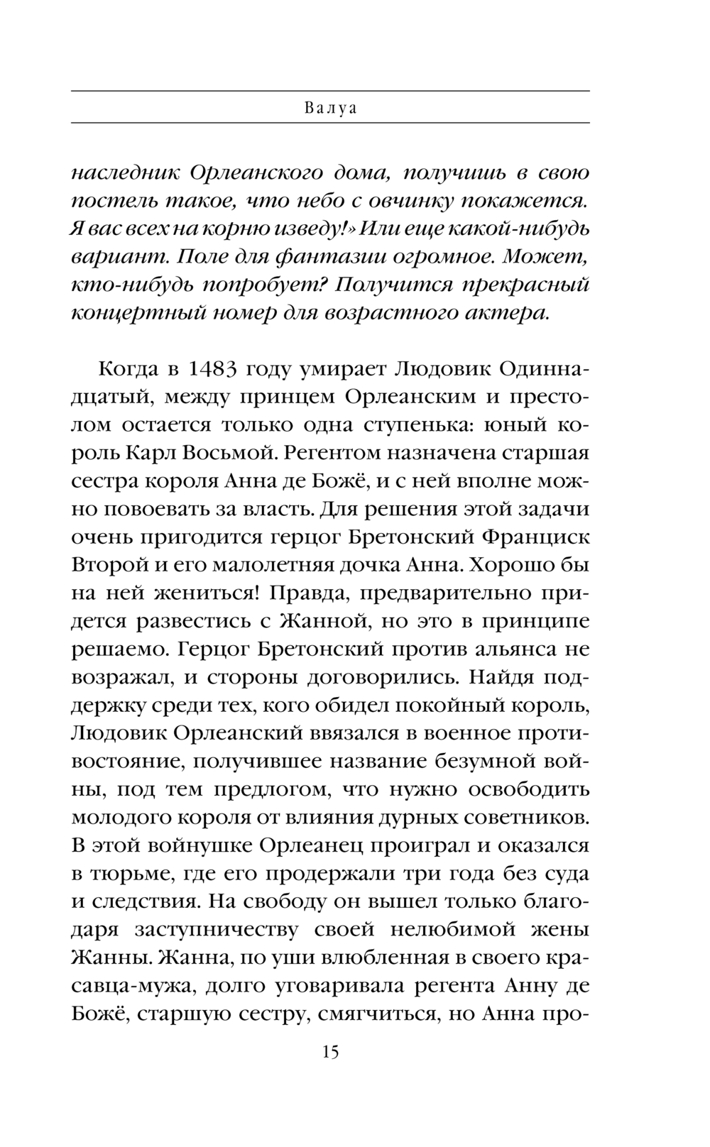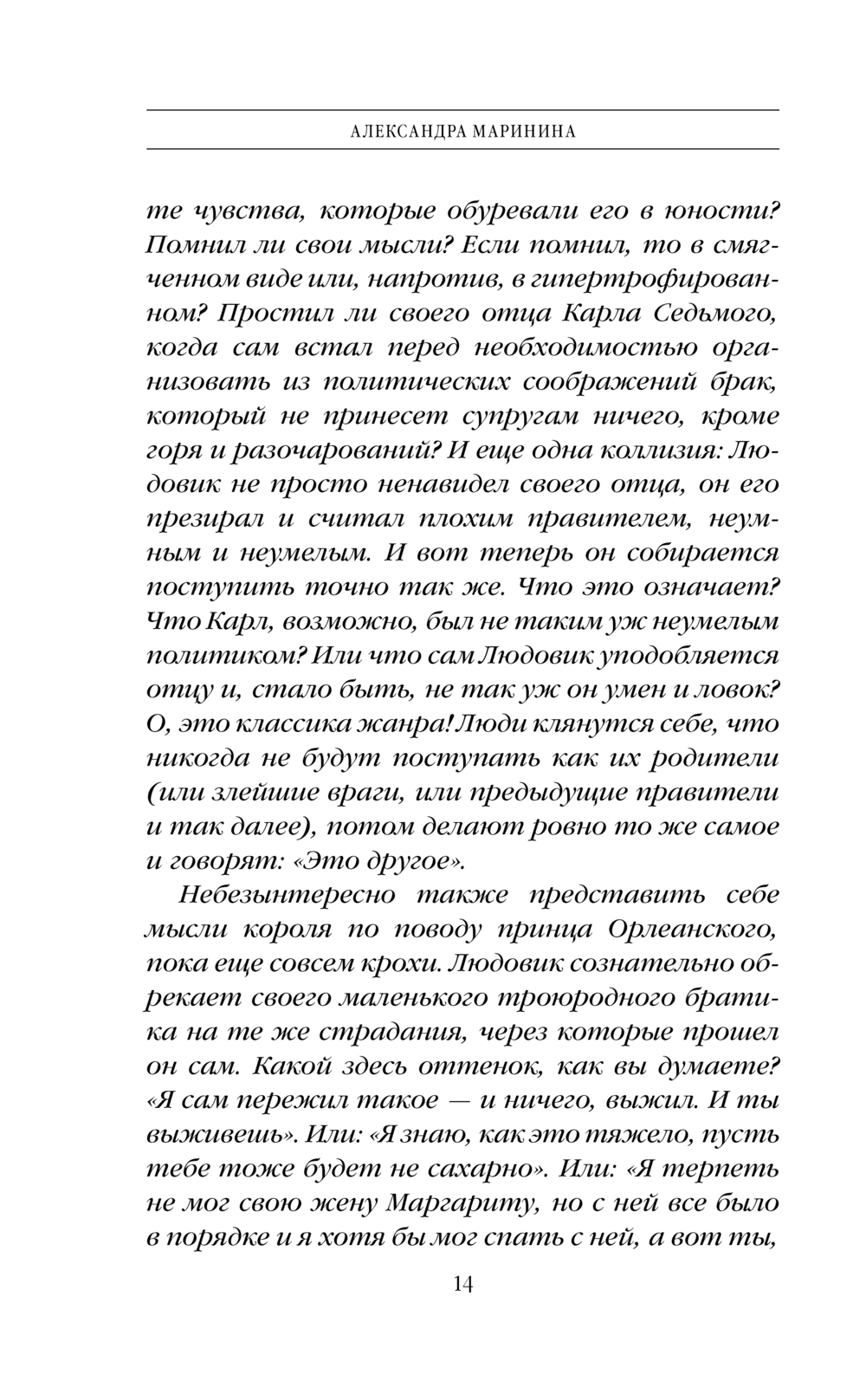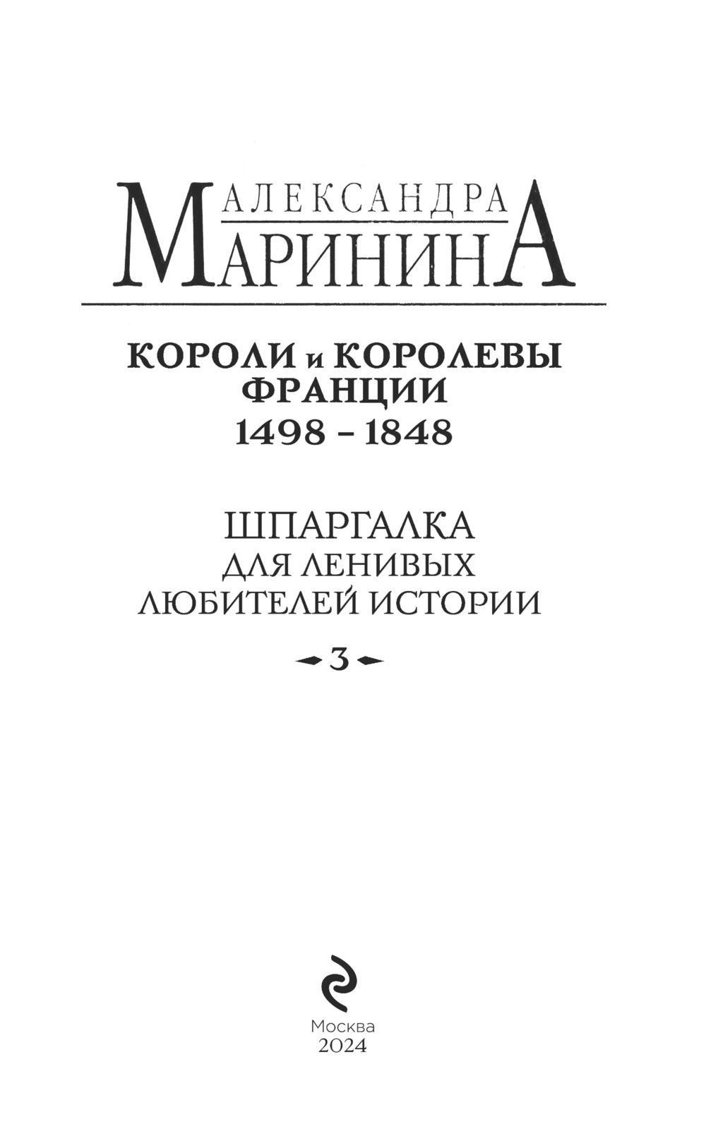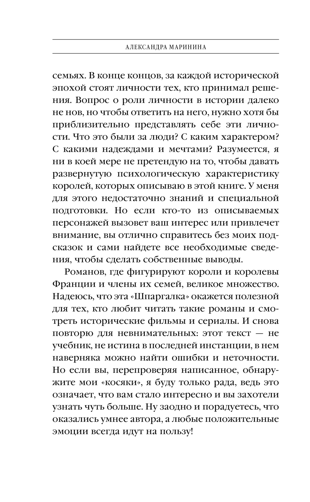 Новая историческая "шпаргалка" от Александры Марининой. На этот раз – французская. Париж, Версаль, блистательные короли, дерзкие королевы, изящные фрейлины и смелые мушкетёры... Ну кто из нас с детства не был очарован Францией и ее историей! C особым "марининским" юмором в книге рассказывается история французских королей от Отца народа Людовика Двенадцатого до Луи-Филиппа Первого. Вы узнаете что это были за люди, с какими талантами и недостатками, какими надеждами и мечтами они жили.
