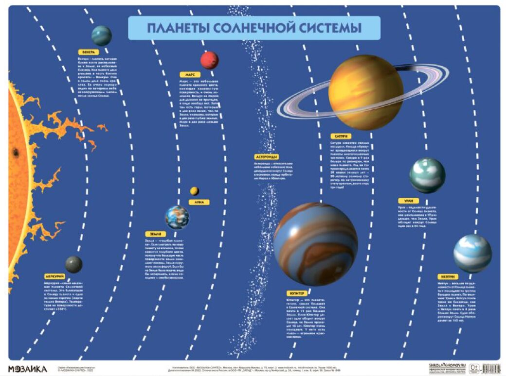 Плакат помогает детям сформировать первичные представления об астрономии, побудить их интерес к дальнейшему изучению окружающего мира и тягу к новым открытиям.
