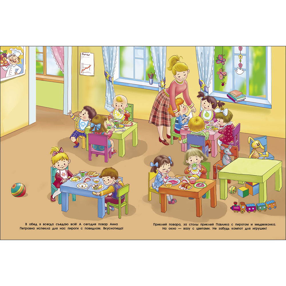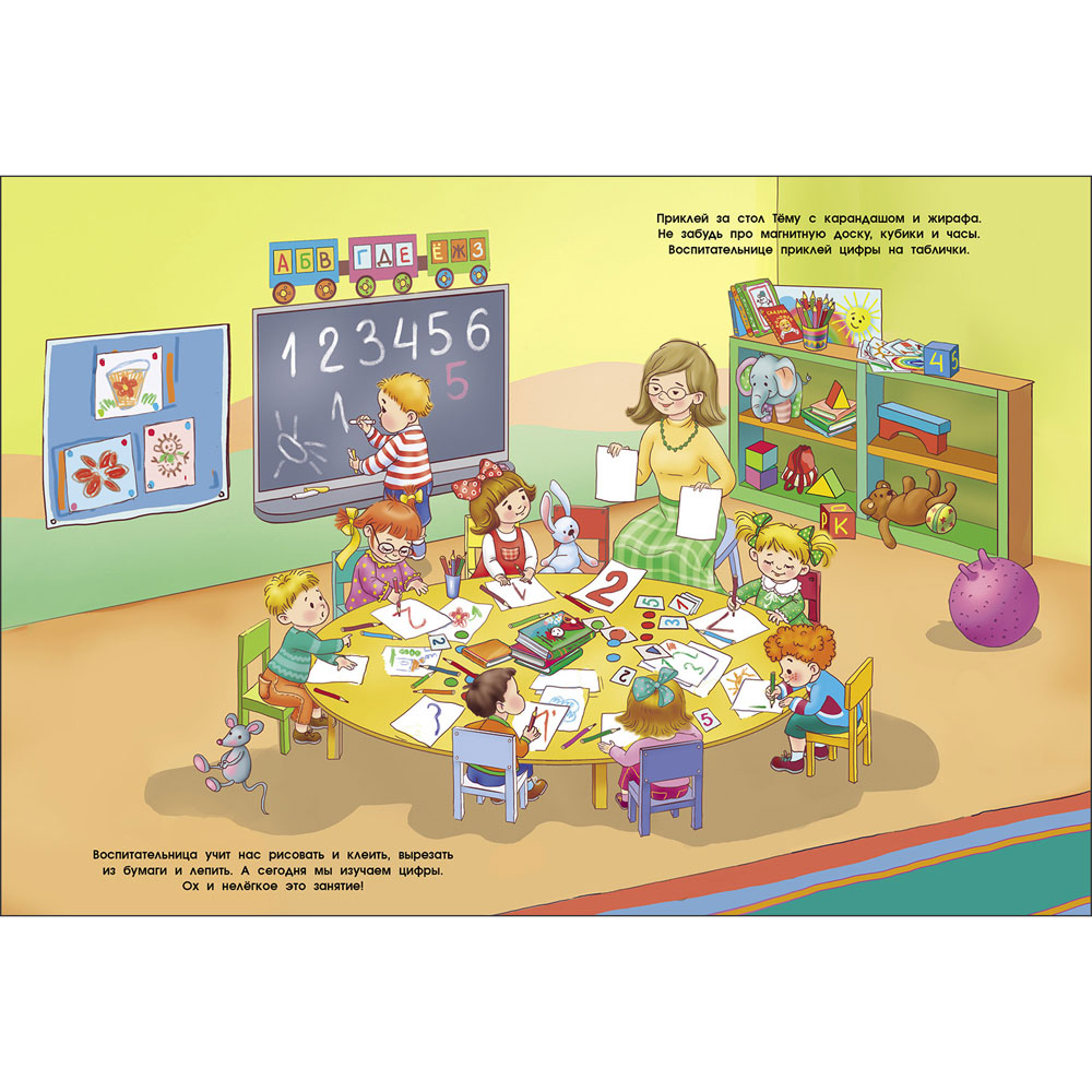 Маленький Вова очень любит ходить в детский сад. Ведь там так много весёлых игр, интересных занятий и спортивных соревнований. Давай вместе посмотрим, как проходит Вовин день? Приклеивай многоразовые наклейки, придумывай весёлые истории, занимайся и играй с ребятами – в садике просто некогда скучать!