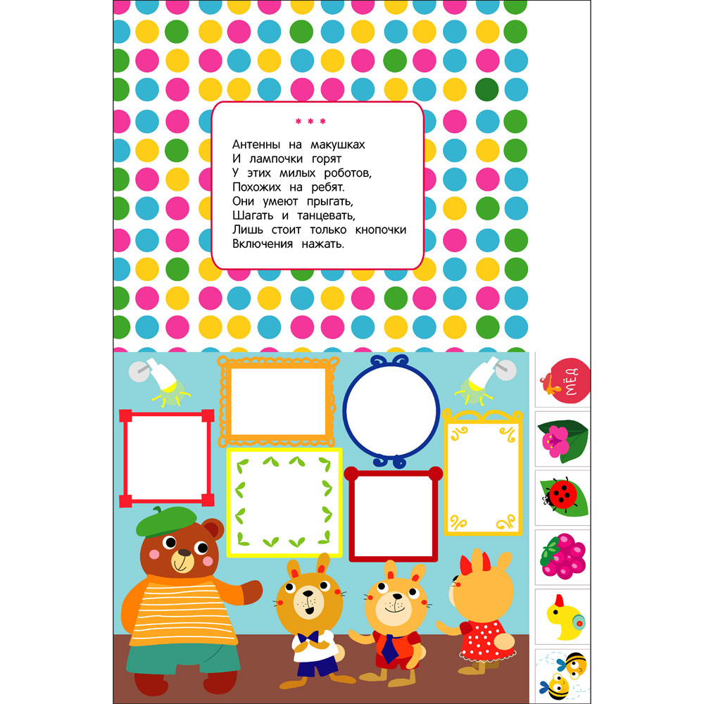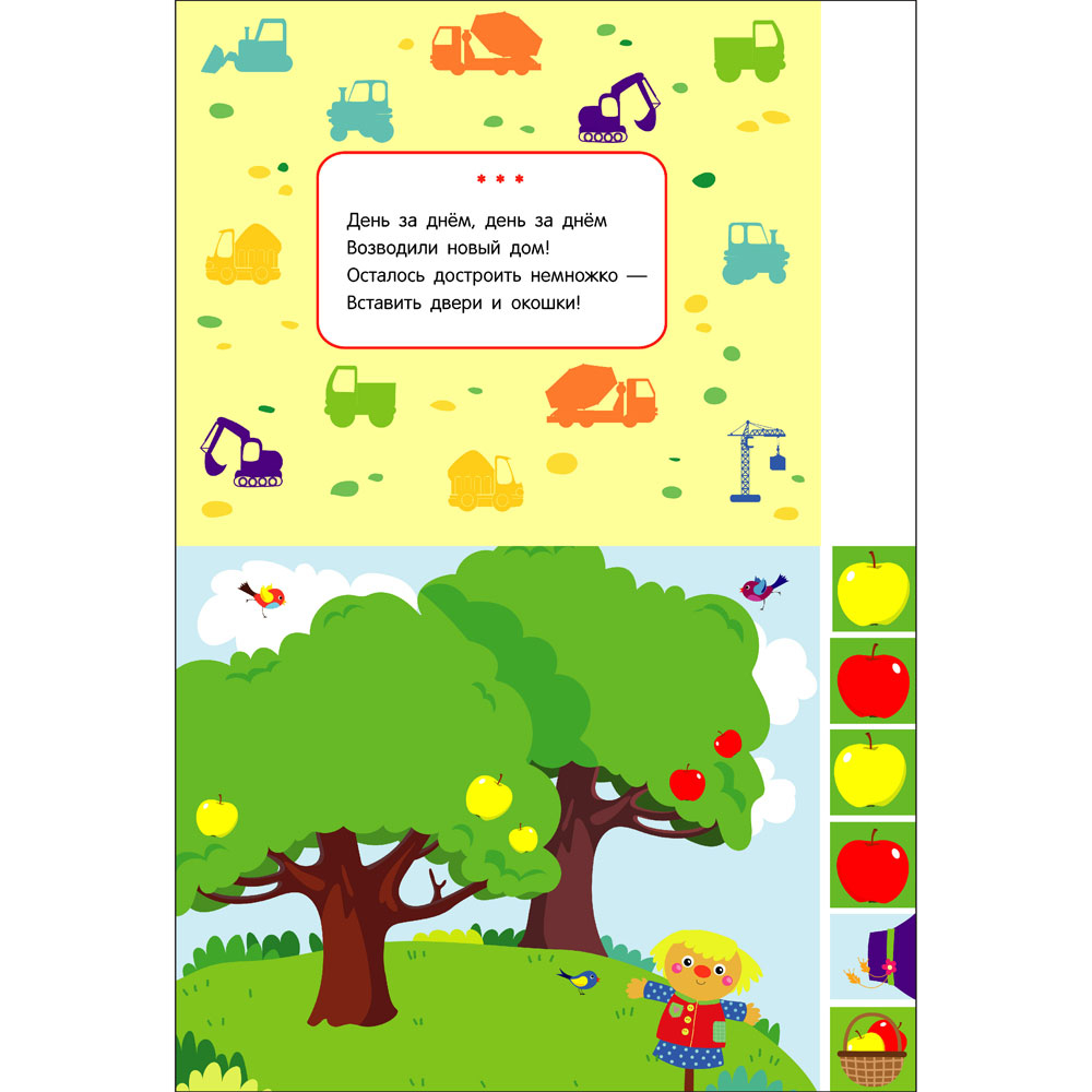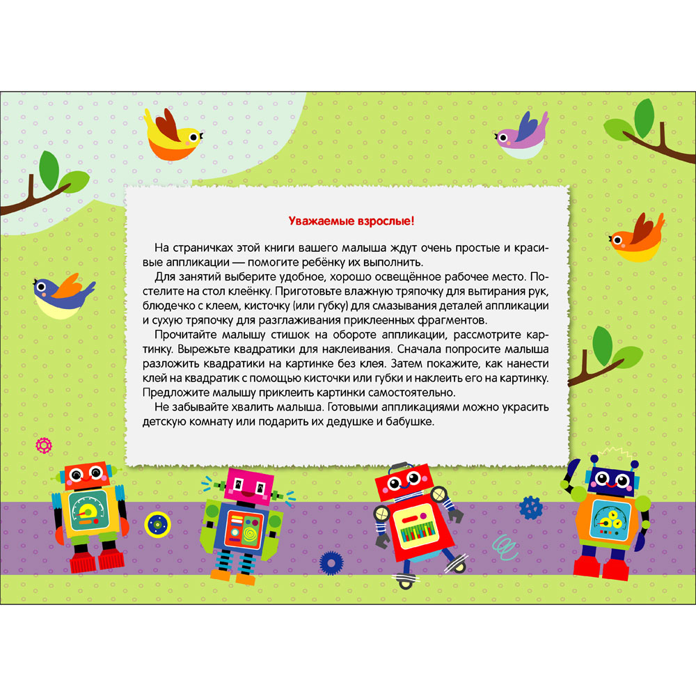 На страничках этой книги вашего малыша ждут очень простые и красивые аппликации – помогите ребёнку их выполнить. Для занятий выберите удобное, хорошо освещённое рабочее место. Постелите на стол клеёнку. Приготовьте влажную тряпочку для вытирания рук, клей для смазывания деталей аппликации и сухую тряпочку для разглаживания приклеенных фрагментов.