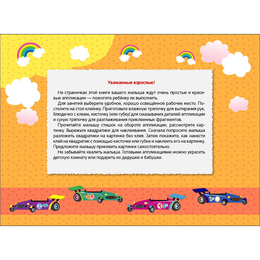 На страничках этой книги вашего малыша ждут очень простые и красивые аппликации – помогите ребёнку их выполнить. Для занятий выберите удобное, хорошо освещённое рабочее место. Постелите на стол клеёнку. Приготовьте влажную тряпочку для вытирания рук, клей для смазывания деталей аппликации и сухую тряпочку для разглаживания приклеенных фрагментов.