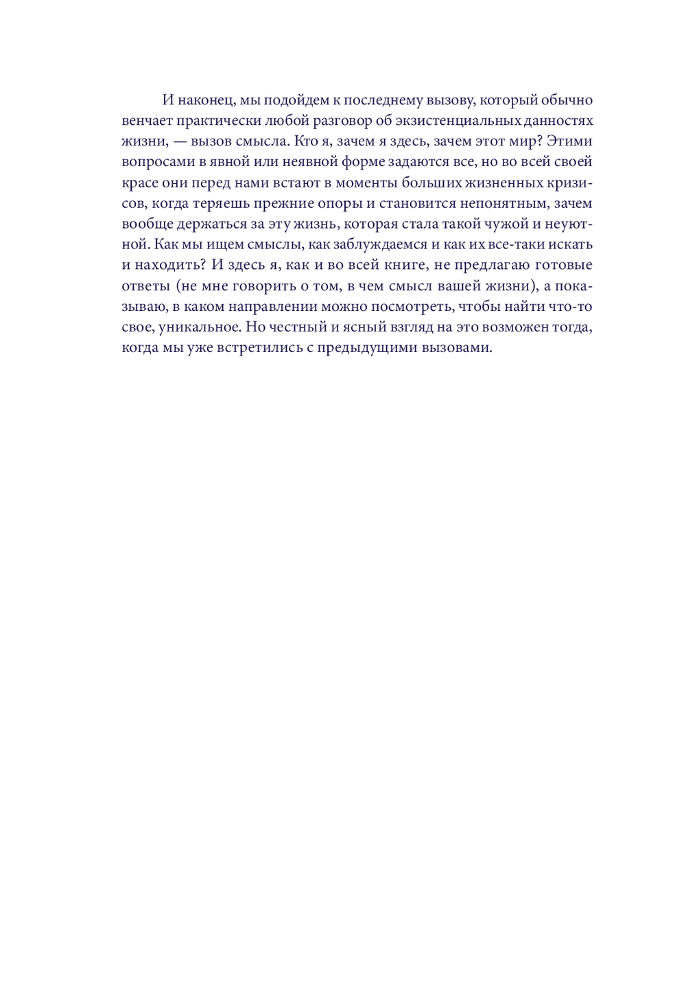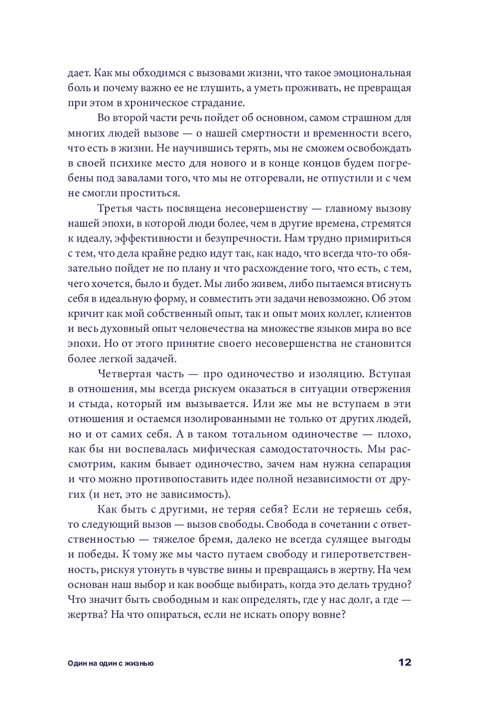 Как примириться с тем, что все в мире конечно? Как принять несовершенство себя и других? Какую цену мы платим за сделанные выборы, в том числе свободу? Как справиться с одиночеством, изоляцией, травлей? Как найти смысл жизни? Почему важно проживать эмоциональную боль, а не игнорировать ее?