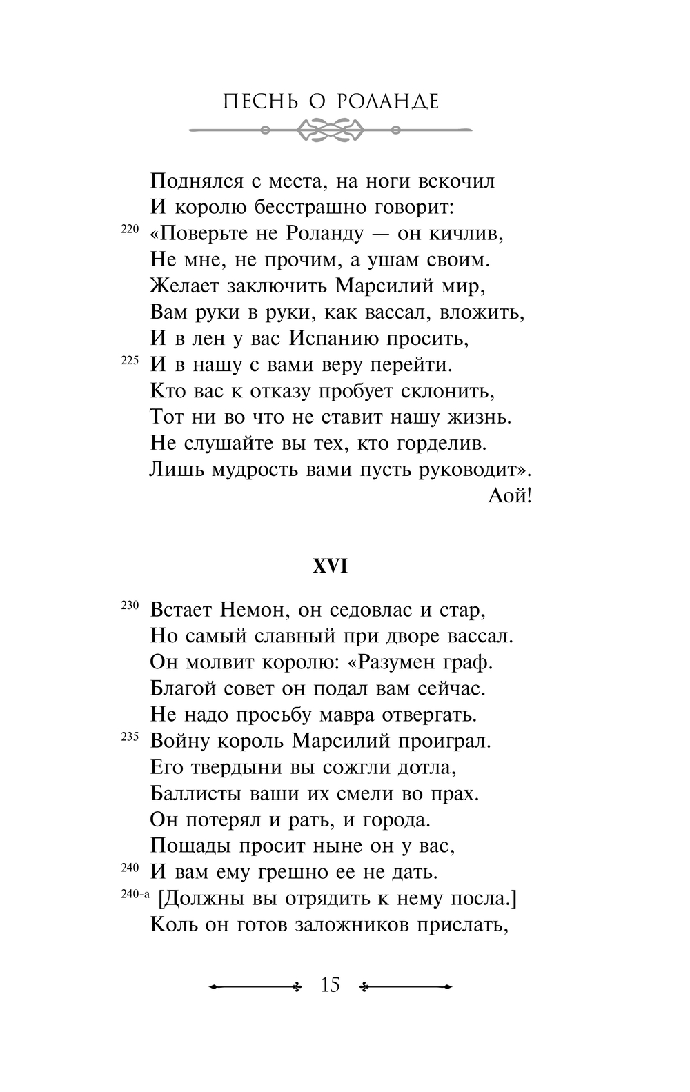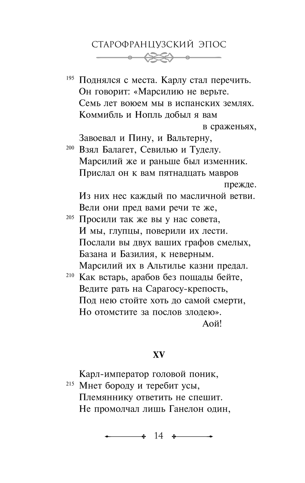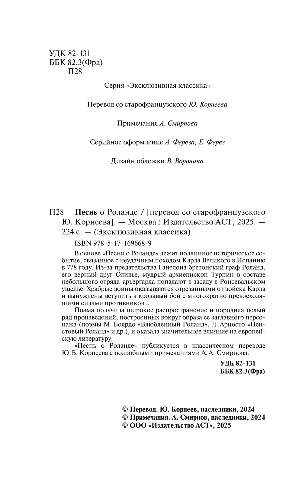 "Песнь о Роланде" публикуется в классическом переводе Ю. Б. Корнеева с подробными примечаниями А. А. Смирнова.