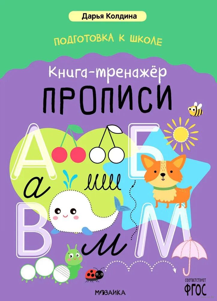 "Книга-тренажер. Прописи" из серии "Дарья Колдина. Подготовка к школе" идеально подходит, чтобы повторить с ребенком весь необходимый будущему первокласснику материал.
