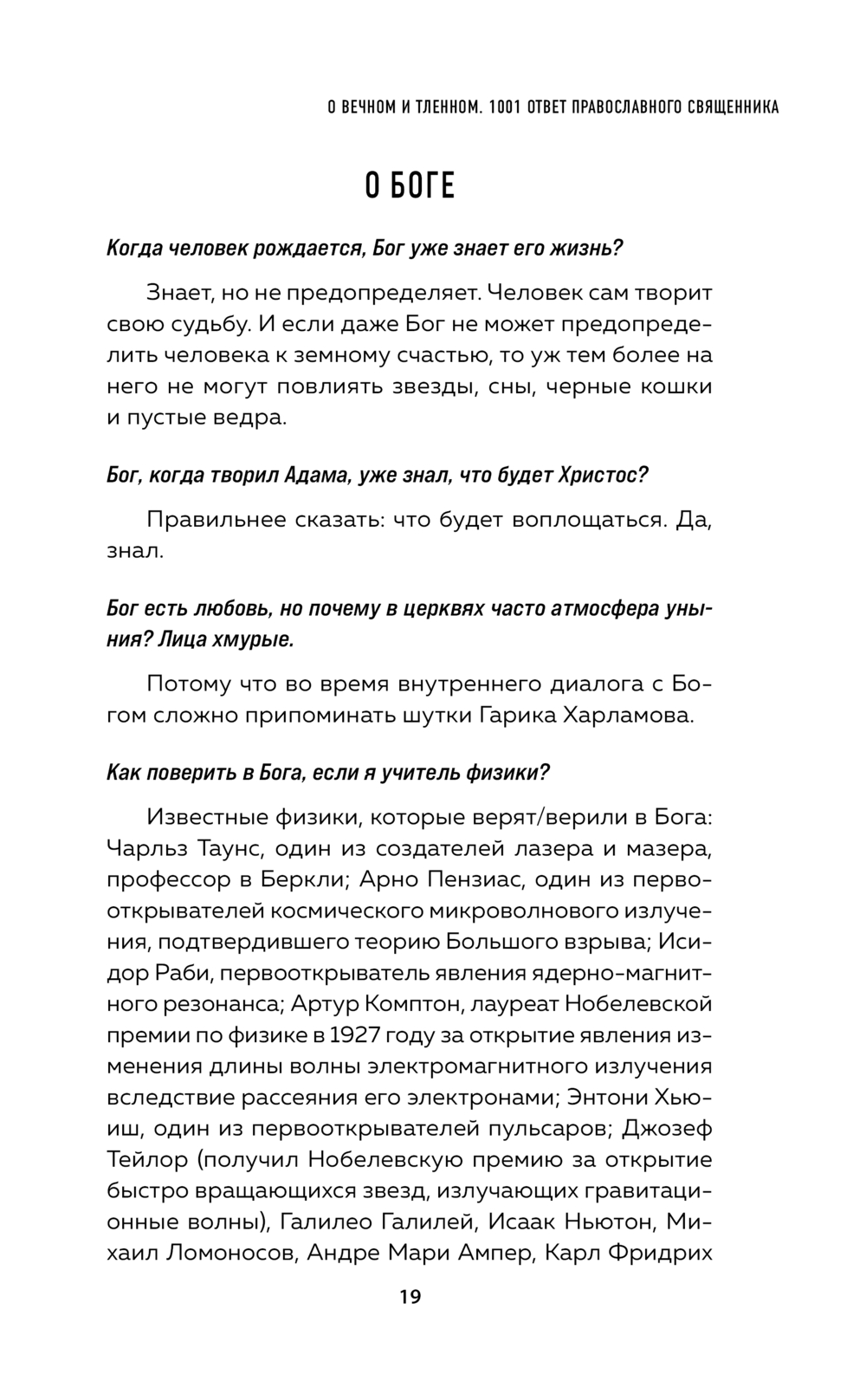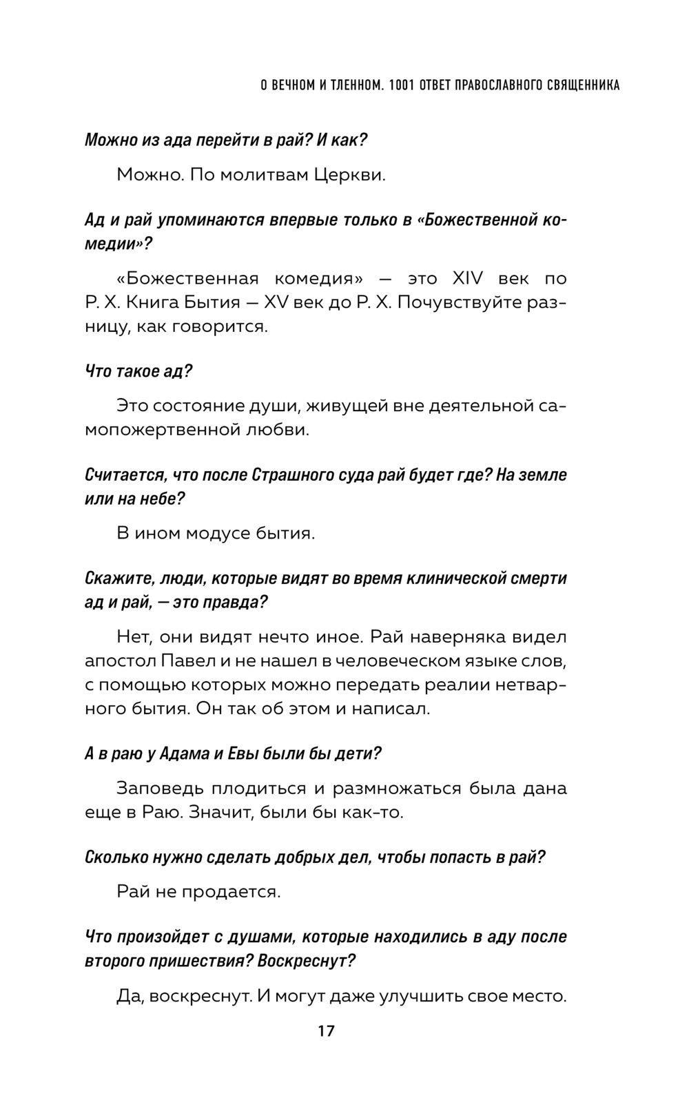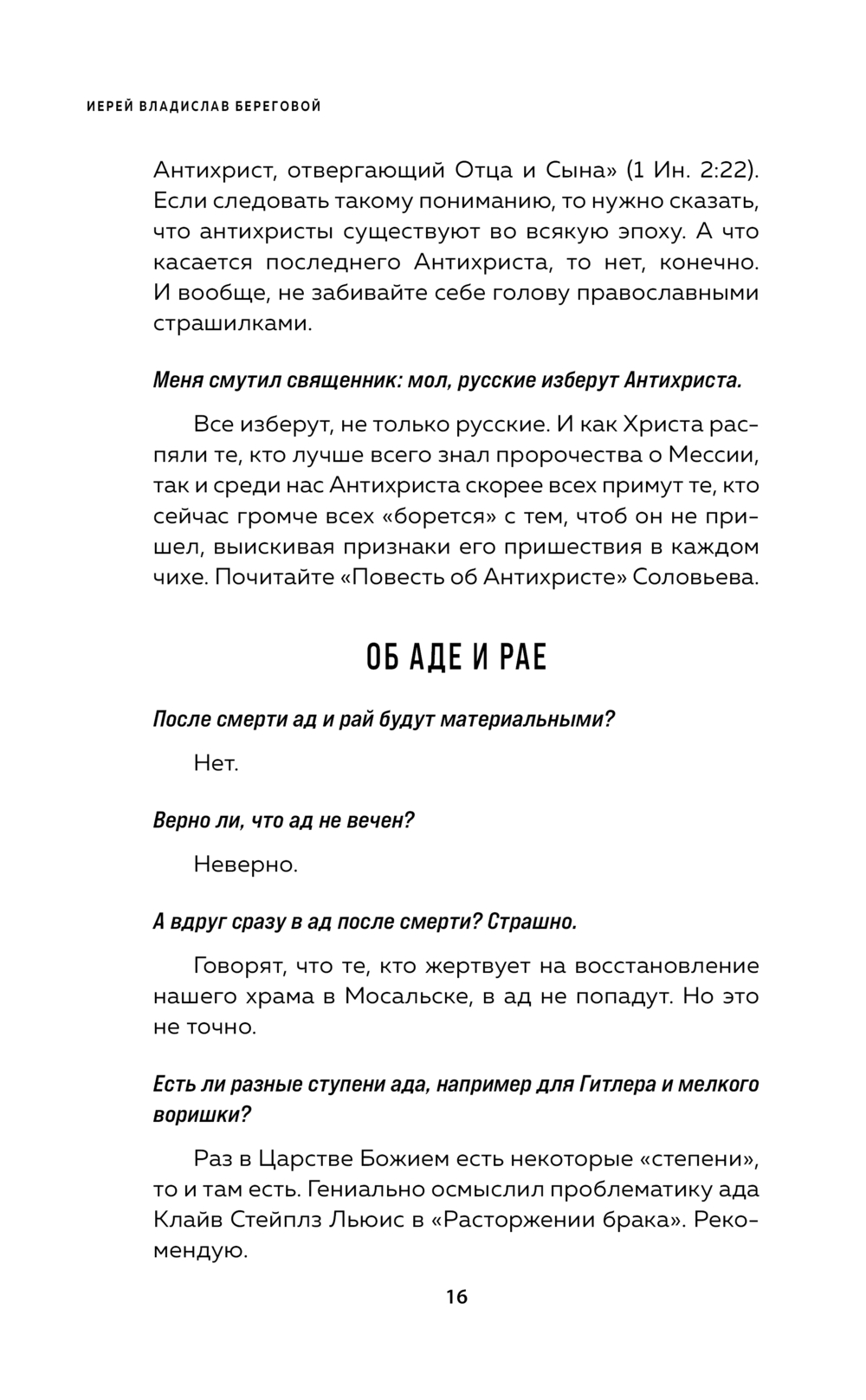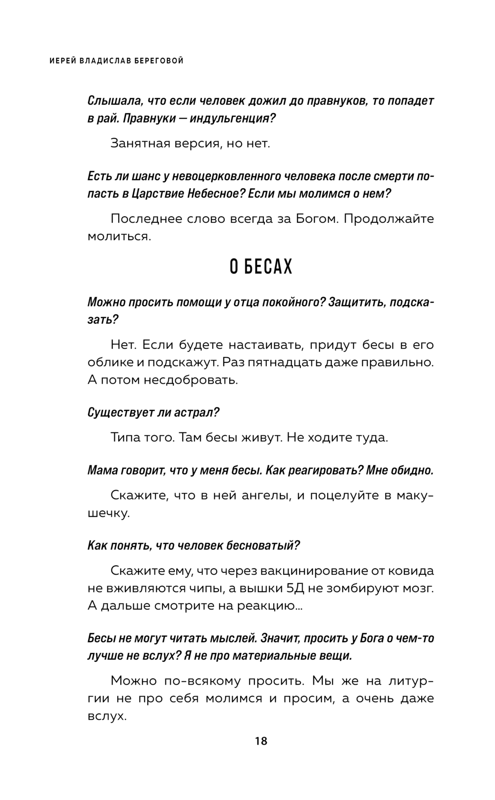 Может ли ангел-хранитель навсегда покинуть нас? Передаются ли детям грехи родителей? Что будет с нами после смерти и близок ли конец света? Что главное в браке? Обязательно ли освящать дом и машину? Можно ли беременным стричься и посещать кладбища? Многих из нас – и тех, кто давно стал частью Церкви, и тех, кто только делает свои первые шаги на пути к ней, – неизменно волнуют самые разные вопросы, от довольно забавных до очень серьезных. Поэтому возможность в самом скором времени получить четкий и ясный ответ, особенно от автора, которого мы любим и уважаем, всегда становится невероятно ценной, поскольку позволяет нам сберечь силы и время и направить их на благие дела. Именно этой цели посвящена новая книга иерея Владислава Берегового, составленная в формате вопрос – ответ, в основу которой легло многолетнее общение автора с прихожанами и подписчиками. Беседы о Боге и Его воле, о жизни и смерти, о грехах и добродетелях, об ангелах и бесах, о Священном Писании, о Церкви и о церковных таинствах, об отношениях и чувствах, о возрастании в вере и о многом другом – круг тем, которые призвана затронуть книга, необычайно широк, благодаря чему шанс найти ответ на давно тревоживший вопрос, каким бы он ни был, возрастает многократно.
