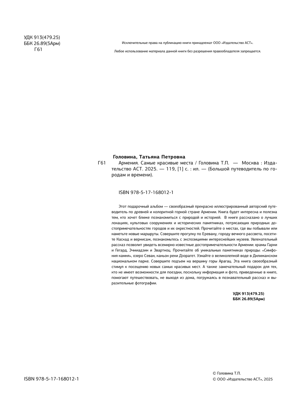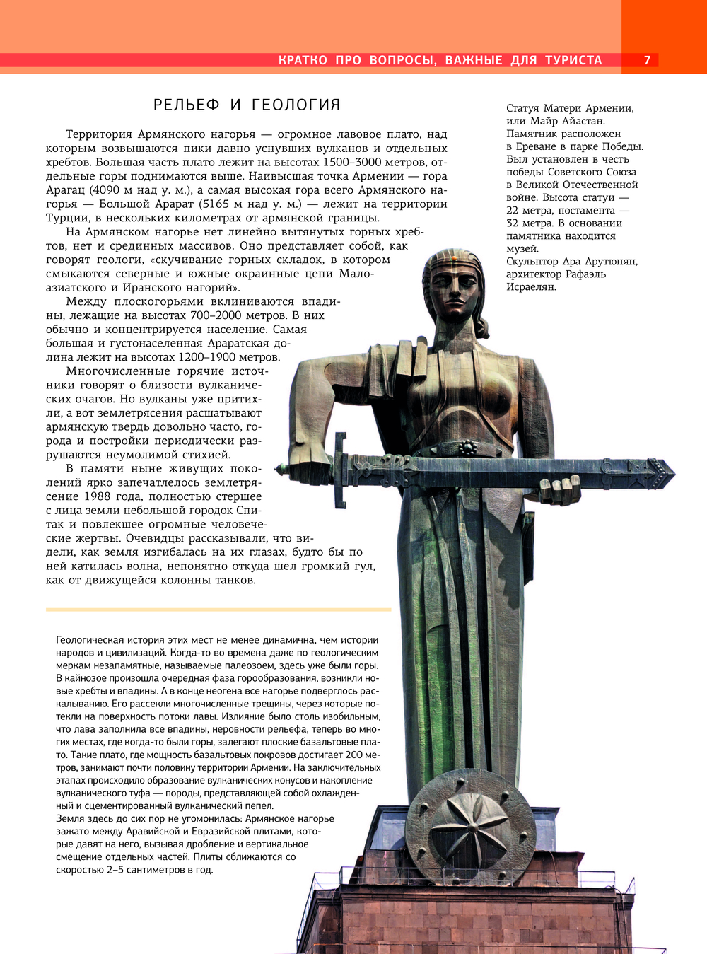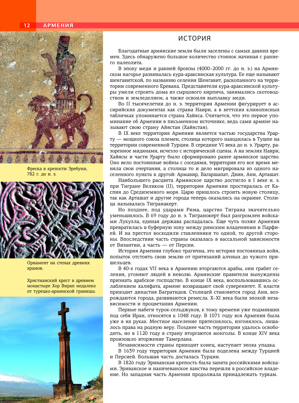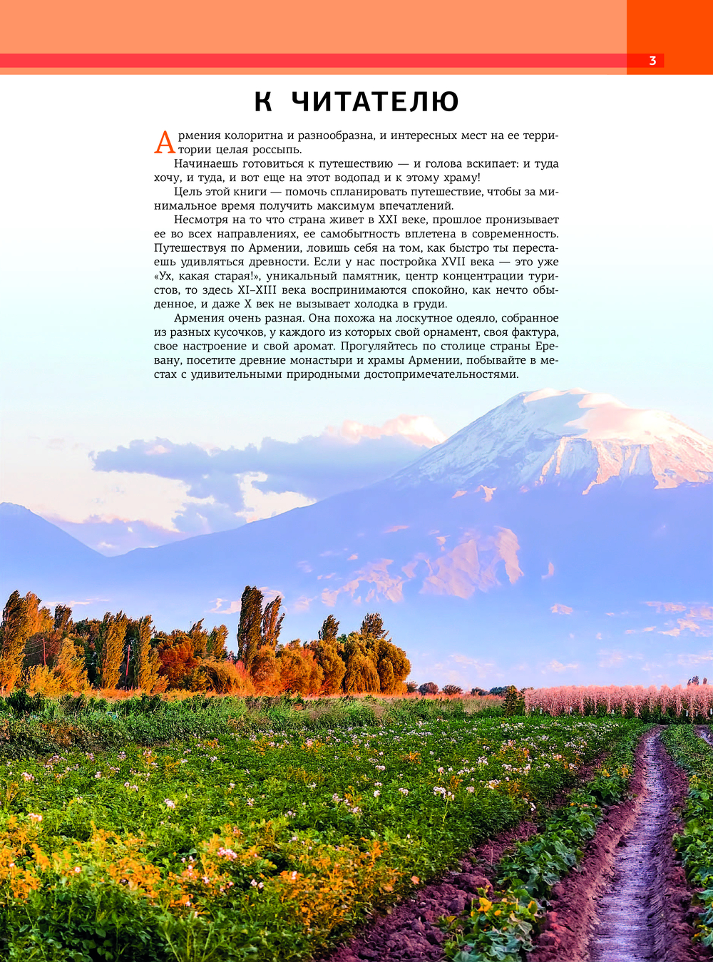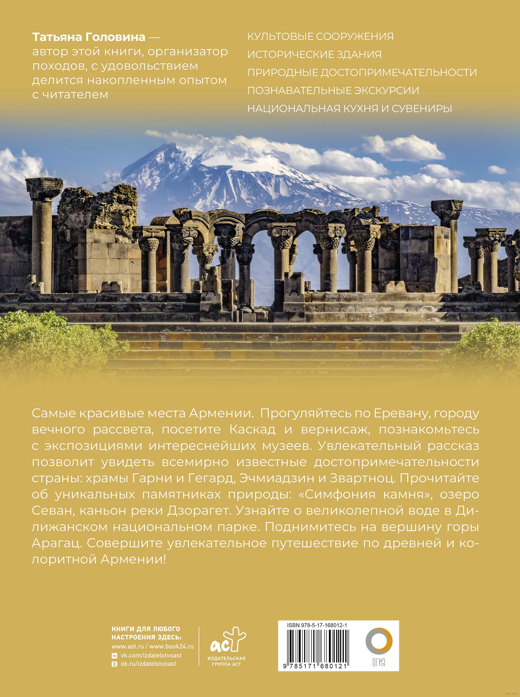 Самые красивые места Армении, древней и колоритной страны. Совершите прогулку по Еревану, городу вечного рассвета, посетите Каскад и вернисаж, познакомьтесь с экспозициями интересней-ших музеев. Увлекательный рассказ позволит увидеть всемирно известные достопримечательности Армении: храмы Гарни и Гегард, Эчмиадзин и Звартноц. Прочитайте об уникальных памятниках природы: "Симфония камня", озеро Севан, каньон реки Дзорагет. Узнайте о великолепной воде в Дилижанском национальном парке. Совершите подъем на вершину горы Арагац.