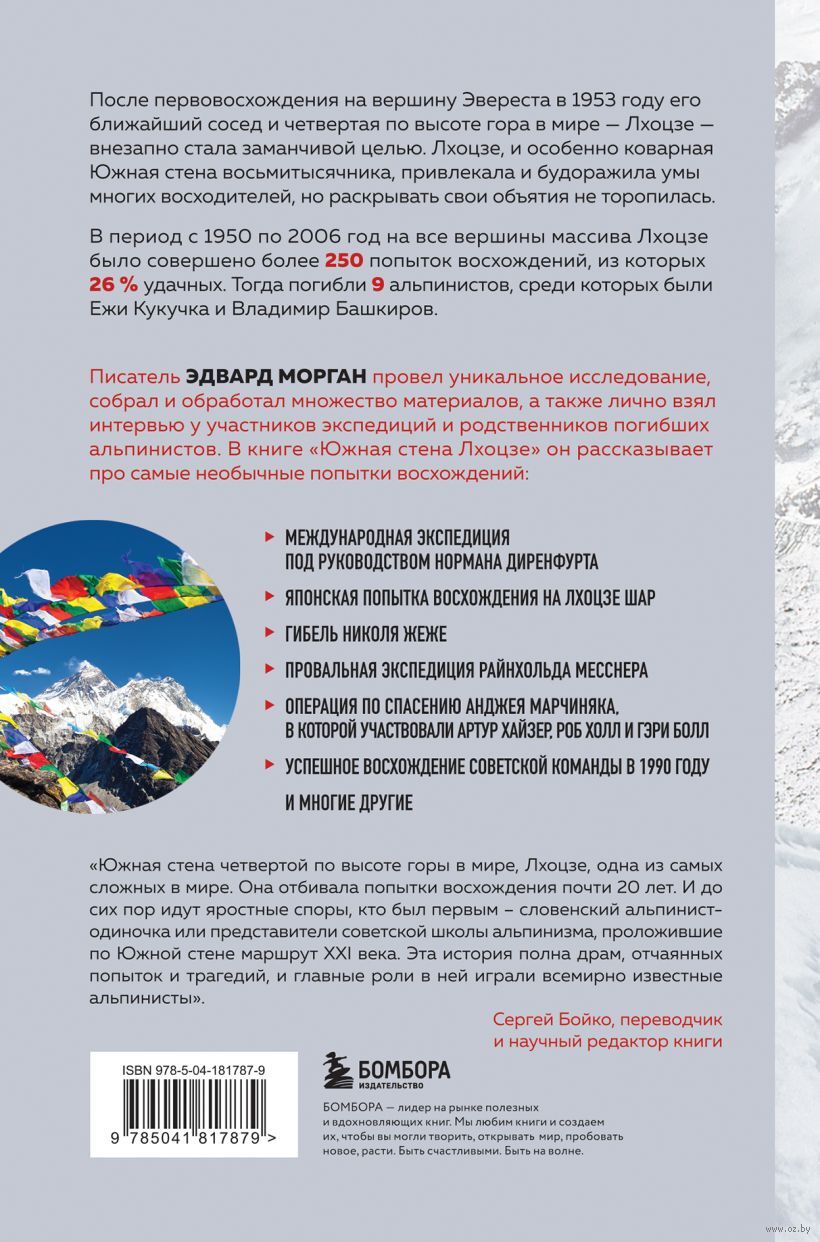 Множество альпинистов погибло при попытке взойти на Южную стену Лхоцзе. Восхождение на четвертый восьмитысячник мира является трудным испытанием и запредельной нагрузкой для организма. Но тех, кого зовут горы, это никогда не останавливало и навряд ли остановит. Автор, Эдвард Морган, провел уникальное исследование и реконструировал историю многих восхождений на Лхоцзе, взяв интервью у участников экспедиций и родственников погибших альпинистов. Эта увлекательная история будет интересна многим читателям, а неопубликованные ранее дневники и фотографии помогут прочувствовать все сложности, которые испытывали альпинисты.