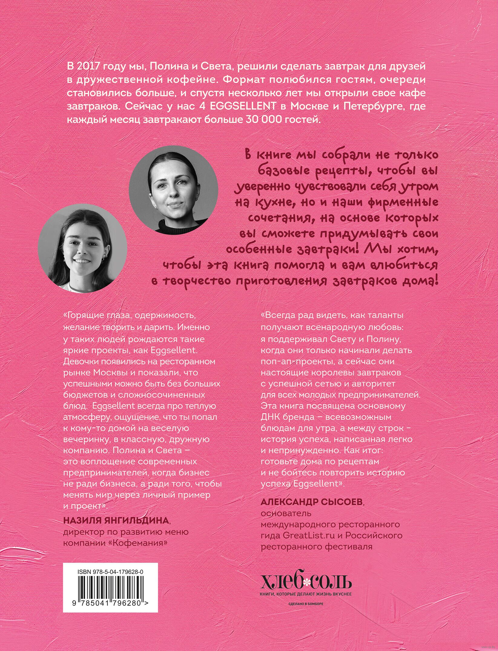 А вы готовите завтраки дома? Даже если нет, книга основательниц кафе EGGSELLENT Светланы Михалёвой и Полины Юровой точно вас вдохновит. Ведь просто невозможно устоять, глядя на мягчайшую утреннюю булочку со скремблом и беконом, овсянку качо-э-пепе или яркий матча-тост. Дополните их чашкой свежесваренного кофе – и вот она, красота и магия утра.