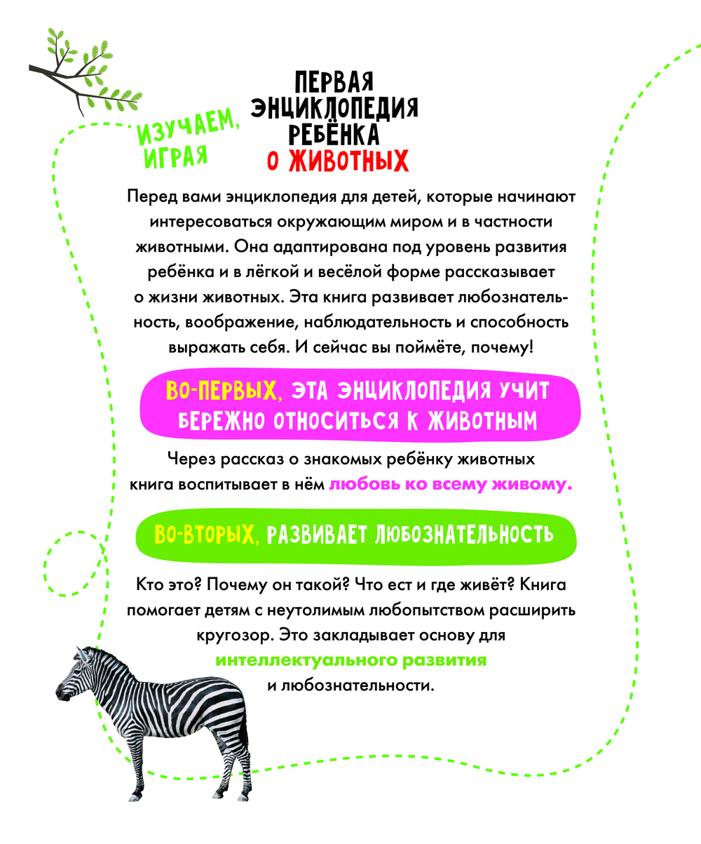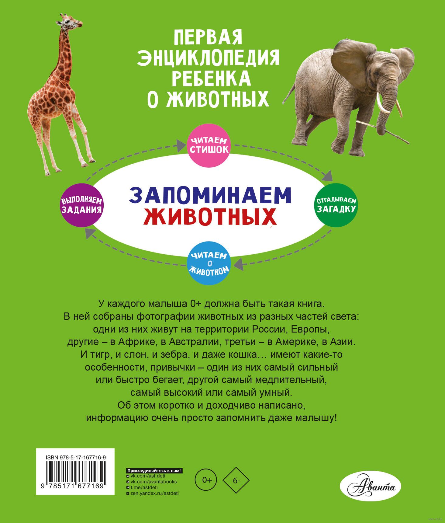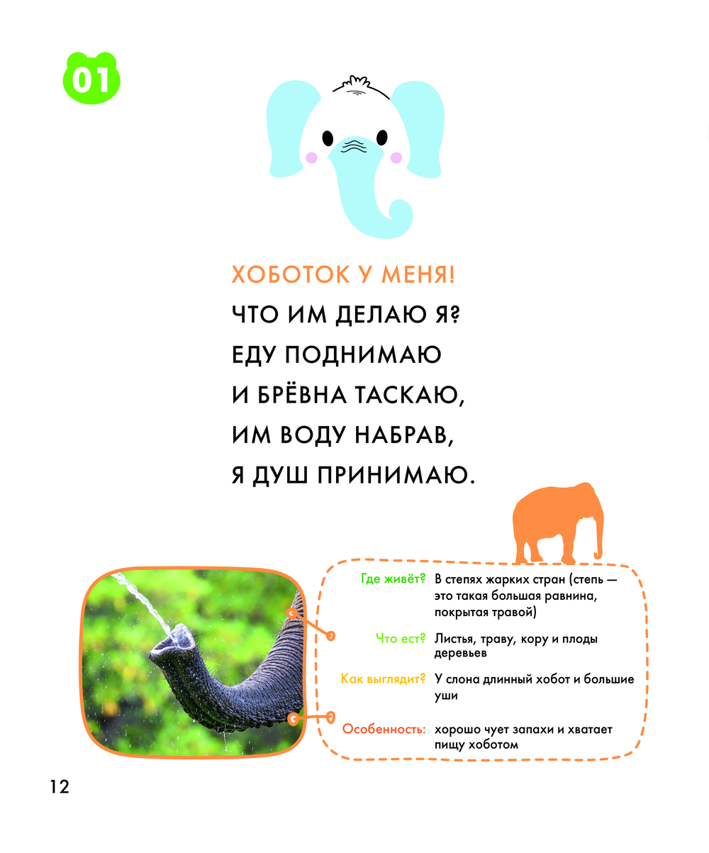 Эта книга – первая энциклопедия ребёнка о животных. В лёгкой и весёлой форме она расскажет о том, где живут, чем питаются и что любят делать разные животные. Запомнить, чем примечателен тот или иной представитель фауны, ребёнку помогут стихи, подчёркивающие его характерные черты и особенности внешности. А яркие картинки и викторины в конце книги точно не дадут заскучать и сделают чтение ещё более увлекательным!