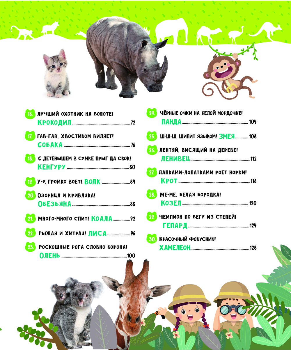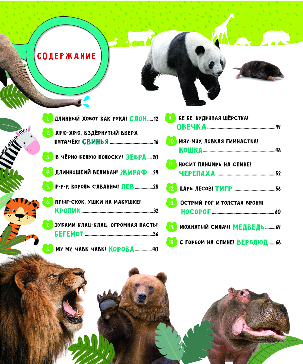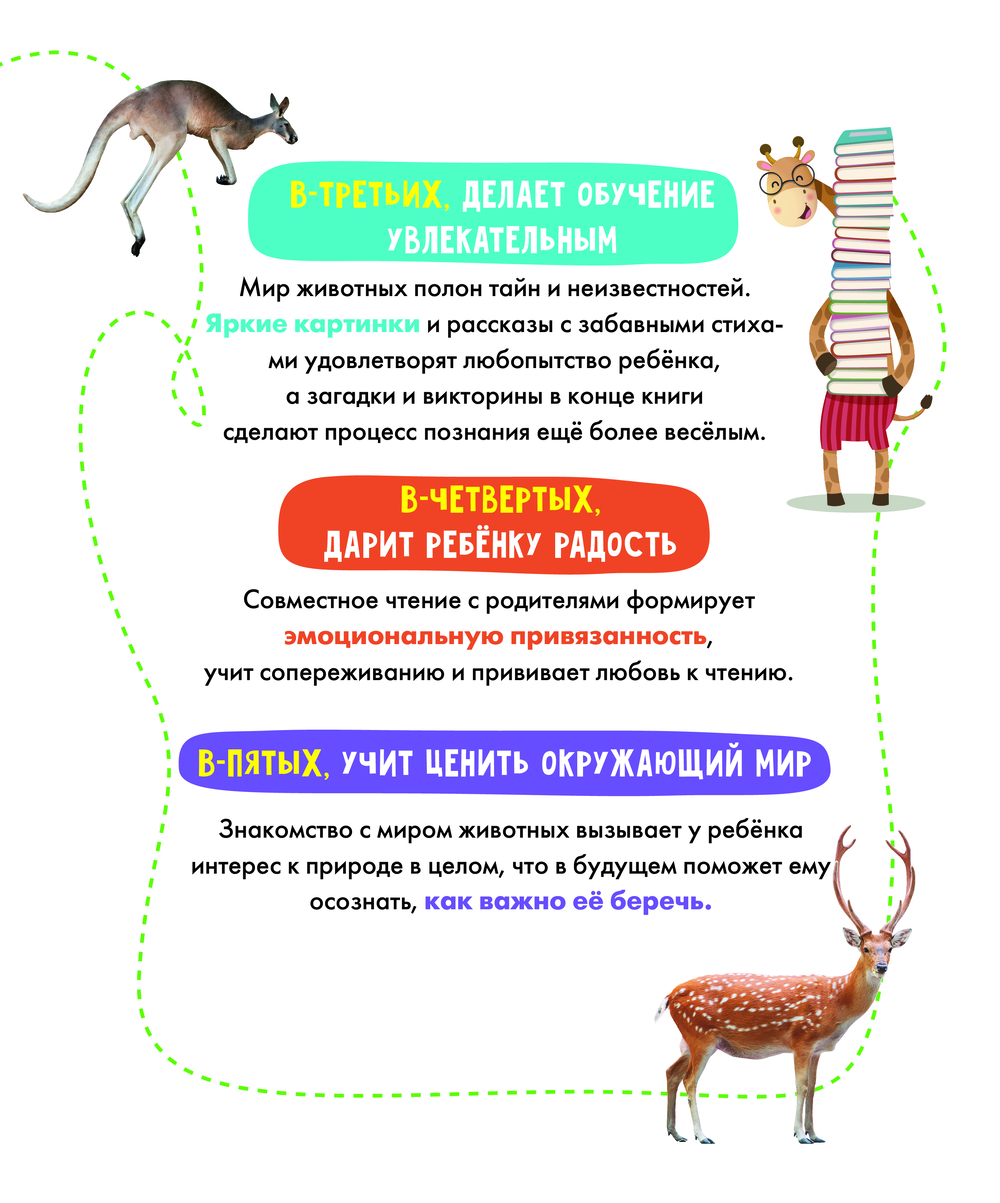 Эта книга – первая энциклопедия ребёнка о животных. В лёгкой и весёлой форме она расскажет о том, где живут, чем питаются и что любят делать разные животные. Запомнить, чем примечателен тот или иной представитель фауны, ребёнку помогут стихи, подчёркивающие его характерные черты и особенности внешности. А яркие картинки и викторины в конце книги точно не дадут заскучать и сделают чтение ещё более увлекательным!