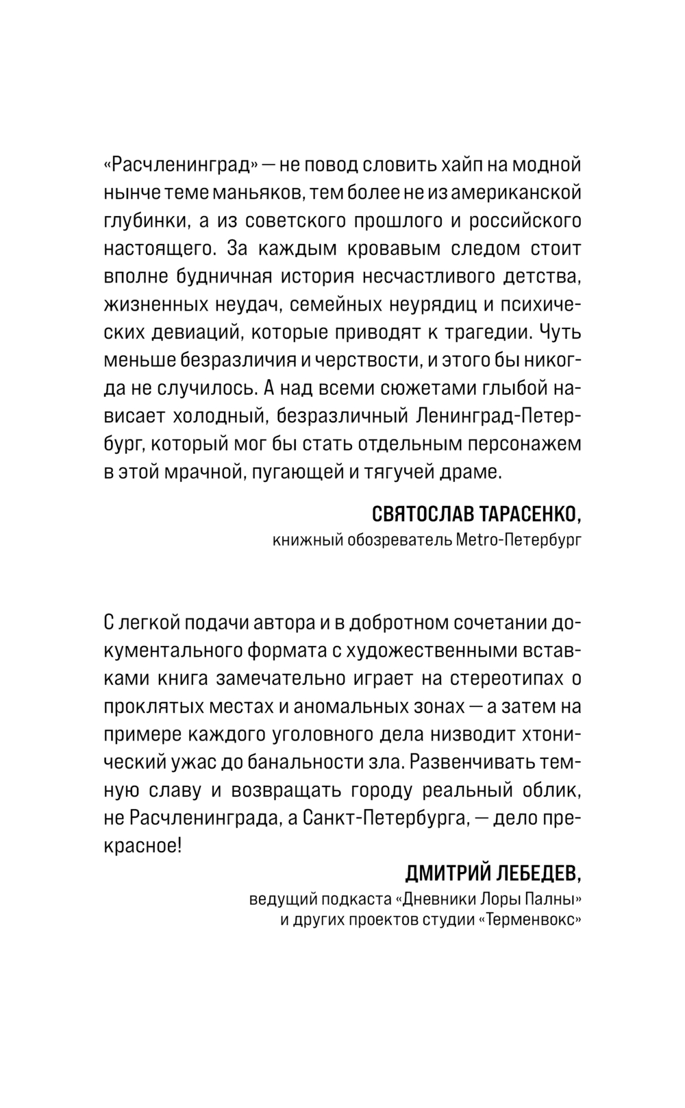 "Известный историк, экcперт по Наполеону, принес к реке рюкзак с руками любимой женщины". "Жена расчленила тело мужа, чтобы поклонники помнили о нем только хорошее...". Благодаря череде кровавых и шокирующих событий, описанных в этой книге, Петербург-Петроград-Ленинград приобрел четвертое, "народное", название – Расчленинград.
