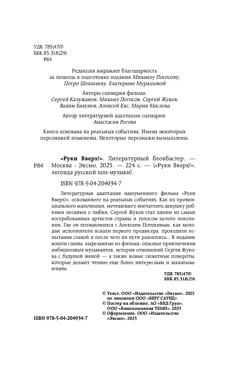 В издание вошли сцены, вырезанные из фильма: опасные приключения амбициозных музыкантов, история отношений Сергея Жукова с будущей женой, – а также новые сюжетные повороты, которые делают чтение еще более интересным и захватывающим.