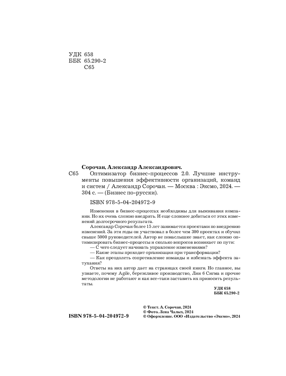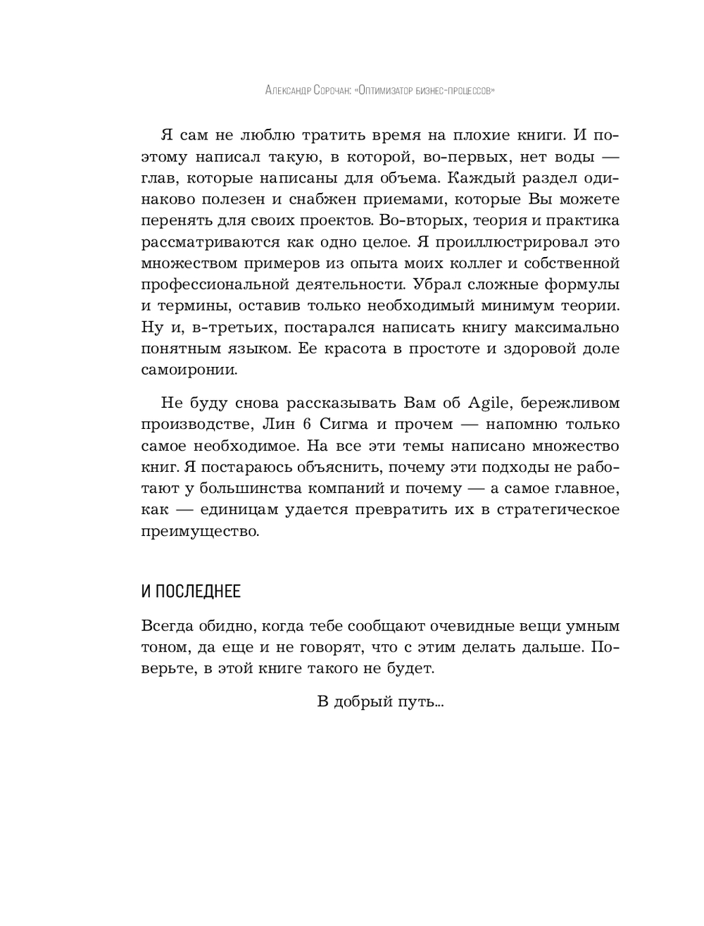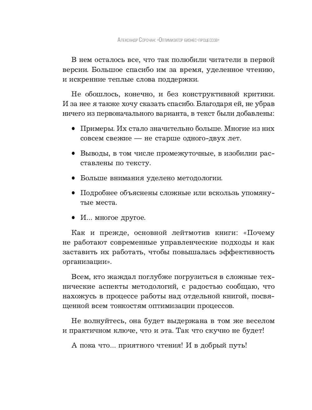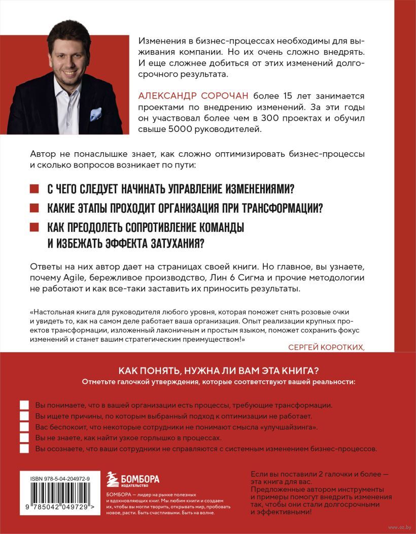Александр Сорочан более 15 лет занимается проектами по внедрению изменений. За эти годы он участвовал более чем в 300 проектах и обучил свыше 5000 руководителей. Автор не понаслышке знает, как сложно оптимизировать бизнес-процессы и сколько вопросов возникает по пути.