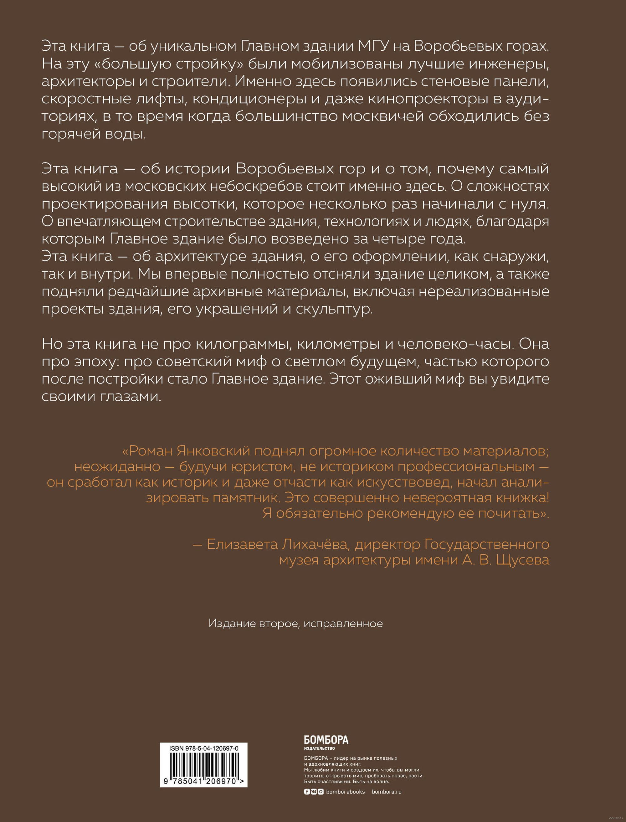 Вы держите в руках первую иллюстрированную книгу о Главном здании МГУ. Автор проекта Роман Янковский провел масштабную кампанию, в ходе которой ему удалось собрать огромное количество архивных материалов, схем и рассказов жителей города.
