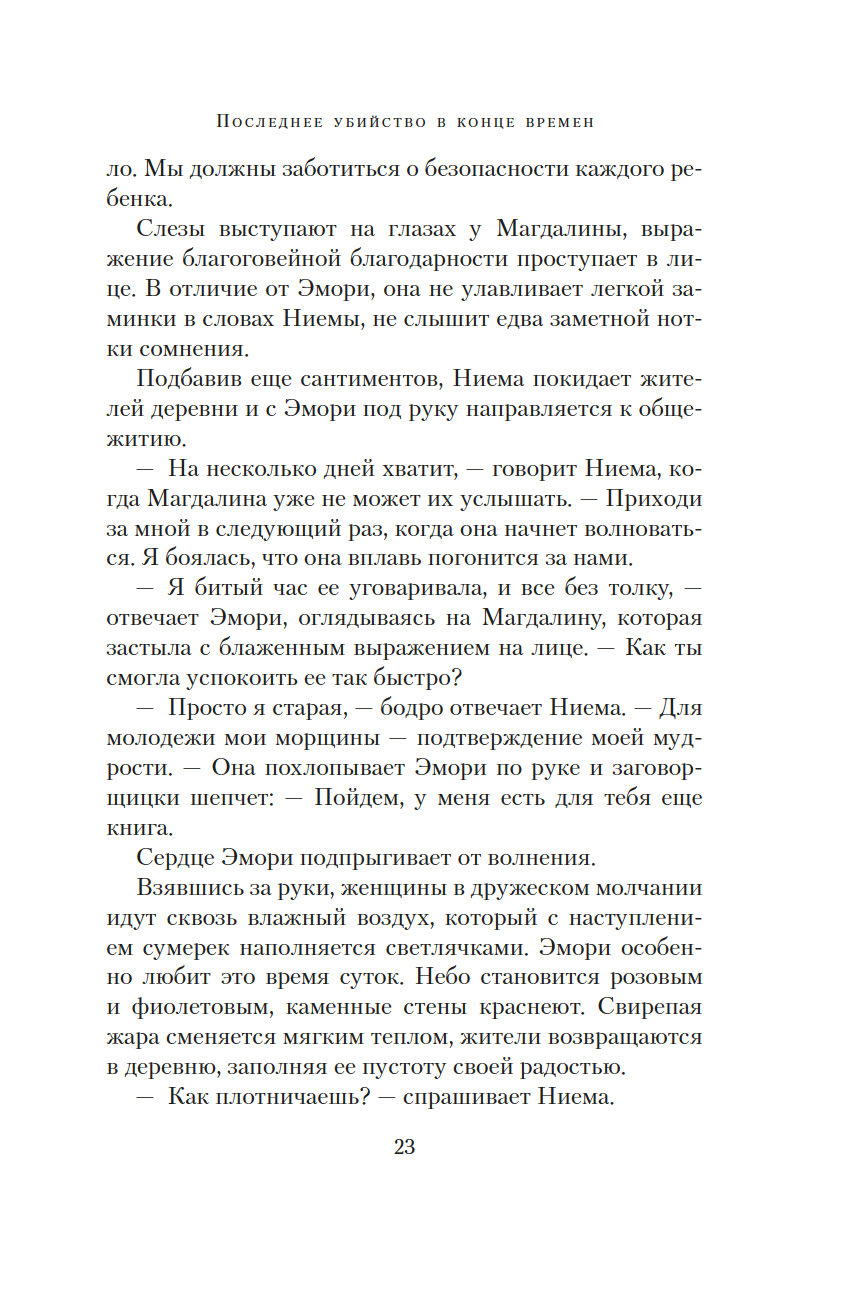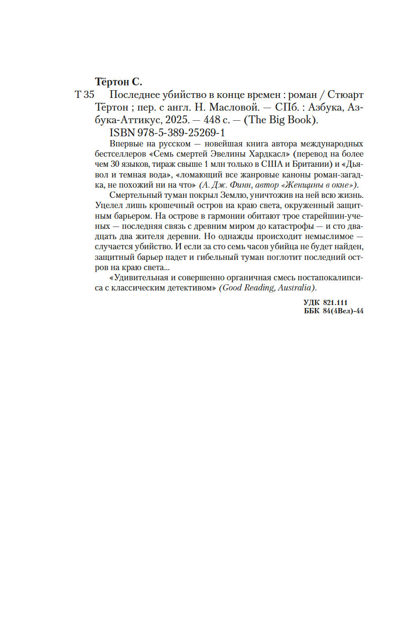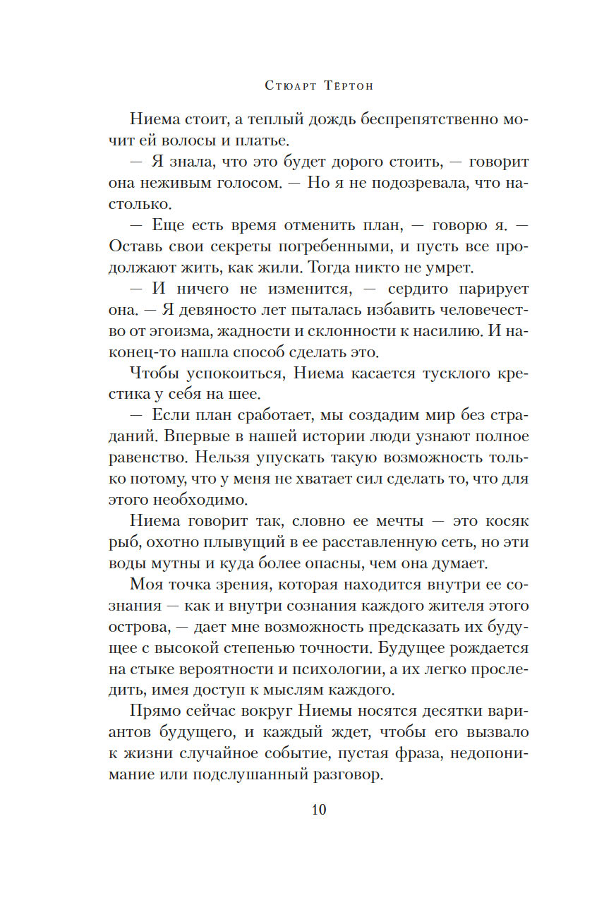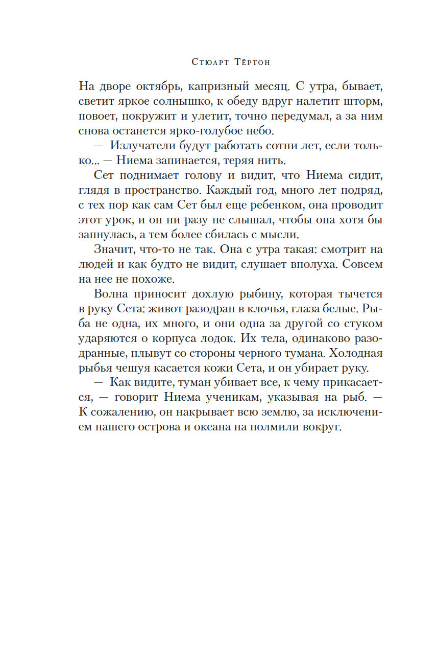 Смертельный туман покрыл Землю, уничтожив на ней всю жизнь. Уцелел лишь крошечный остров на краю света, окруженный защитным барьером. На острове в гармонии обитают трое старейшин-ученых – последняя связь с древним миром до катастрофы – и сто двадцать два жителя деревни. Но однажды происходит немыслимое – случается убийство. И если за сто семь часов убийца не будет найден, защитный барьер падет и гибельный туман поглотит последний остров на краю света...