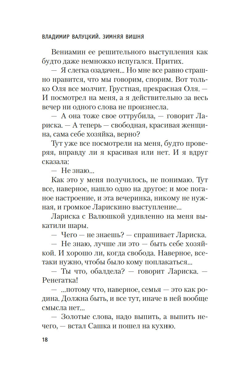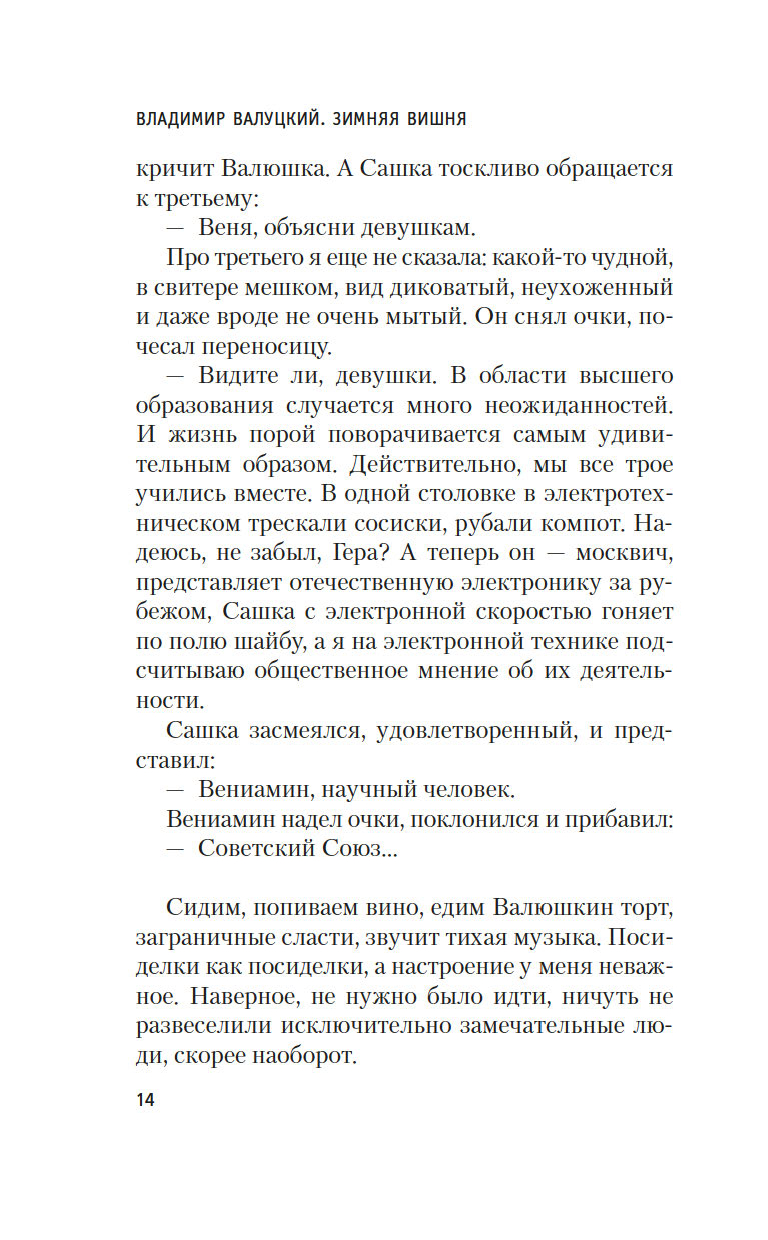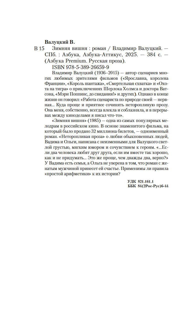 "Зимняя вишня" (1985) – одна из самых популярных мелодрам в российском кино. В основе знаменитого фильма, на который было продано 32 миллиона билетов, – одноименный роман. "Неторопливая проза" о любви обыкновенных людей, Вадима и Ольги, написана с неизменными для Валуцкого светлой грустью, мягким юмором и сочувствием к героям. "...Если два человека любят друг друга, если им вместе так хорошо, как и не придумать... Это же проще, чем дважды два, верно?" У Вадима есть семья, а Ольга не уверена в том, что роман с женатым мужчиной принесет ей счастье. Применимы ли правила "простой арифметики" к их истории?