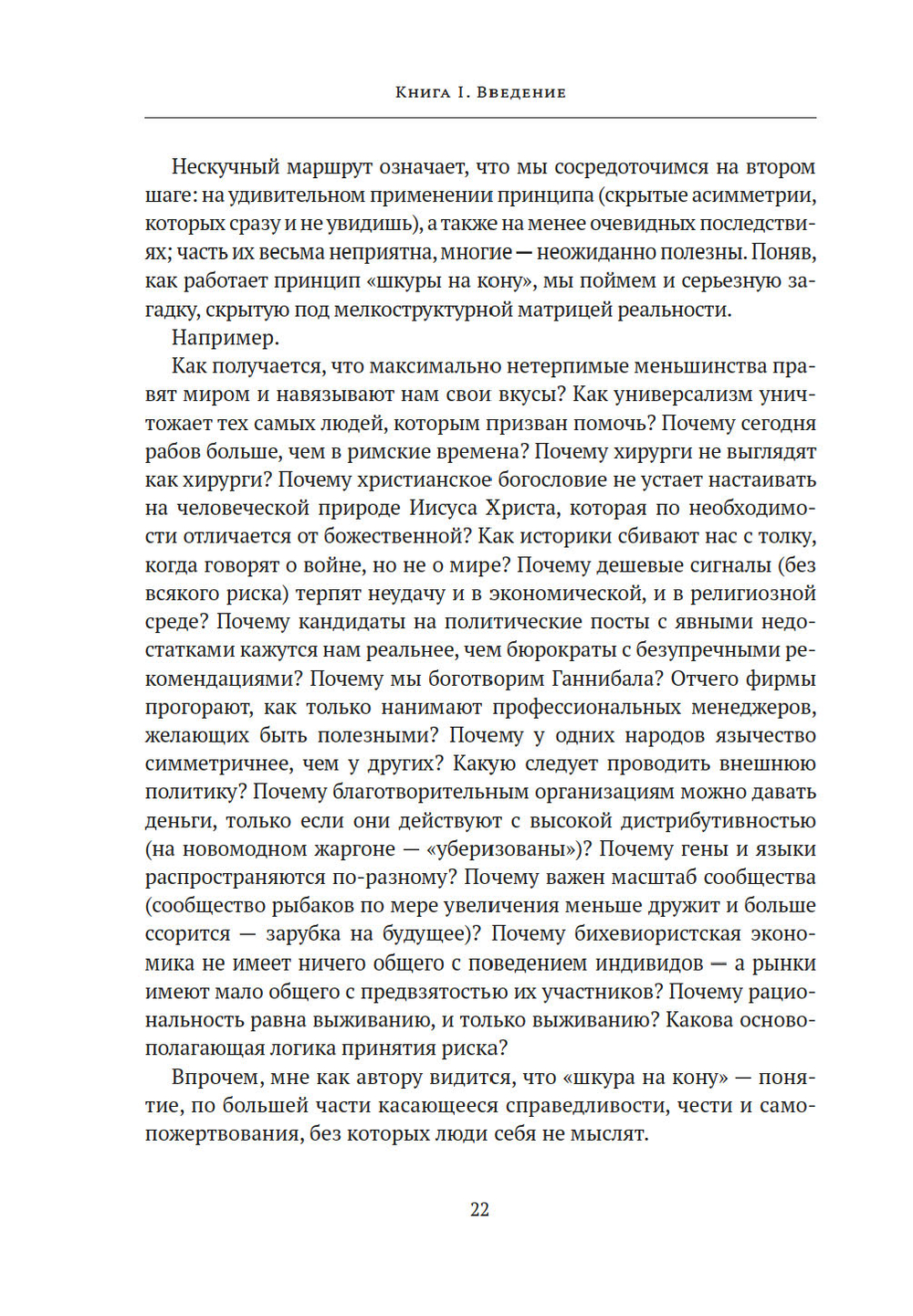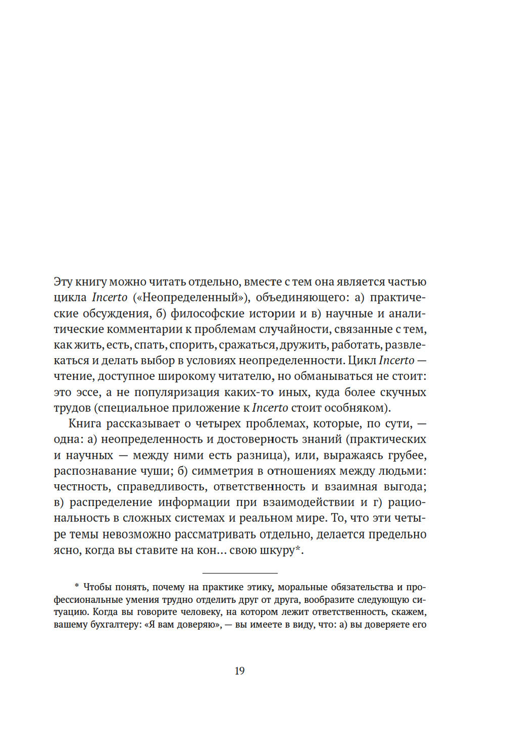 В своей резко провокационной и одновременно предельно прагматичной книге неподражаемый Нассим Талеб рассказывает, как важно идентифицировать и фильтровать чушь, отличать теорию от практики, поверхностную компетентность от настоящей. Вы узнаете, что такое рациональность в сложных системах и реальном мире, симметрия и асимметрия и в чем состоит логика принятия рисков. Наполняя новым смыслом привычные понятия, такие как "справедливое общество", "профессиональный успех", "личная ответственность", и не боясь задеть эго признанных кумиров, Талеб развенчивает лицемерие идеологов военных интервенций в Ирак и Ливию; фиаско нобелевских лауреатов по экономике, разоривших банки и инвестиционные фонды; лживых религиозных проповедников. На примерах Хаммурапи и Иисуса Христа, римских и византийских императоров, философов-стоиков и современных успешных бизнесменов Талеб показывает, что главное качество, объединяющее их всех, – "ставить на кон свою шкуру и душу", а не переносить риск на других.