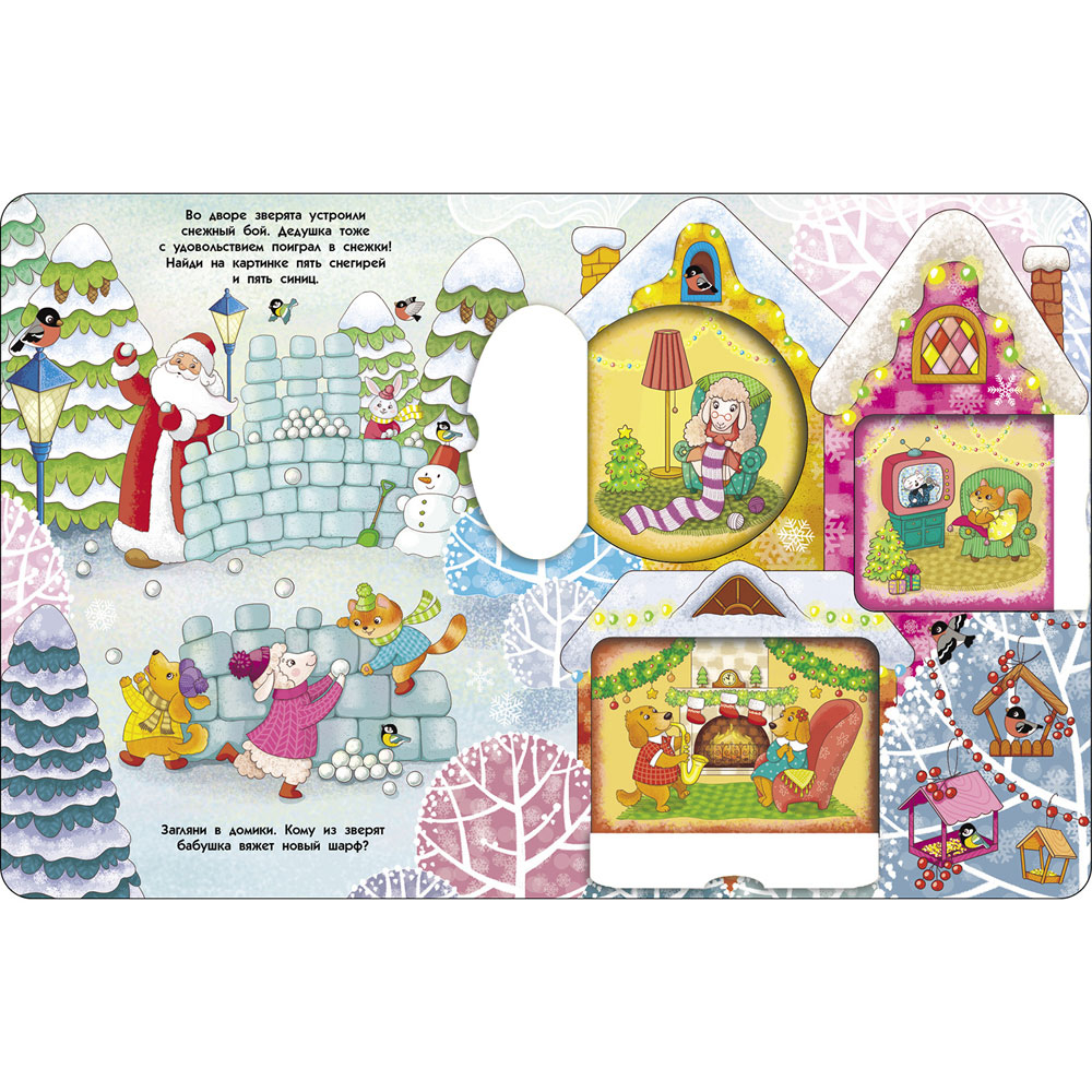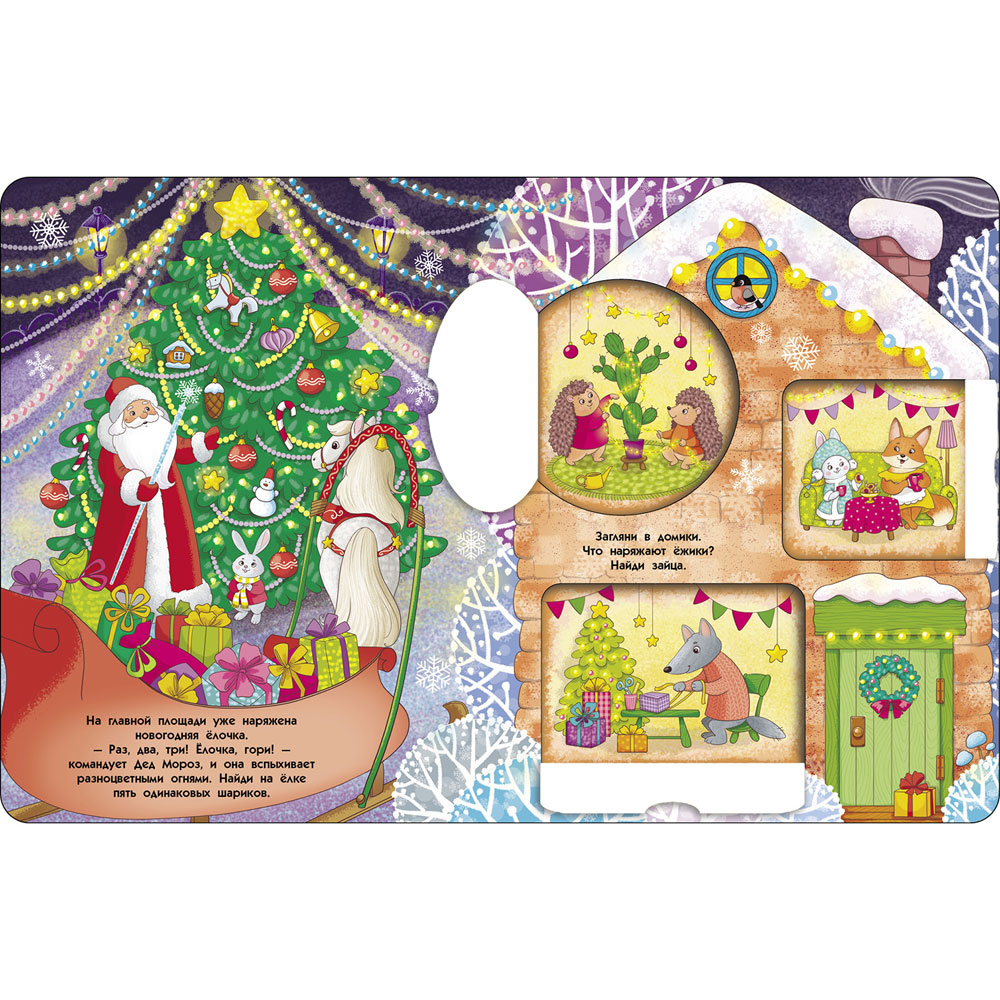 Скоро Новый год. Давайте посмотрим, как зверюшки готовятся к празднику. На каждом развороте вас ждут окошки с заданиями. Попросите малыша открыть их и ответить на вопросы. Игра будет невероятно весёлой!