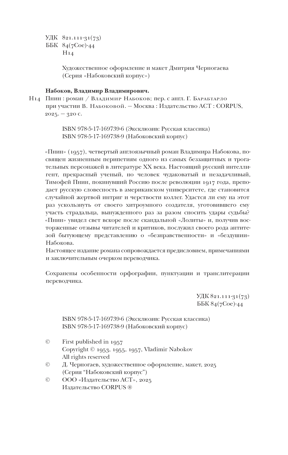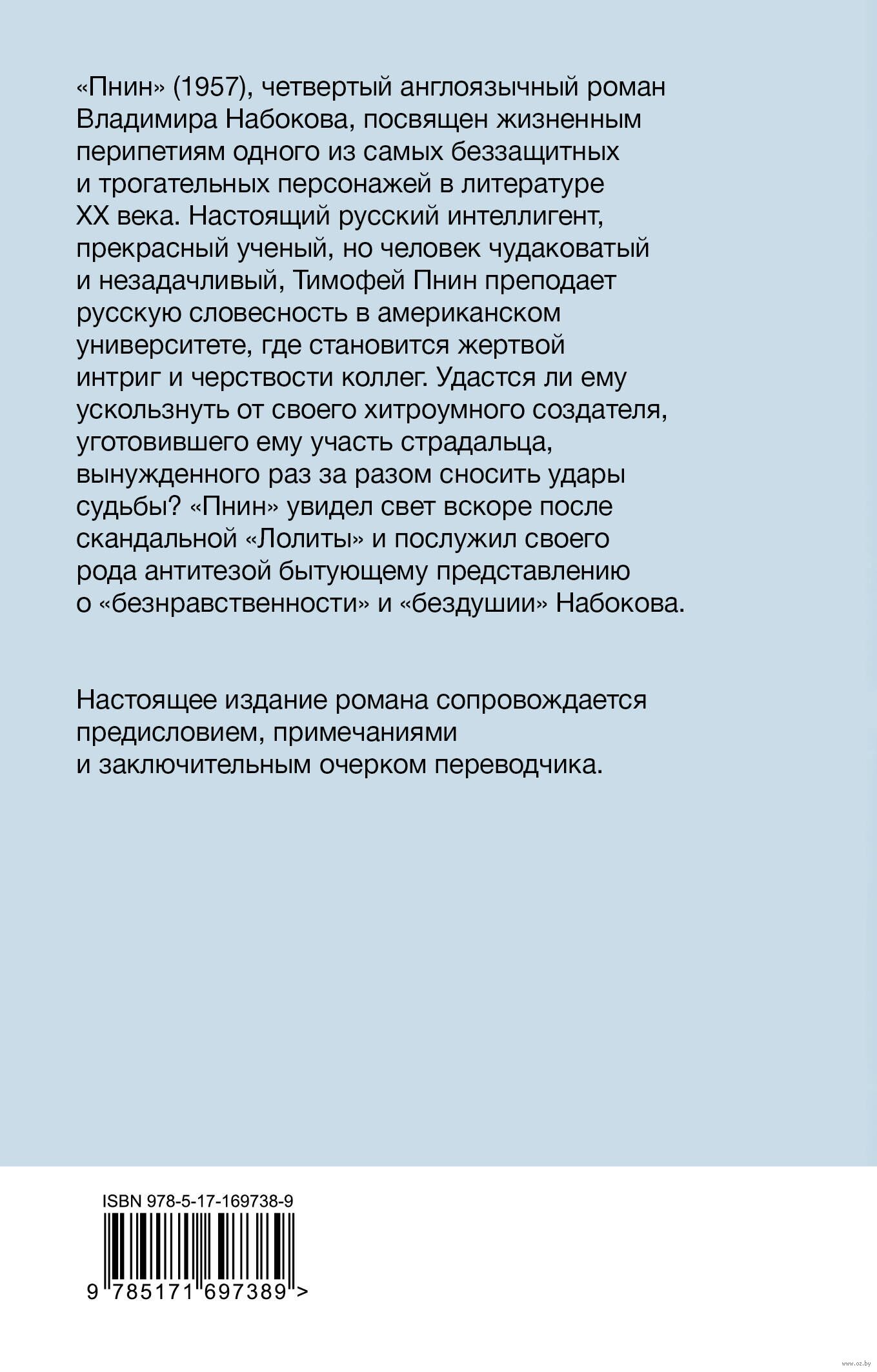 "Пнин" (1957), четвертый англоязычный роман Владимира Набокова, посвящен жизненным перипетиям одного из самых беззащитных и трогательных персонажей в литературе XX века. Настоящий русский интеллигент, прекрасный ученый, но человек чудаковатый и незадачливый, Тимофей Пнин, покинувший Россию после революции 1917 года, преподает русскую словесность в американском университете, где становится случайной жертвой интриг и черствости коллег. Удастся ли ему на этот раз ускользнуть от своего хитроумного создателя, уготовившего ему участь страдальца, вынужденного раз за разом сносить удары судьбы?