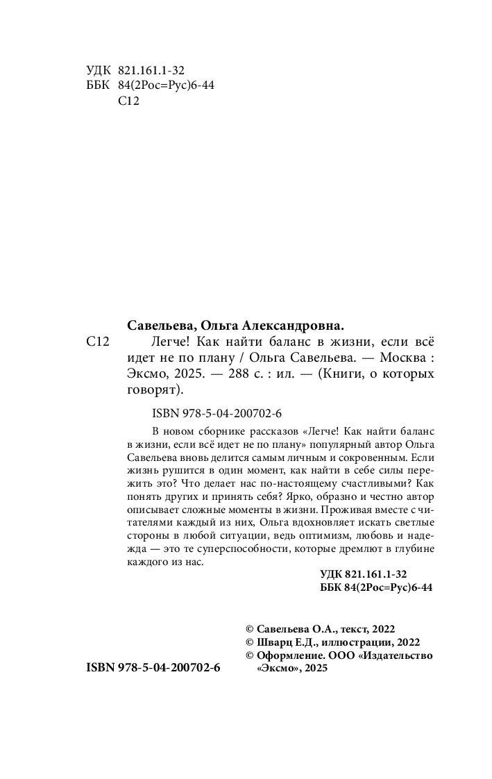 В новом сборнике рассказов "Легче! Как найти баланс в жизни, если всё идет не по плану" популярный автор Ольга Савельева вновь делится самым личным и сокровенным. Если жизнь рушится в один момент, как найти в себе силы пережить это? Что делает нас по-настоящему счастливыми? Как понять других и принять себя? Ярко, образно и честно автор описывает сложные моменты в жизни. Проживая вместе с читателями каждый из них, Ольга вдохновляет искать светлые моменты в любой ситуации, ведь оптимизм, любовь и надежда – это те суперспособности, которые дремлют в глубине каждого из нас.