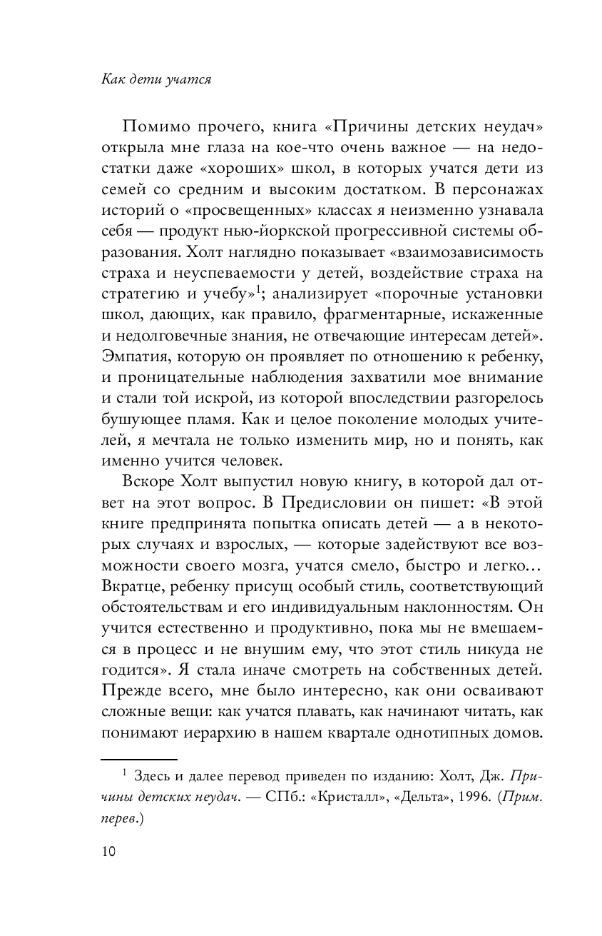 Педагог раскрывает особенности мышления дошкольников и детей младших классов, рассказывает, как привить любовь к знаниям и не убить мотивацию ребенка, которая есть в нем от природы. Джон Холт наглядно показывает, какие стратегии будут полезны для первых шагов в подготовке к школе и в начальных классах. Он раскрывает системные ошибки и помогает дать лучшее образование детям. Его методику можно использовать параллельно со школьной программой.