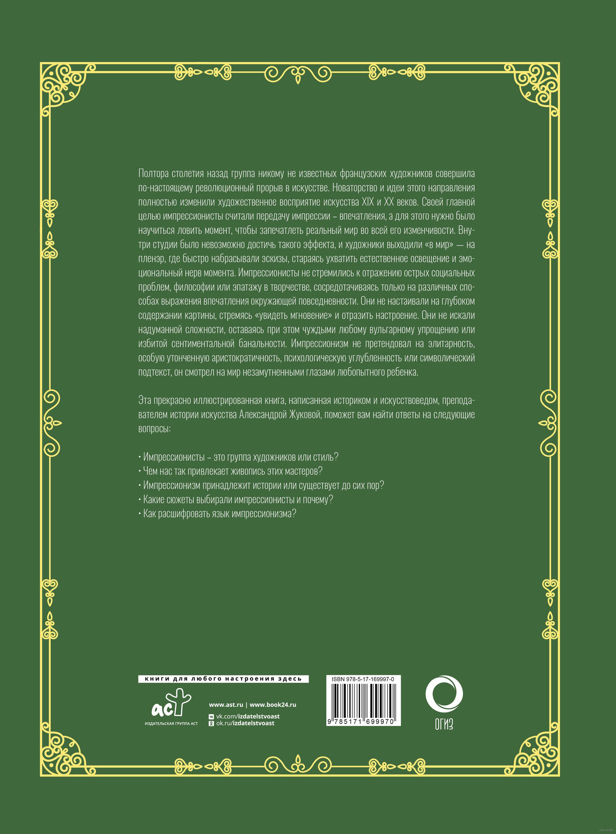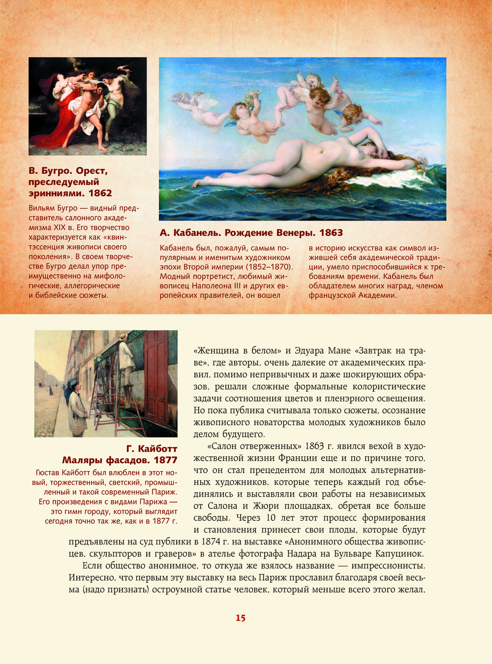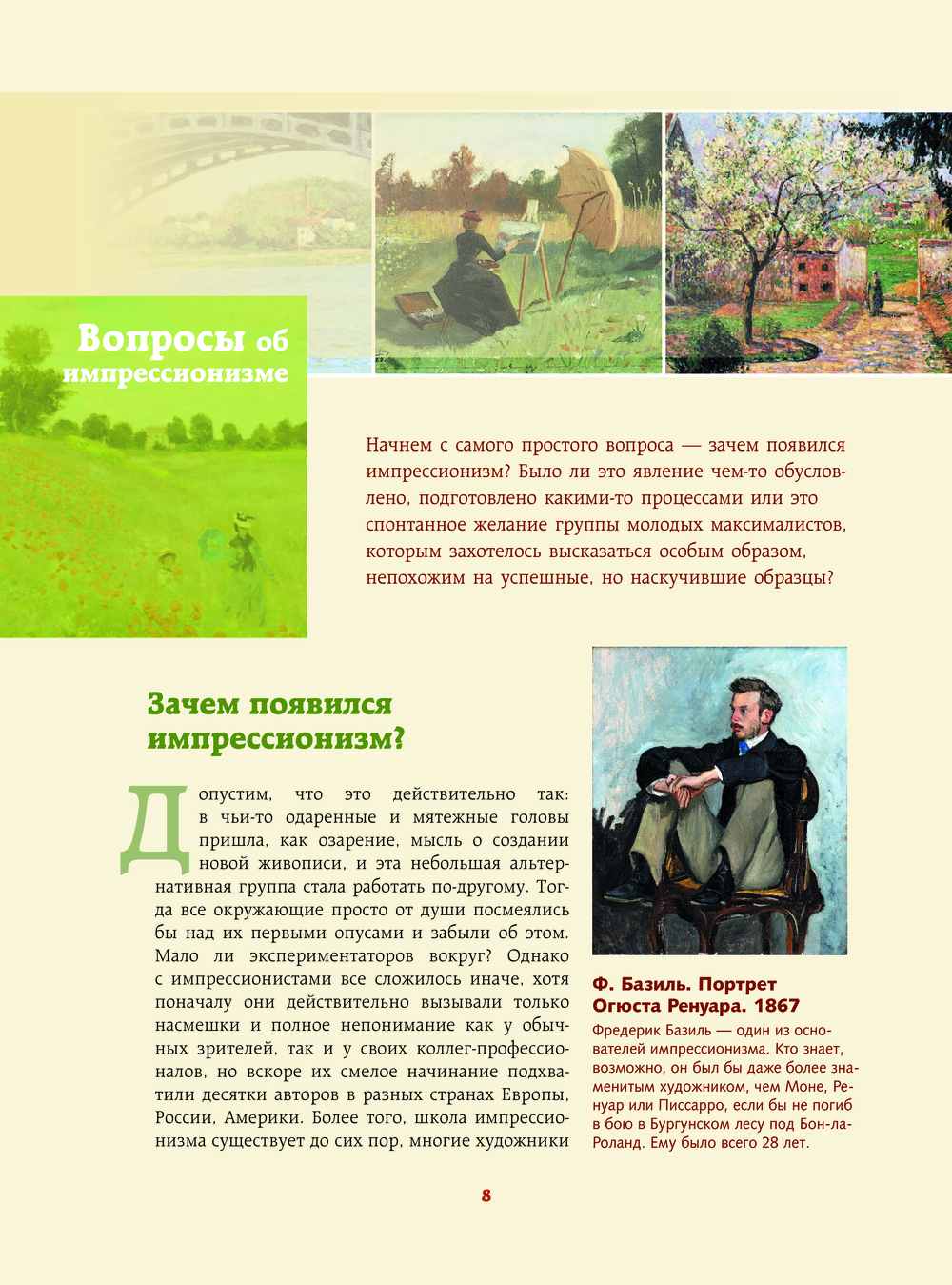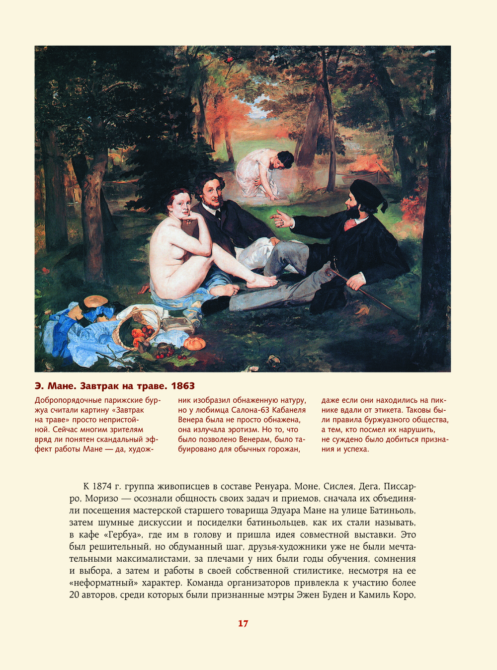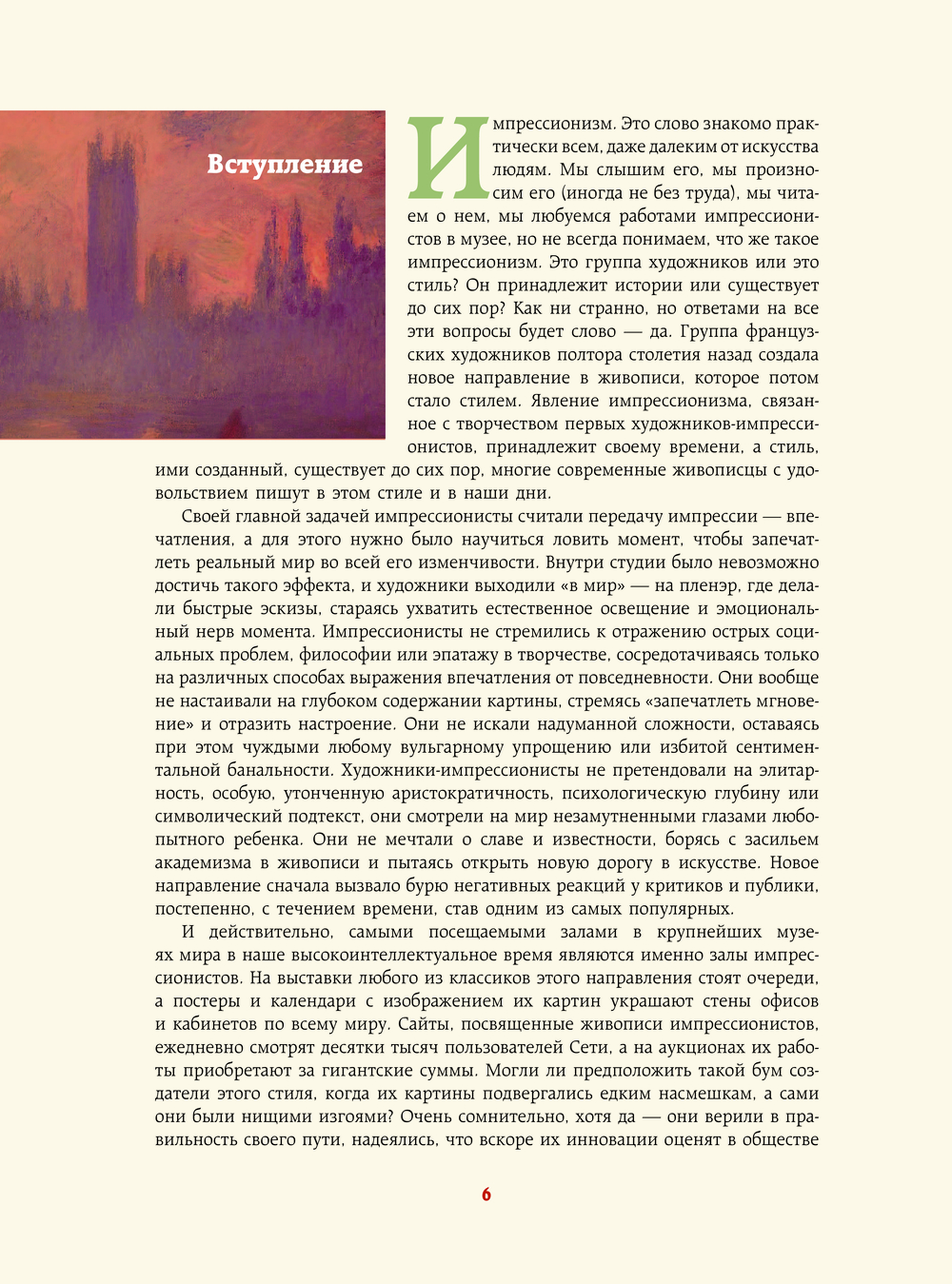 Полтора столетия назад группа никому не известных французских художников совершила по-настоящему революционный прорыв в искусстве. Новаторство и идеи этого направления полностью изменили художественное восприятие искусства XIX и XX веков. Своей главной целью импрессионисты считали передачу импрессии – впечатления, а для этого нужно было научиться ловить момент, чтобы запечатлеть реальный мир во всей его изменчивости. Внутри студии было невозможно достичь такого эффекта, и художники выходили "в мир" – на пленэр, где быстро набрасывали эскизы, стараясь ухватить естественное освещение и эмоциональный нерв момента. Импрессионисты не стремились к отражению острых социальных проблем, философии или эпатажу в творчестве, сосредотачиваясь только на различных способах выражения впечатления окружающей повседневности.