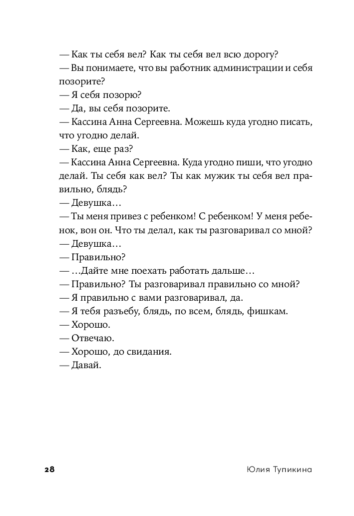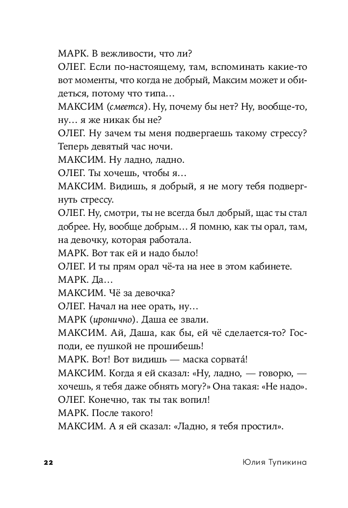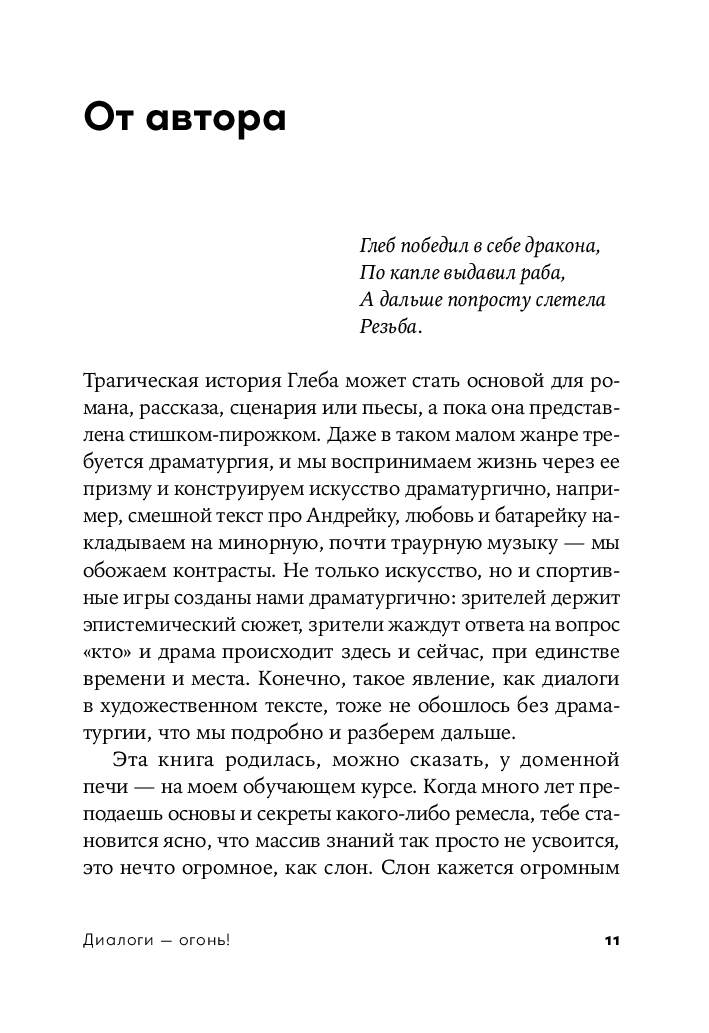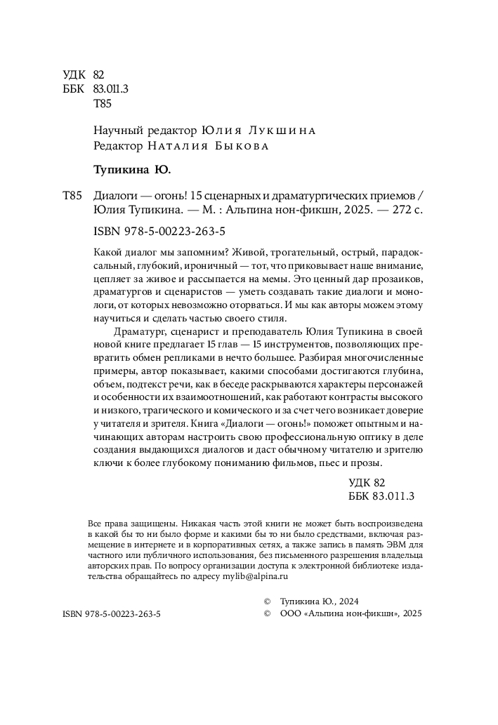 Драматург, сценарист и преподаватель Юлия Тупикина в своей новой книге предлагает 15 глав – 15 инструментов, позволяющих превратить обмен репликами в нечто большее. Разбирая многочисленные примеры, автор показывает, какими способами достигаются глубина, объем, подтекст речи, как в беседе раскрываются характеры персонажей и особенности их взаимоотношений, как работают контрасты высокого и низкого, трагического и комического и за счет чего возникает доверие у читателя и зрителя. Книга "Диалоги – огонь!" поможет опытным и начинающих авторам настроить свою профессиональную оптику в деле создания выдающихся диалогов и даст обычному читателю и зрителю ключи к более глубокому пониманию фильмов, пьес и прозы.