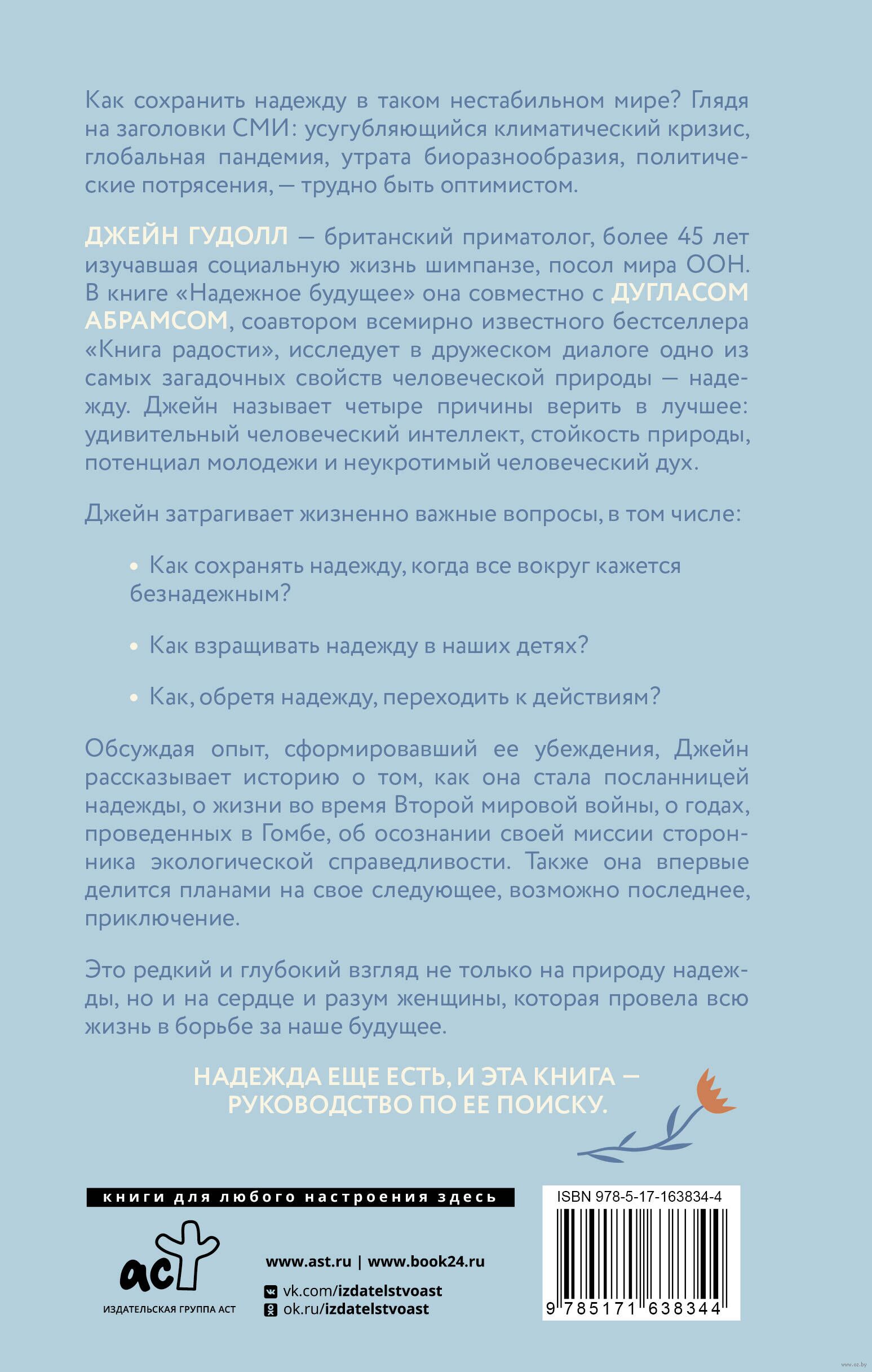 Джейн Гудолл – британский приматолог, более 45 лет изучавшая социальную жизнь шимпанзе, посол мира ООН. В книге "Надежное будущее" она совместно с Дугласом Абрамсом, соавтором всемирно известного бестселлера "Книга радости", исследует в дружеском диалоге одно из самых загадочных свойств человеческой природы – надежду. Джейн называет четыре причины верить в лучшее: удивительный человеческий интеллект, стойкость природы, потенциал молодежи и неукротимый человеческий дух.