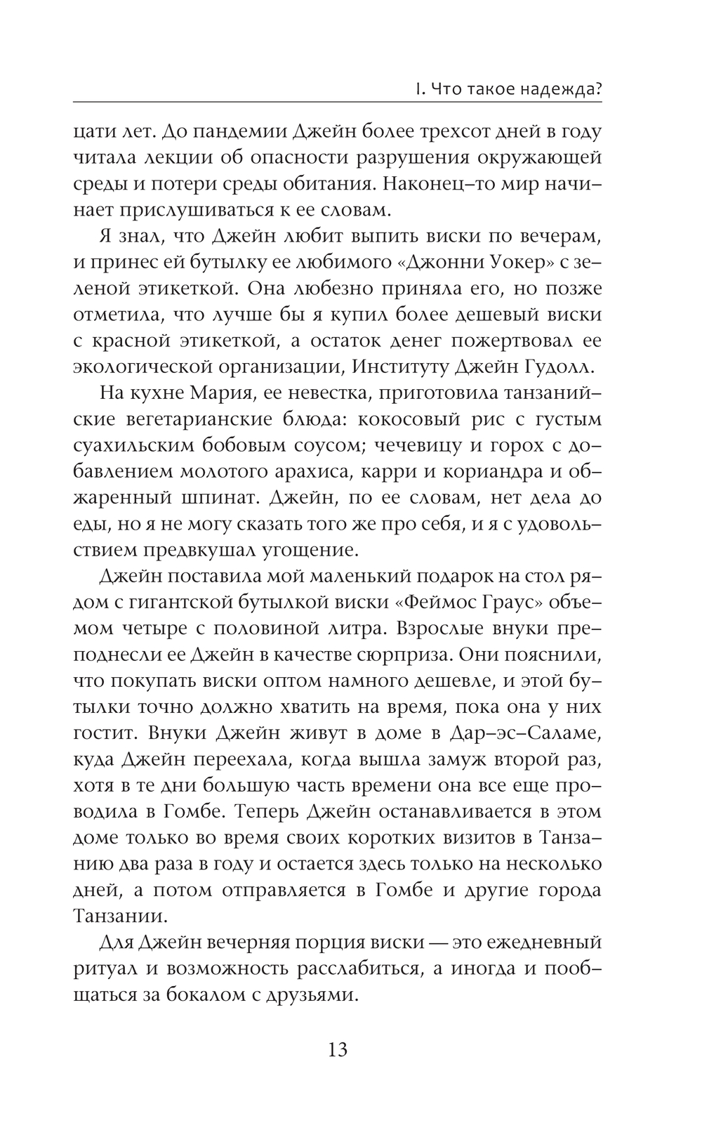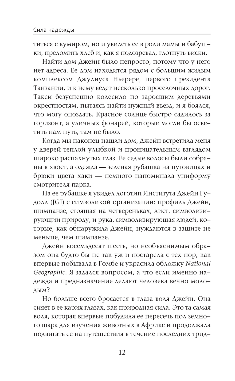 Обсуждая опыт, сформировавший ее убеждения, Джейн рассказывает историю о том, как она стала посланницей надежды, о жизни во время Второй мировой войны, о годах, проведенных в Гомбе, об осознании своей миссии сторонника экологической справедливости. Также она впервые делится планами на свое следующее, возможно последнее, приключение.