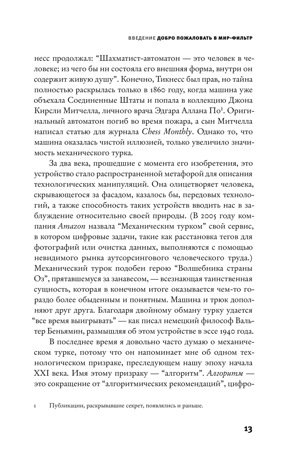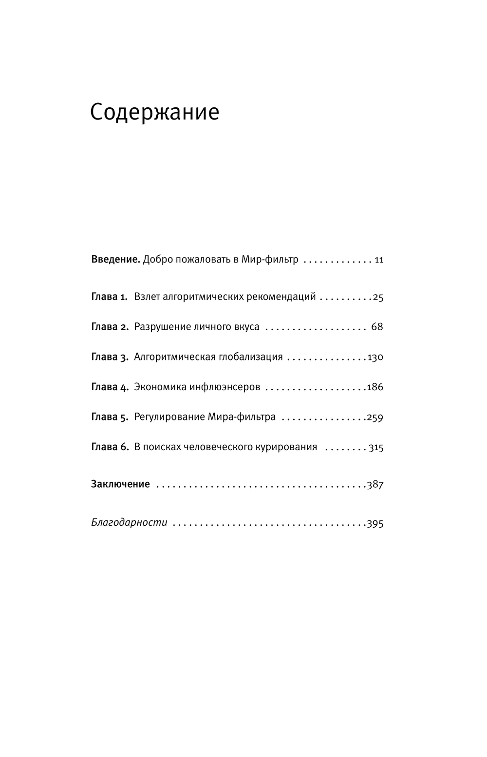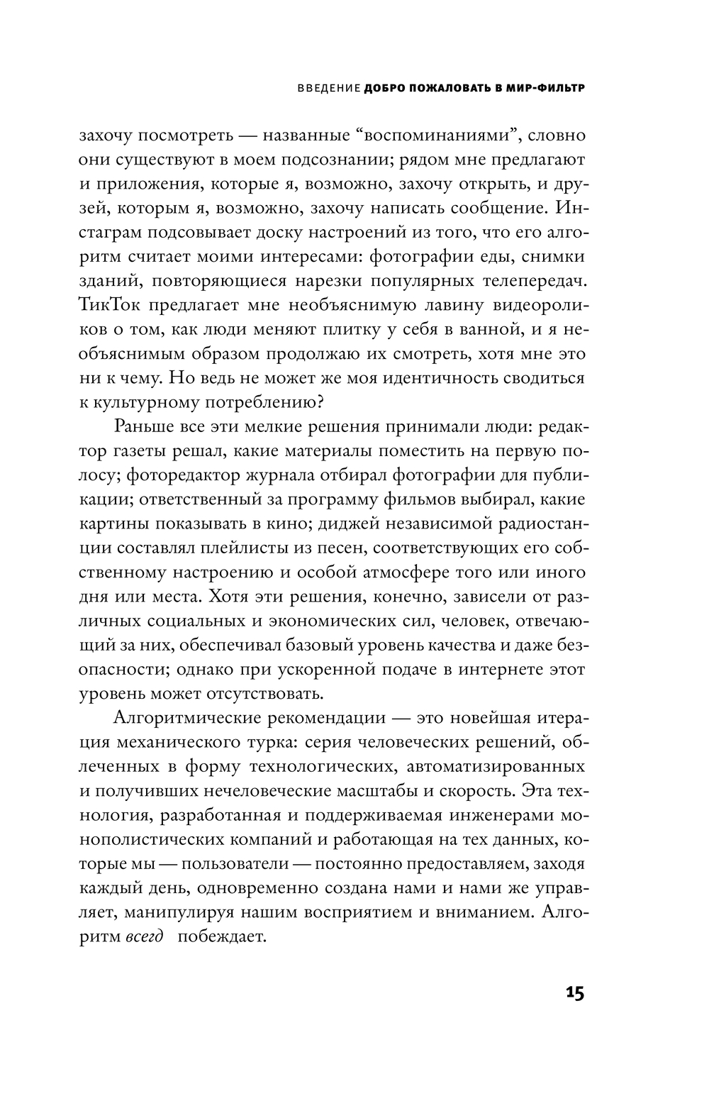 Журналист Кайл Чейка дает читателю увлекательный экскурс в историю появления и развития алгоритмической подачи информации, рассказывает о сегодняшних реалиях, в которых она играет принципиальную роль для нашей культуры, о плюсах и минусах такого положения дел, а также предлагает осознанные решения, которые помогут сохранить свое собственное "я" в эпоху алгоритмов.