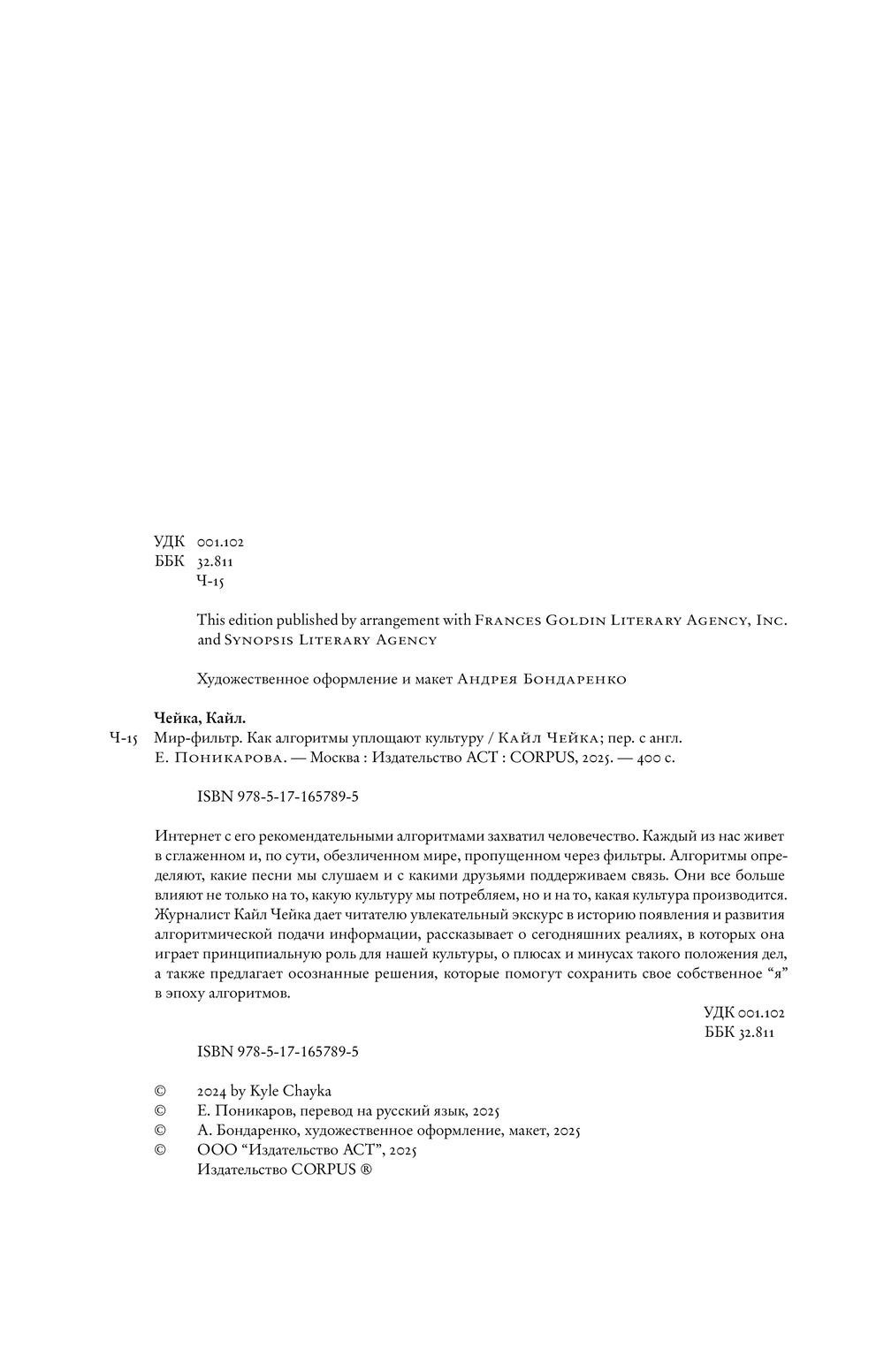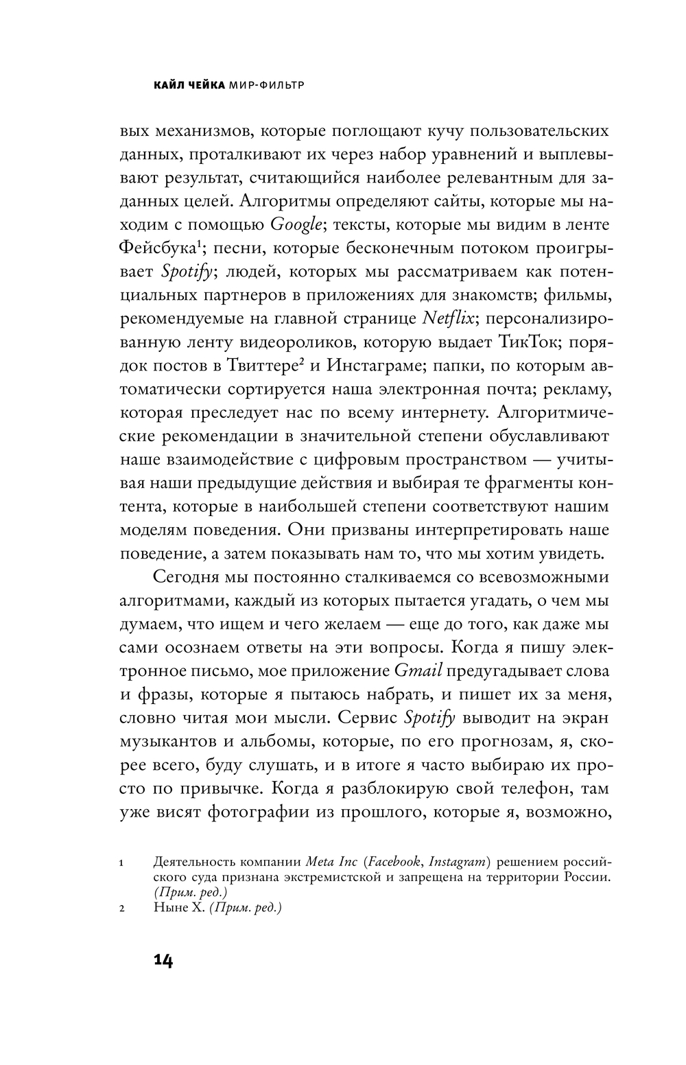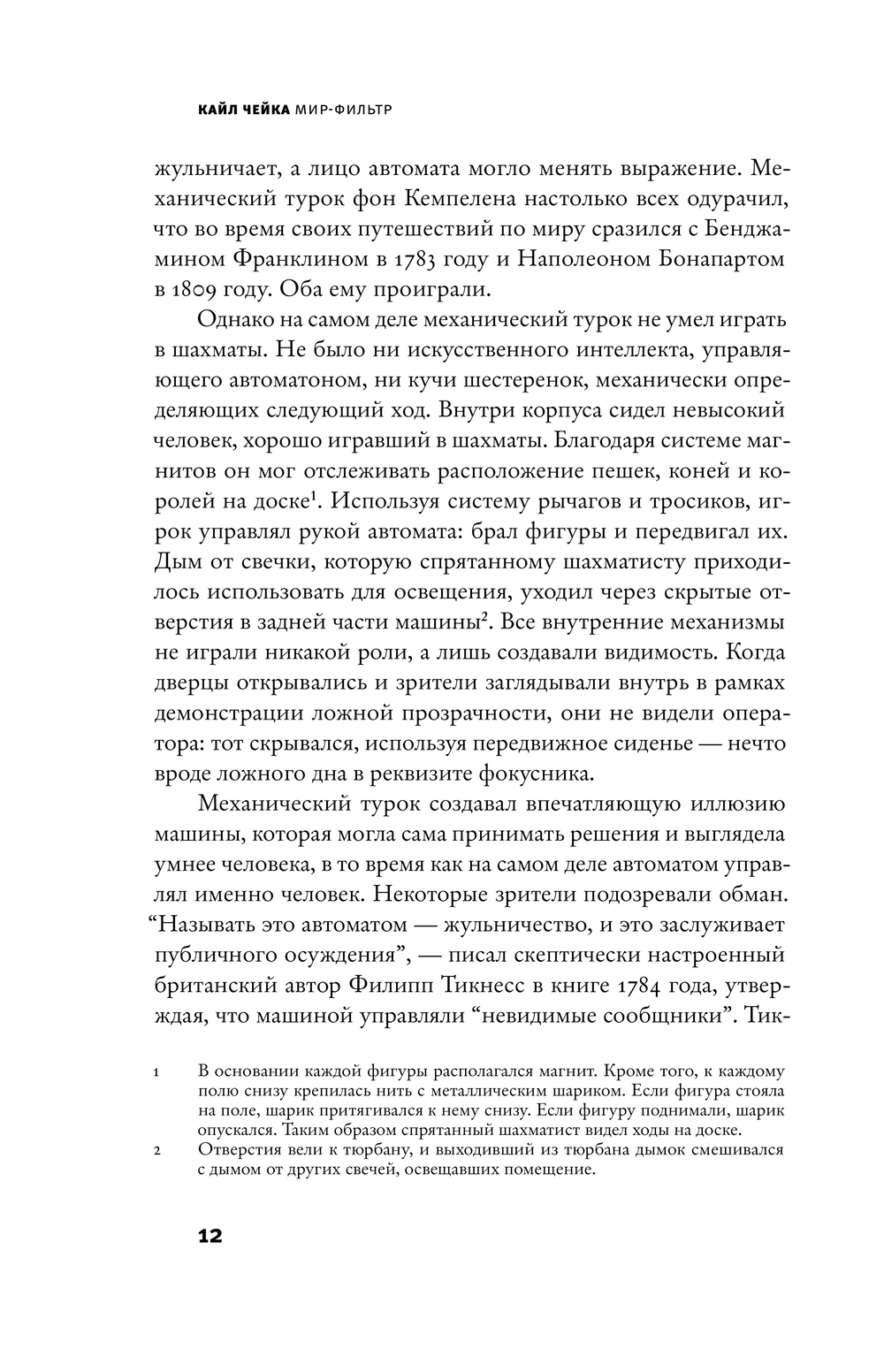 Журналист Кайл Чейка дает читателю увлекательный экскурс в историю появления и развития алгоритмической подачи информации, рассказывает о сегодняшних реалиях, в которых она играет принципиальную роль для нашей культуры, о плюсах и минусах такого положения дел, а также предлагает осознанные решения, которые помогут сохранить свое собственное "я" в эпоху алгоритмов.