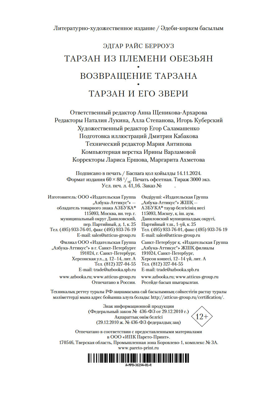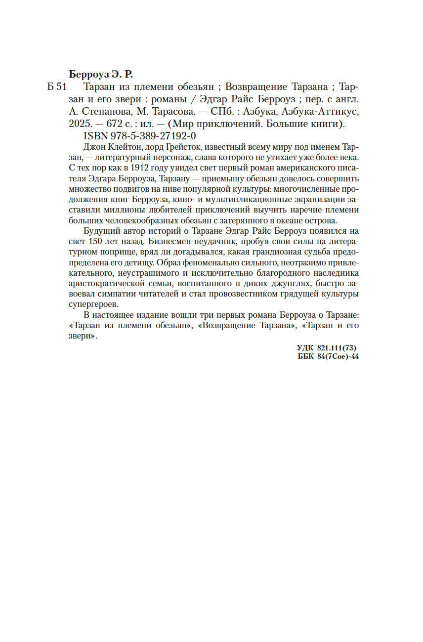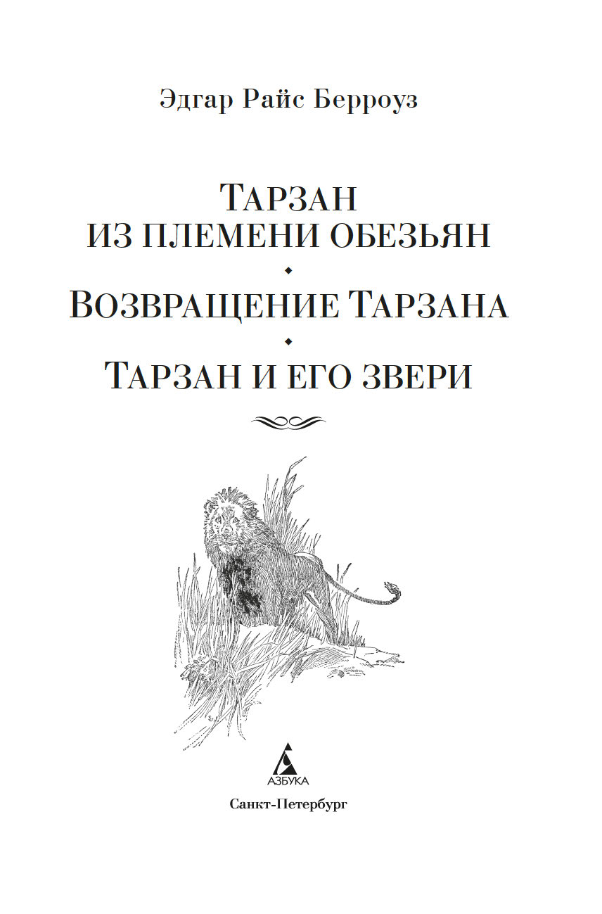 В настоящее издание вошли три первых романа Берроуза о Тарзане: "Тарзан из племени обезьян", "Возвращение Тарзана", "Тарзан и его звери".