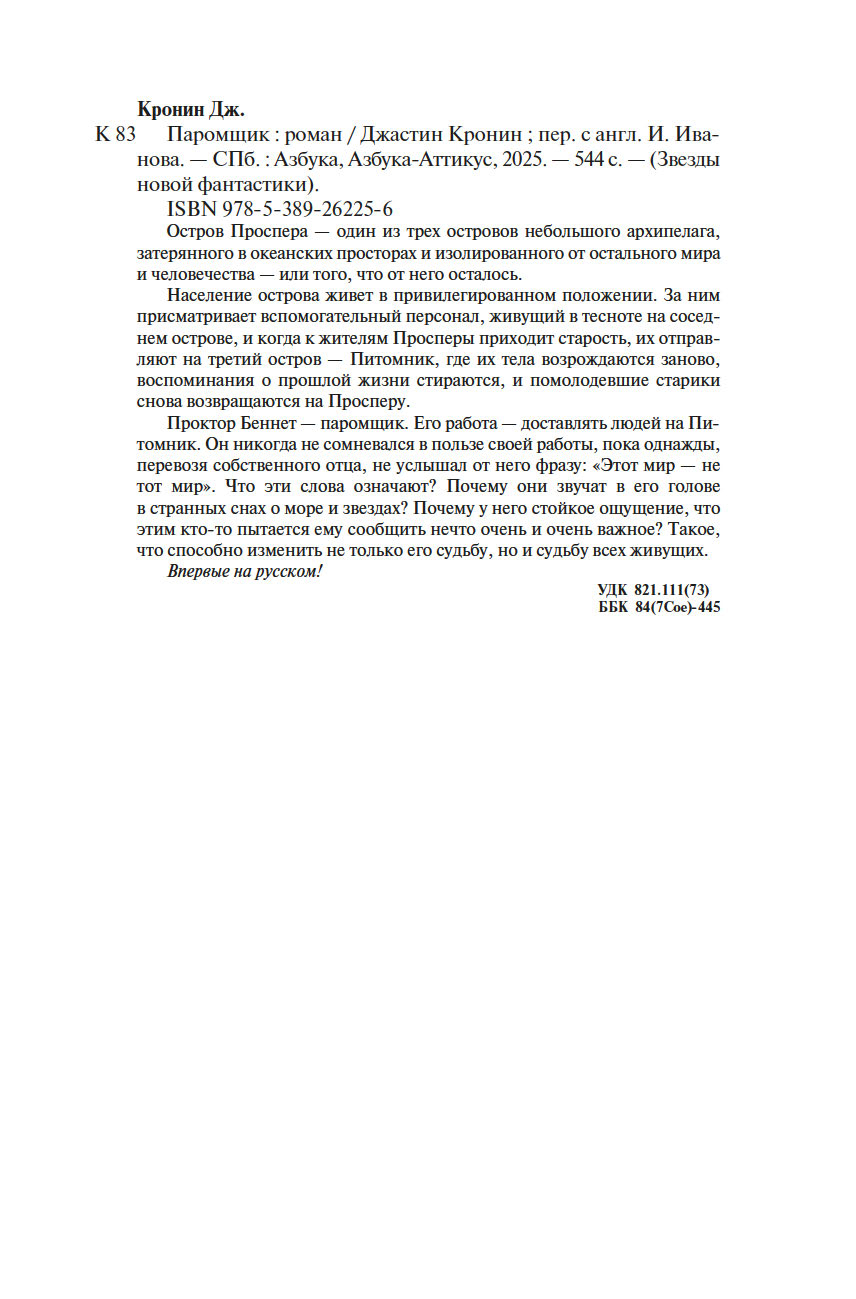 Проктор Беннет – паромщик. Его работа – доставлять людей на Питомник. Он никогда не сомневался в пользе своей работы, пока однажды, перевозя собственного отца, не услышал от него фразу: "Этот мир – не тот мир". Что эти слова означают? Почему они звучат в его голове в странных снах о море и звездах? Почему у него стойкое ощущение, что этим кто-то пытается ему сообщить нечто очень и очень важное? Такое, что способно изменить не только его судьбу, но и судьбу всех живущих.