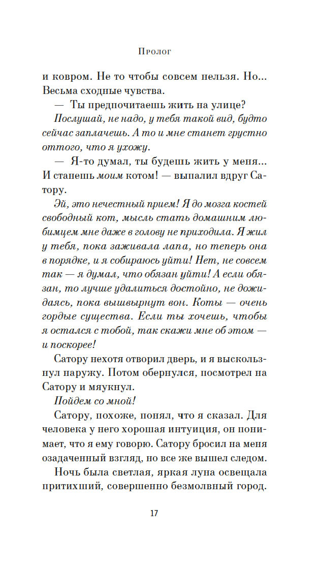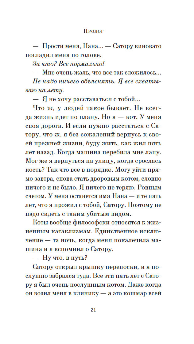На первый взгляд кот Нана, выступающий в роли рассказчика, реалист и прагматик до мозга костей, со своей, сугубо кошачьей, философией жизни. Однако ему удается так глубоко проникнуть во внутренний мир хозяина, что иногда он понимает Сатору лучше его самого. Кто же они друг для друга? Зачем Сатору раз за разом отправляется в путь, прихватив с собой любимого кота?..