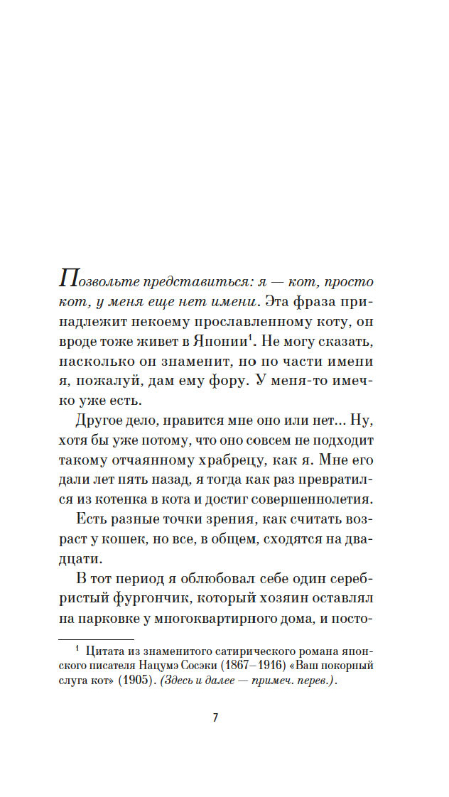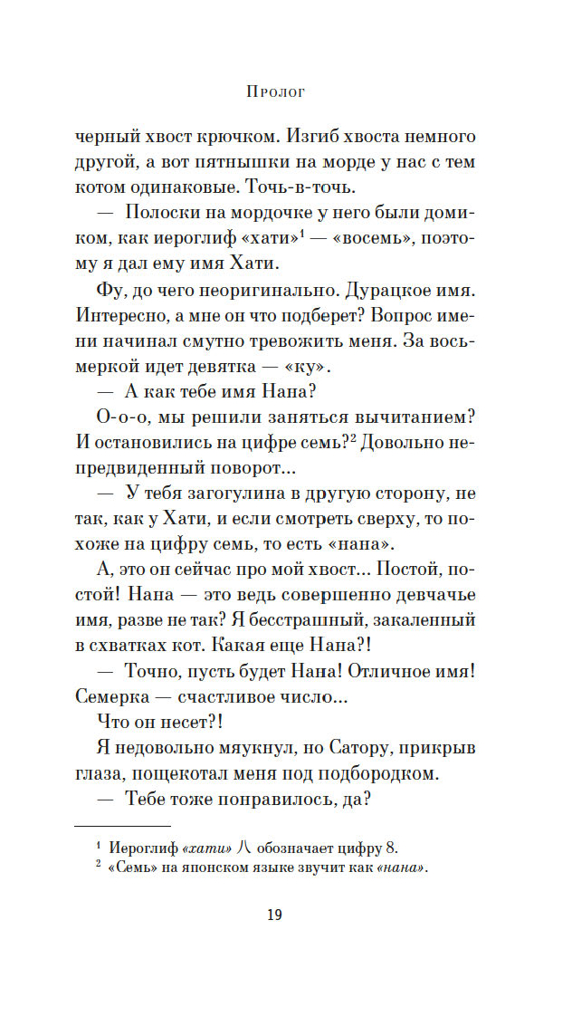 Это удивительная, трогательная история дружбы кота со "счастливым" именем Нана, что по-японски означает "семь", и его хозяина Сатору. Вместе с тем это роман-путешествие, в котором герои перемещаются как в пространстве, так и во времени: Нана открывает для себя безбрежные морские просторы и красоту горы Фудзи, а Сатору как будто заново переживает события детства и юности.