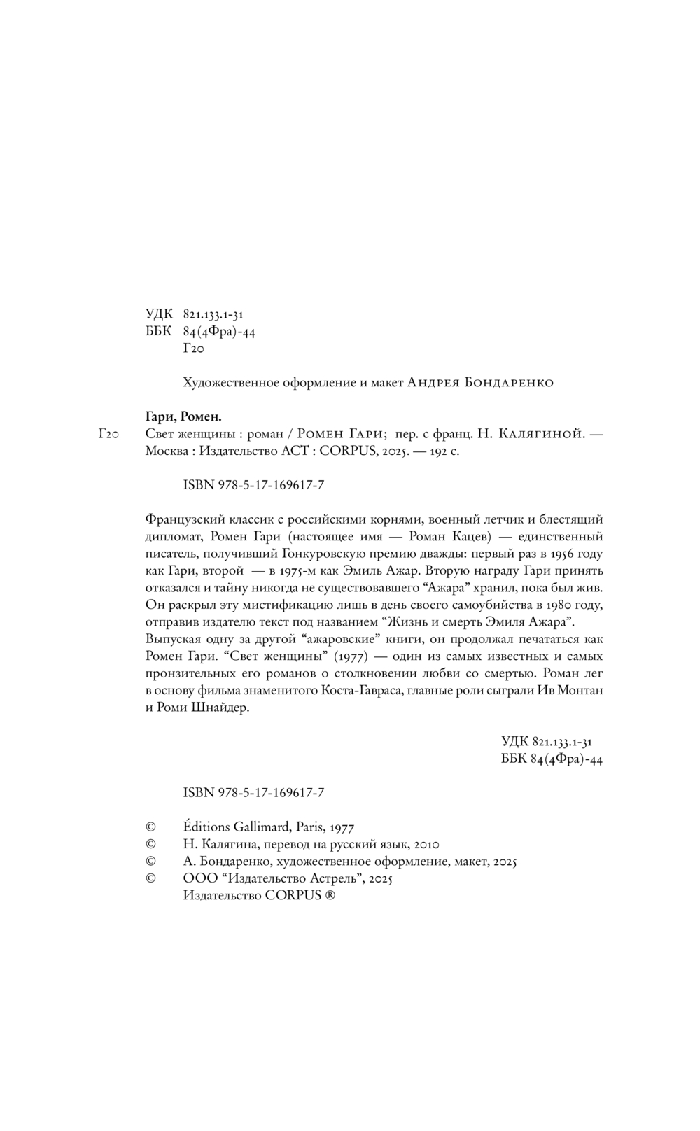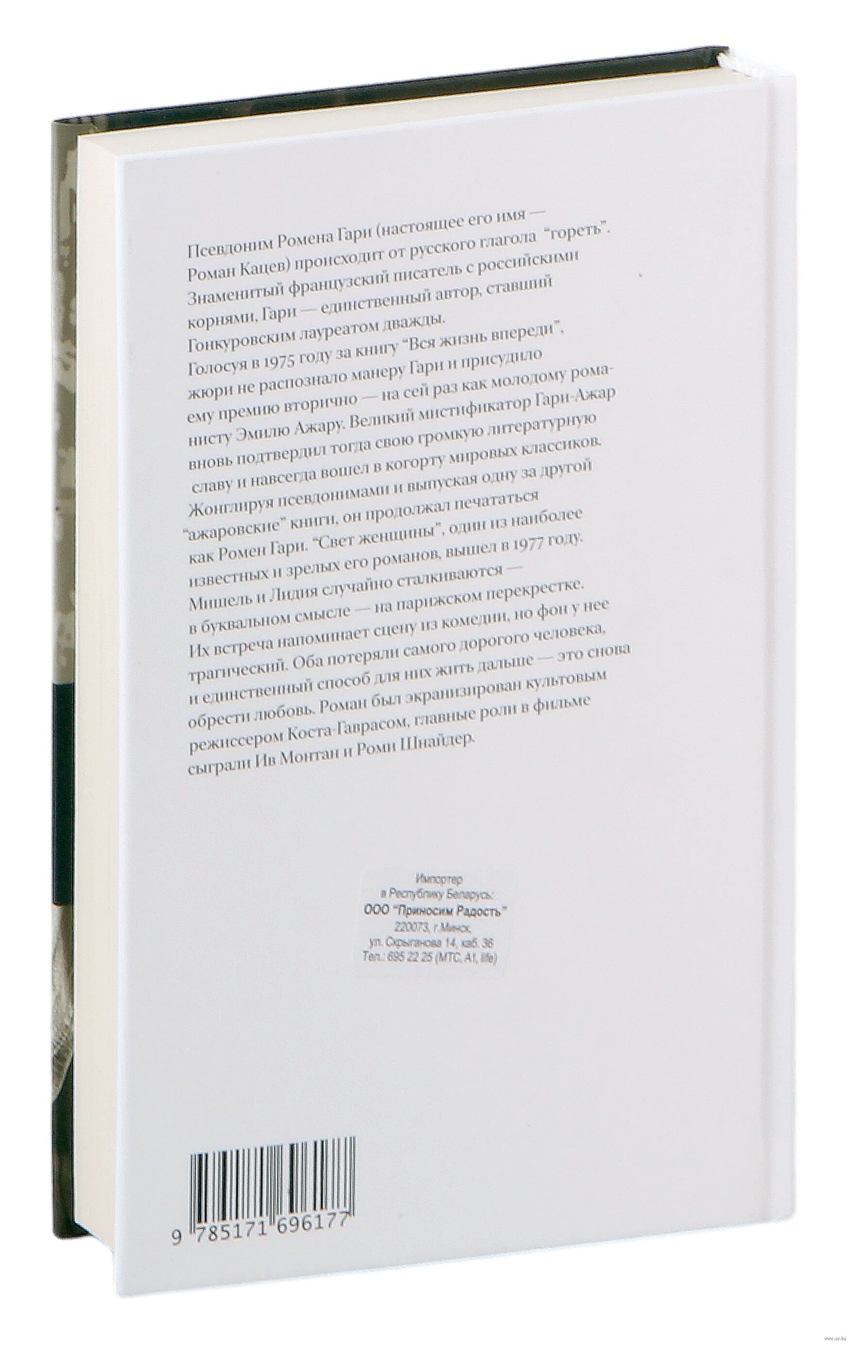Выпуская одну за другой "ажаровские" книги, он продолжал печататься как Ромен Гари. "Свет женщины" (1977) – один из самых известных и самых пронзительных его романов о столкновении любви со смертью. Роман лег в основу фильма знаменитого Коста-Гавраса, главные роли сыграли Ив Монтан и Роми Шнайдер.