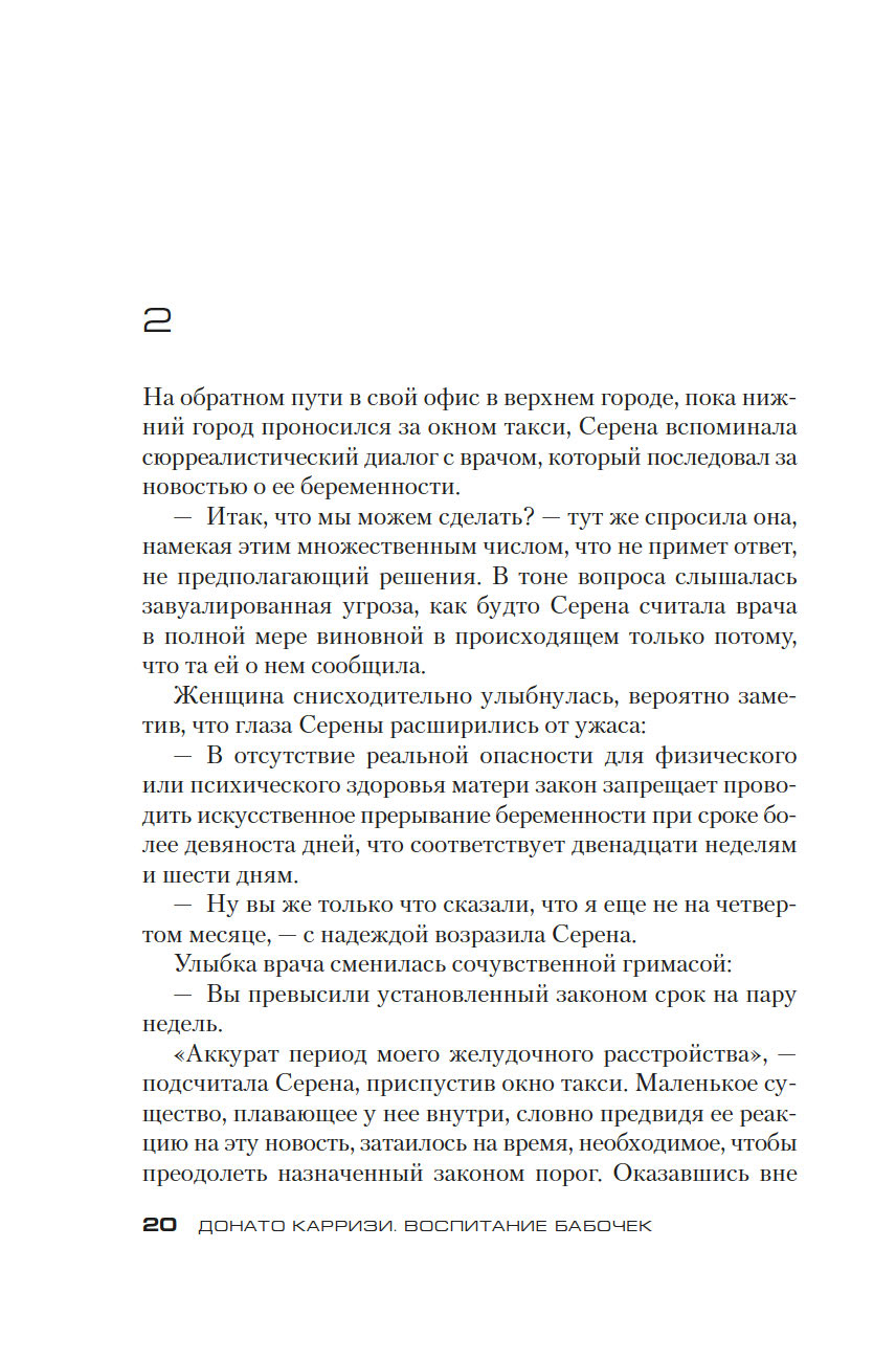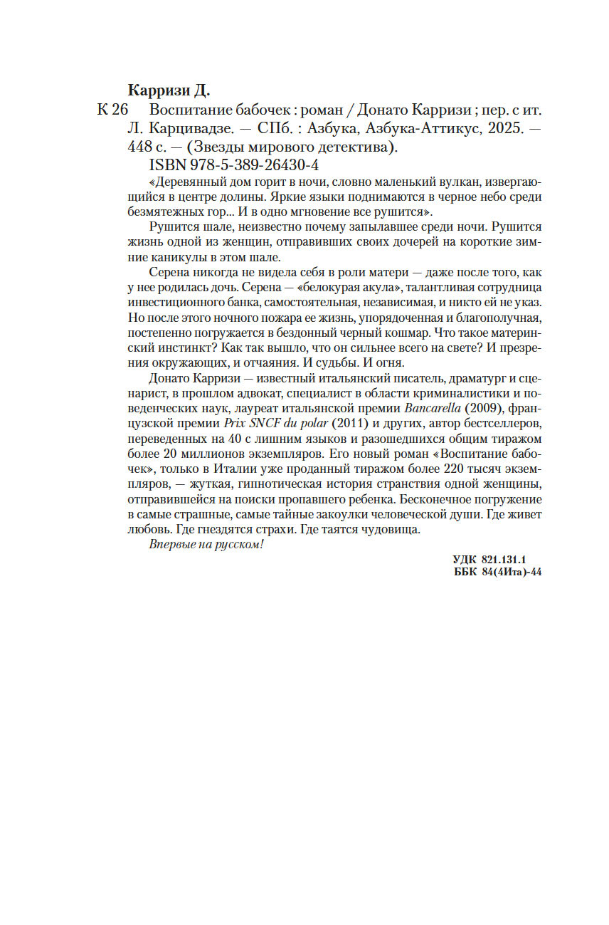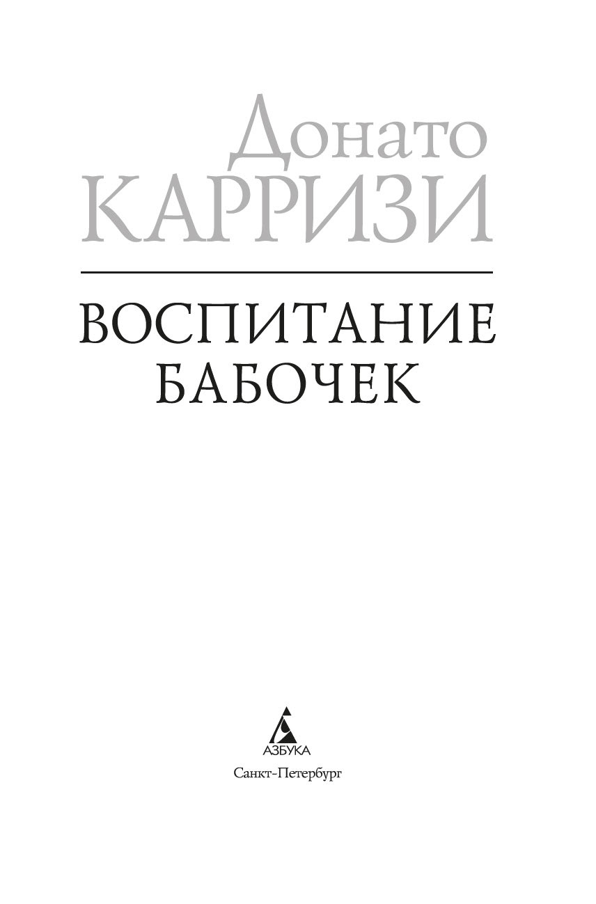 Донато Карризи – известный итальянский писатель, драматург и сценарист, в прошлом адвокат, специалист в области криминалистики и поведенческих наук, лауреат итальянской премии Bancarella (2009), французской премии Prix SNCF du polar (2011) и других, автор бестселлеров, переведенных на 40 с лишним языков и разошедшихся общим тиражом более 20 миллионов экземпляров. Его новый роман "Воспитание бабочек", только в Италии уже проданный тиражом более 220 тысяч экземпляров, – жуткая, гипнотическая история странствия одной женщины, отправившейся на поиски пропавшего ребенка. Бесконечное погружение в самые страшные, самые тайные закоулки человеческой души. Где живет любовь. Где гнездятся страхи. Где таятся чудовища.