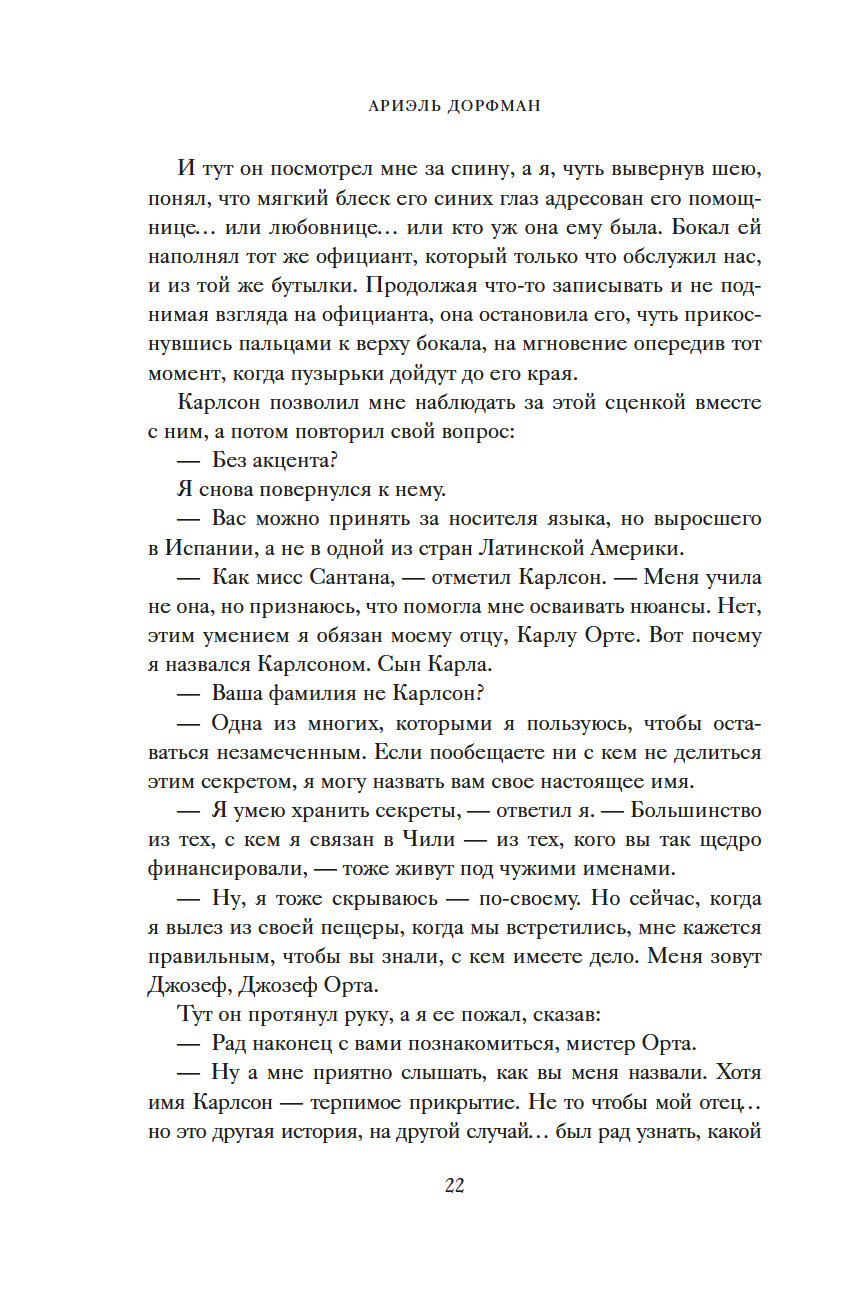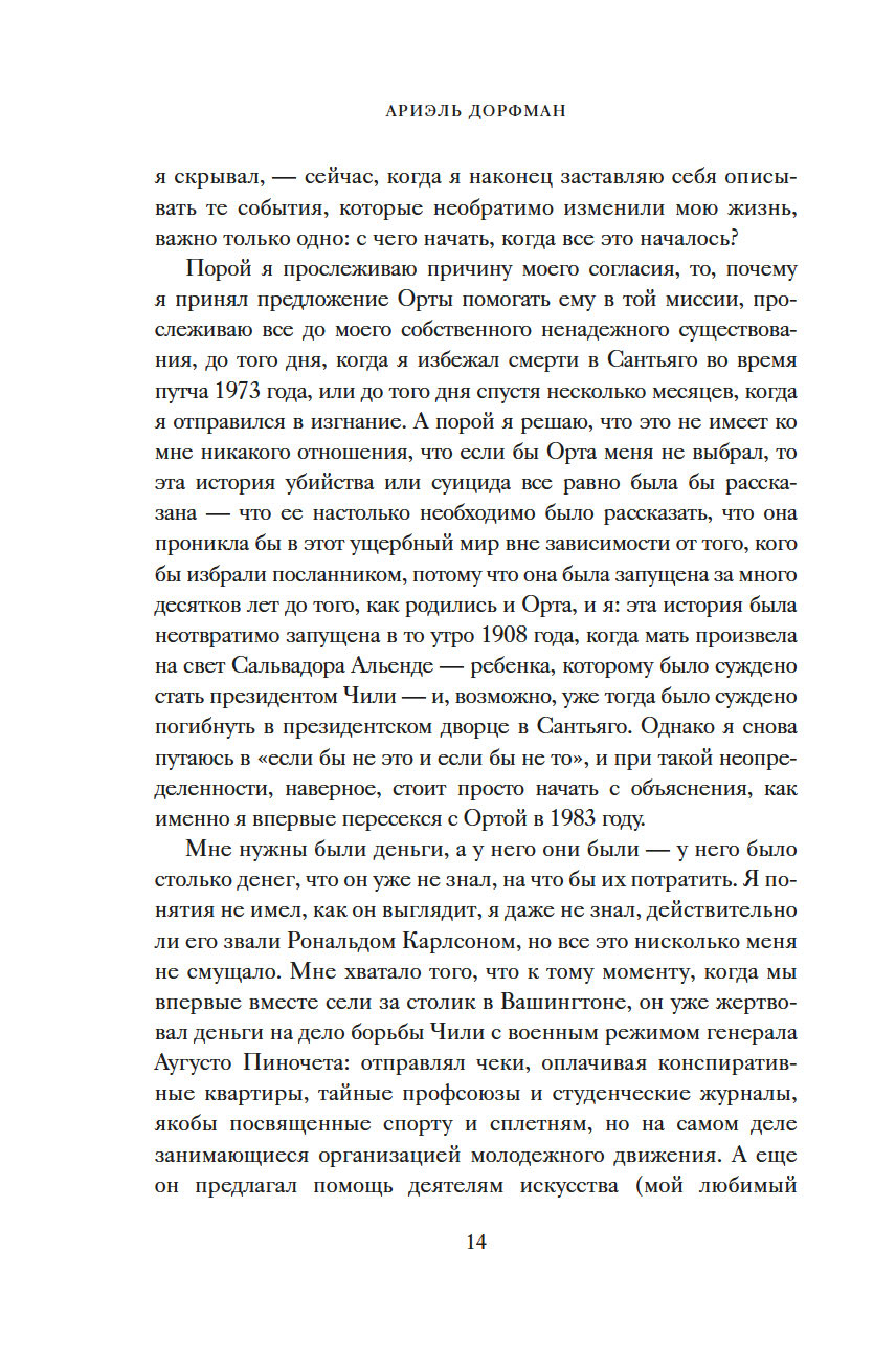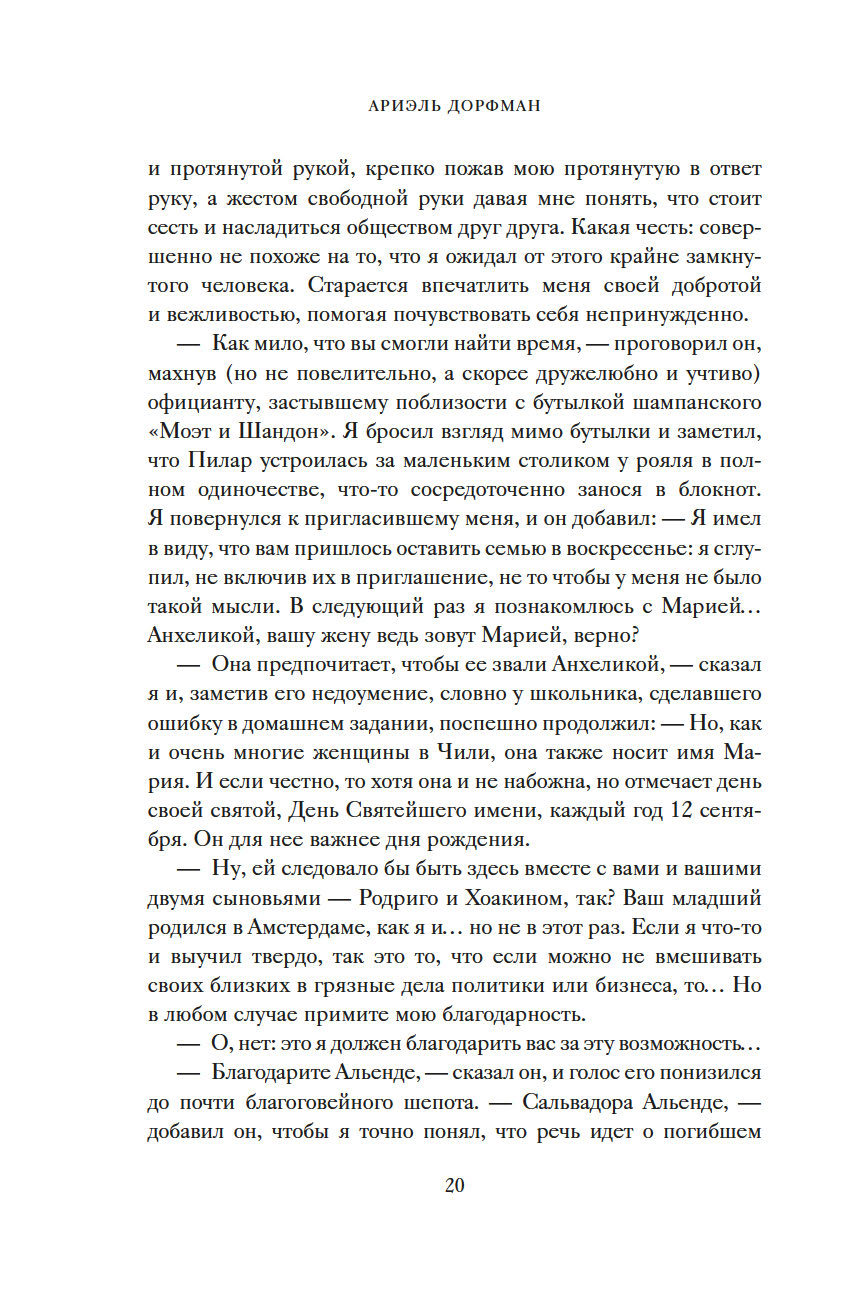Писателю Ариэлю Дорфману нужны деньги. Деньги есть у миллиардера Джозефа Хорты. Он нанимает писателя, чтобы тот раскрыл правду о смерти Сальвадора Альенде. Преисполненные благодарности к покойному президенту Чили и настойчивой потребностью узнать, убийство или самоубийство оборвало его жизнь во время государственного переворота 1973 года, двое мужчин приступают к расследованию, которое приведет их из Вашингтона и Нью-Йорка в Сантьяго и Вальпараисо и, наконец, в Лондон. Они сталкиваются с незабываемыми персонажами: свадебным фотографом, который может предсказать будущее пары, готовящейся пожениться; полицейским, преследующим серийного убийцу, нападавшего на беженцев; революционером, пойманным при попытке покушения на диктатора; и, прежде всего, со сложными женщинами, которые поддерживают их на этом пути по личным неочевидным причинам. А еще они должны встретиться лицом к лицу с собственными тяжелыми историями, чтобы найти путь вперед – для себя и для нашей опустошенной планеты.