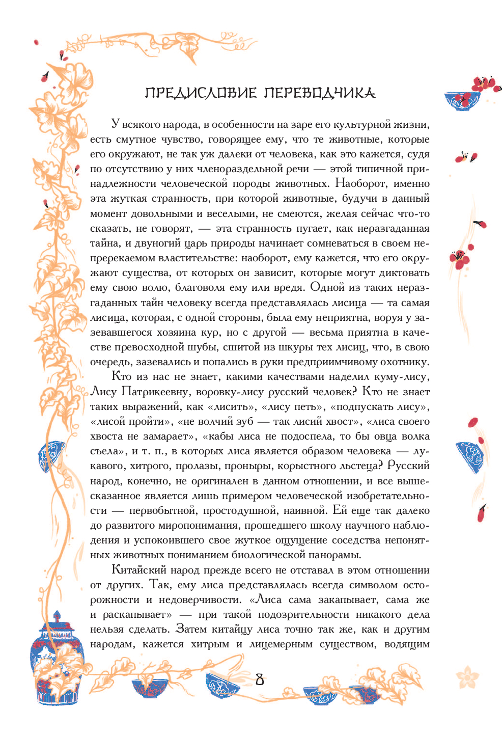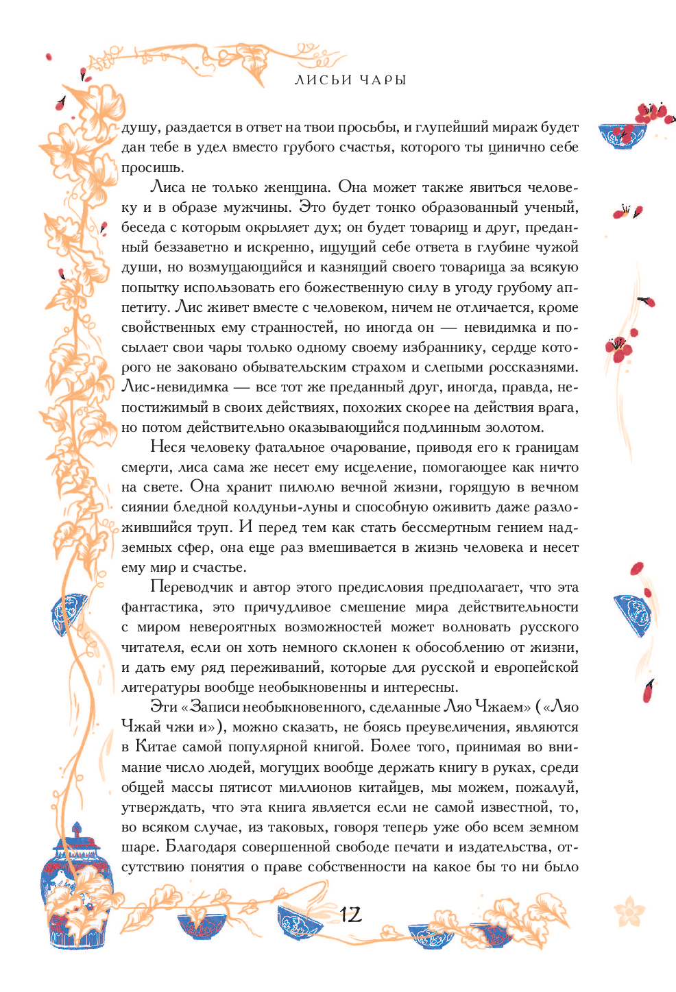 Мир новелл Пу Сунлина (1640-1715), текучий, пограничный, рождается на стыке повседневного и необычного, реального и фантастического, лирики и гротеска, полон неожиданных поворотов и столкновений разных действующих сил. Сверхъестественное подстерегает его харизматичных героев на каждом шагу – жутковатые фокусы загадочных монахов и колдунов, проделки лисиц и бесов, встречи с призраками, удивительные превращения и совпадения.