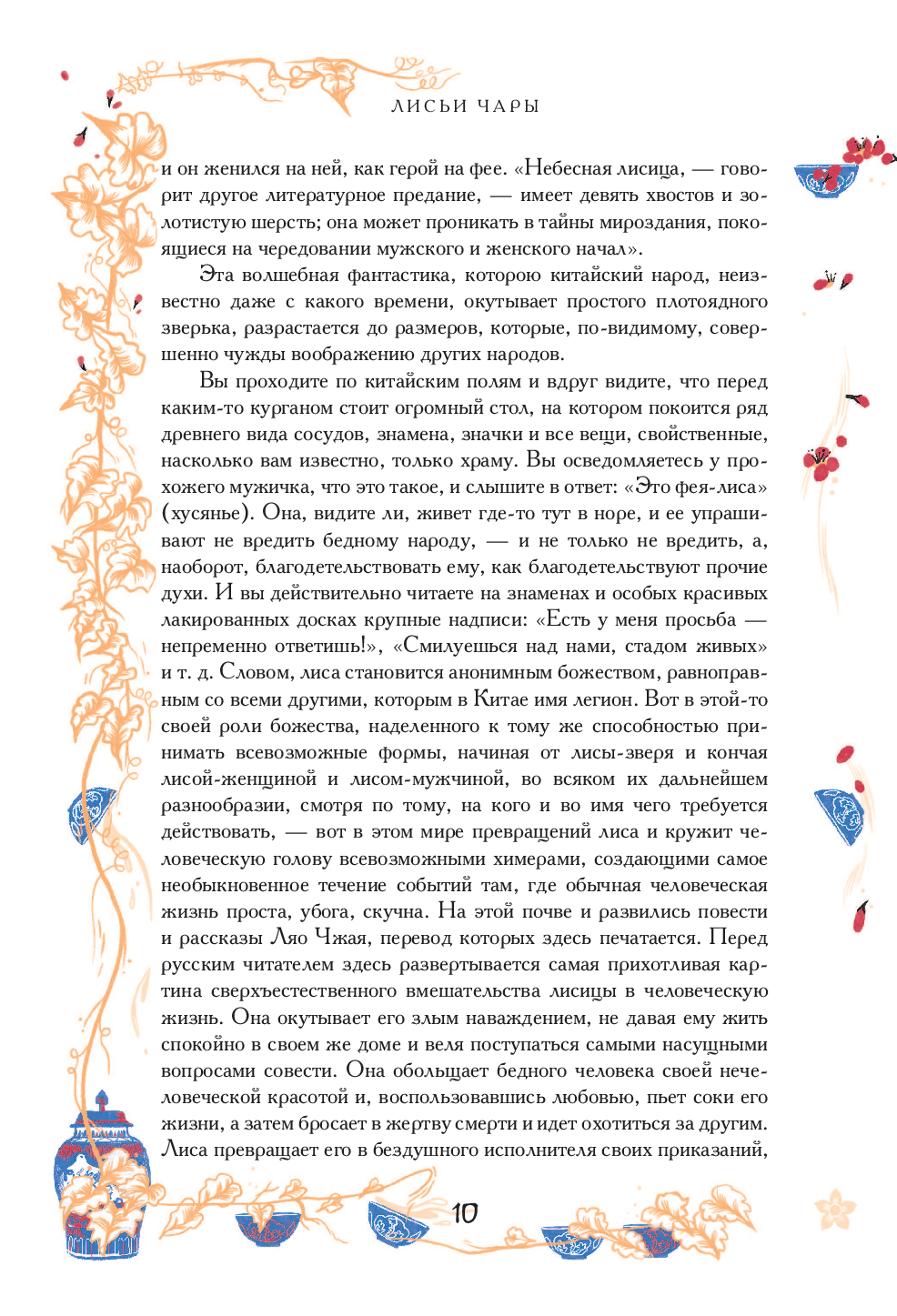 Фантастическое то и дело вторгается в жизнь обычных людей: студентов, чиновников, крестьян – в облике прекрасной незнакомки, нового соседа или странствующего монаха и переворачивает все вверх дном. Лисицы-оборотни наказывают за глупость и награждают за великодушие, даосские мудрецы помогают восстановить справедливость или, наоборот, вносят хаос в жизнь простых людей. Но фантастика служит не только для развлечения читателя – в экстраординарных обстоятельствах новыми красками играют вечные истории о мудрости и глупости, о больших и мелких человеческих слабостях: жадности, клевете, тщеславии, самонадеянности, суевериях, пагубных привычках – но и о вечной дружбе и, конечно, неземной любви.