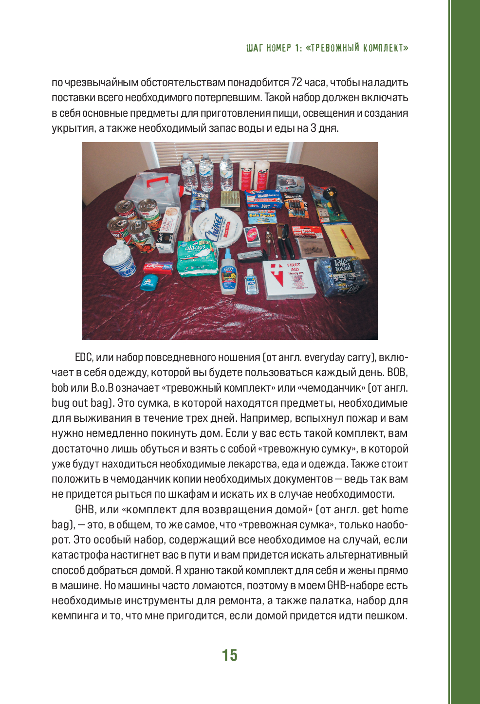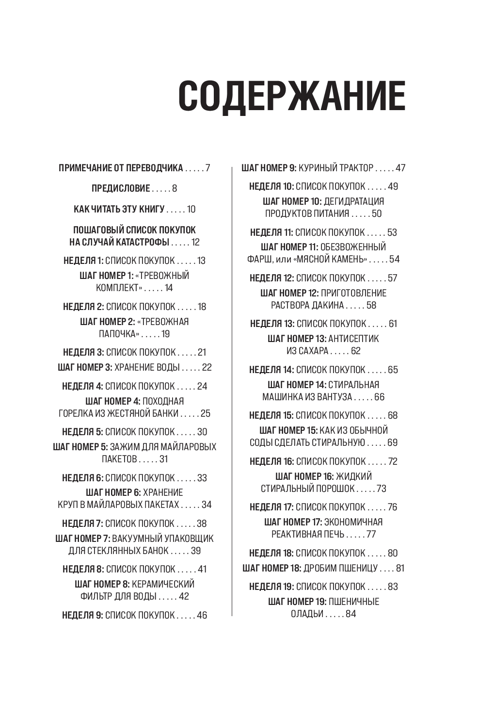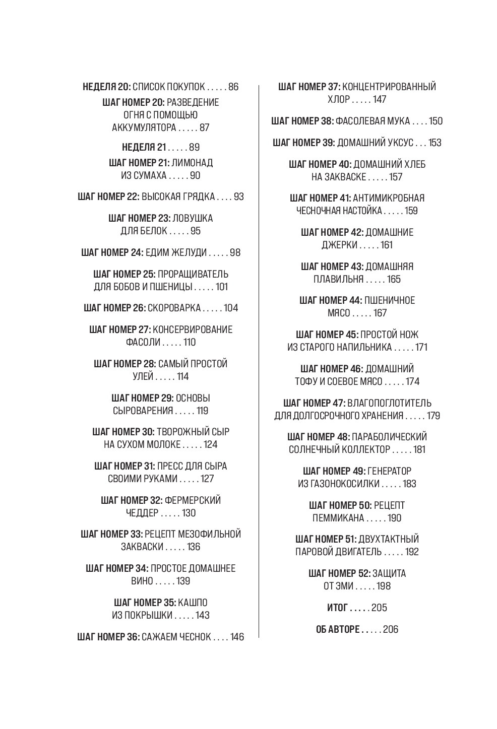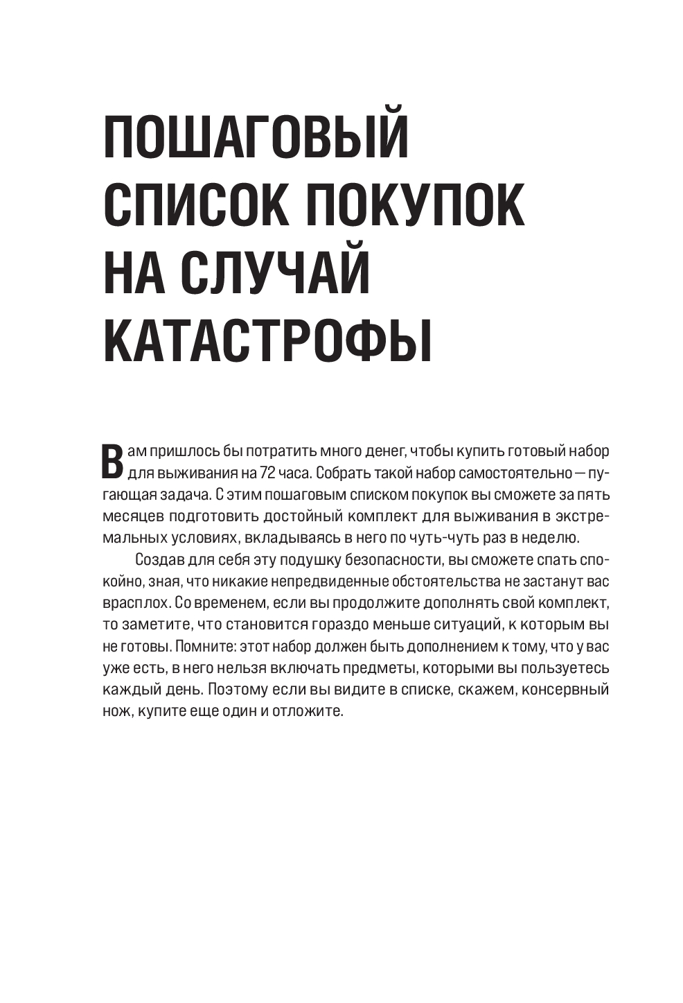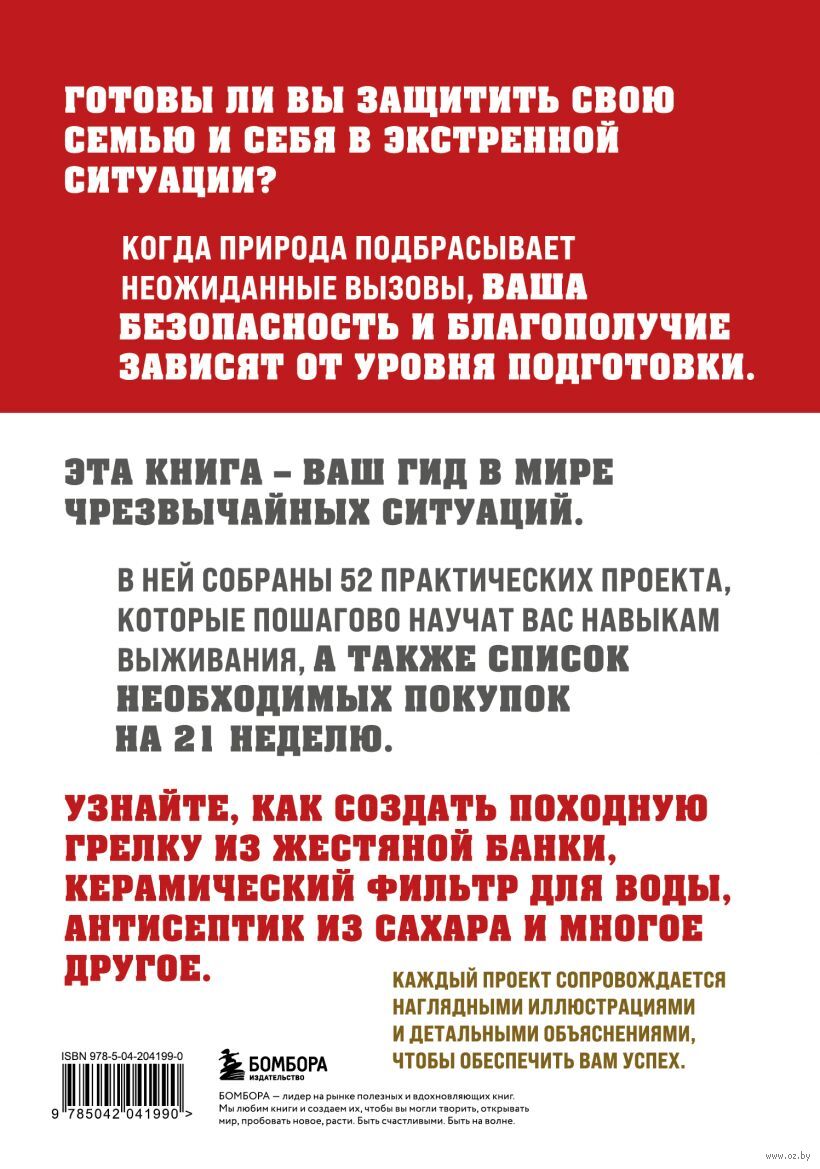 Эта книга – ваш гид в мире чрезвычайных ситуаций. В ней собраны 52 практических проекта, которые пошагово научат вас навыкам выживания, а также список необходимых покупок на 21 неделю. Узнайте, как создать походную грелку из жестяной банки, керамический фильтр для воды, антисептик из сахара и многое другое.