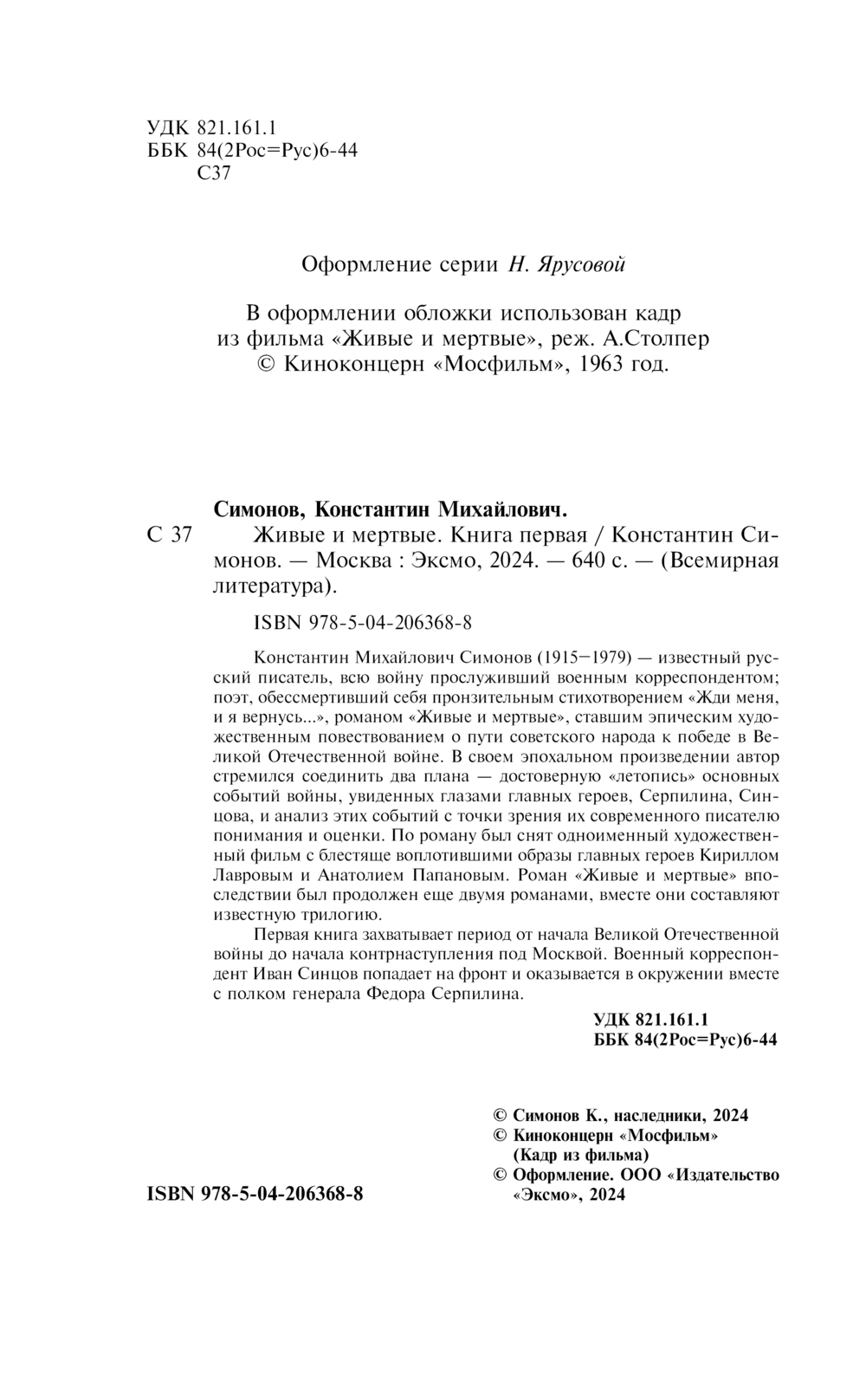 Константин Михайлович Симонов (1915 – 1979) – известный русский писатель, всю войну прослуживший военным корреспондентом; поэт, обессмертивший себя пронзительным стихотворением "Жди меня, и я вернусь...", романом "Живые и мертвые", ставшим эпическим художественным повествованием о пути советского народа к победе в Великой Отечественной войне. В своем эпохальном произведении автор стремился соединить два плана – достоверную "летопись" основных событий войны, увиденных глазами главных героев Серпилина, Синцова, и анализ этих событий с точки зрения их современного писателю понимания и оценки. По роману был снят одноименный художественный фильм с блестяще воплотившими образы главных героев Кириллом Лавровым и Анатолием Папановым. Роман "Живые и мертвые" впоследствии был продолжен еще двумя романами, вместе они составляют известную трилогию.
