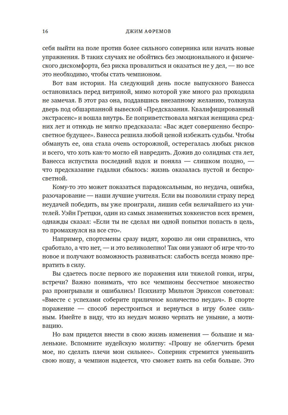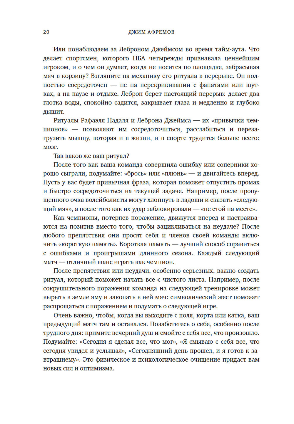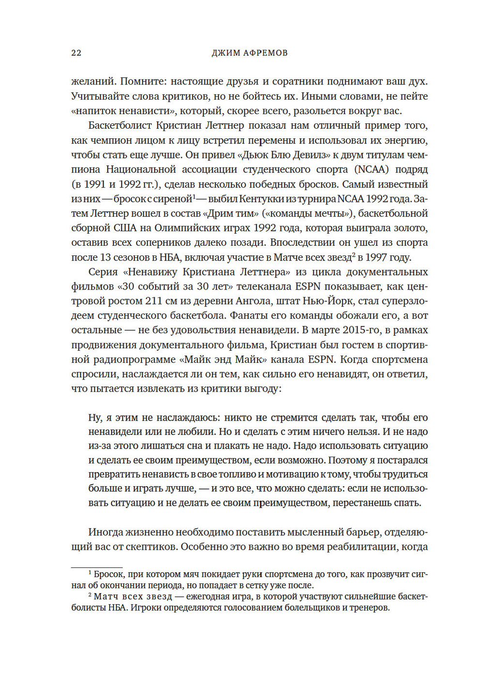 Способность после черной полосы вернуться на поле, на корт или в бизнес и заново добиться успеха – это не только про талант и физические возможности. Здесь наибольшее значение приобретает способ мышления и душевный настрой. Ведущий спортивный психолог Джим Афремов, автор бестселлера "Разум чемпионов", знает, что именно делает хороших игроков великими – как в спорте, так и в бизнесе, карьере, творчестве. На страницах этой книги он представляет тщательно выверенные пошаговые стратегии для спортсменов и неспортсменов любого возраста и уровня мастерства, которые помогают восстановиться после проигрыша, преодолеть последствия травмы (а также страх повторной травмы), взрастить в себе глубинную спокойную уверенность, подготовиться к соревнованиям и другим решающим событиям. Благодаря дельным замечаниям и советам, методикам аутотренинга и мотивирующим историям настоящих героев большого спорта, "Возвращение чемпионов" – практическое руководство для всех, кто хочет вернуться в игру и победить.