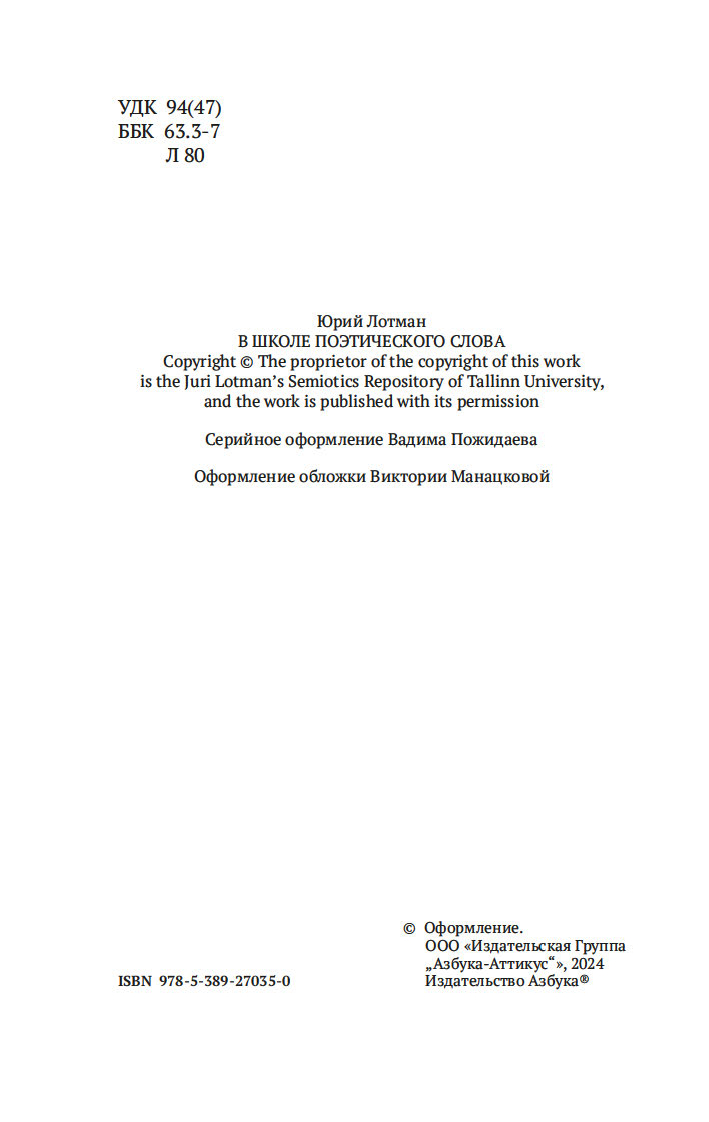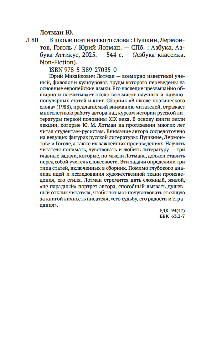 Юрий Михайлович Лотман – всемирно известный ученый, филолог и культуролог, труды которого переведены на основные европейские языки. Его наследие чрезвычайно обширно и насчитывает около восьмисот научных и научно-популярных статей и книг. Сборник "В школе поэтического слова" (1988), предлагаемый вниманию читателей, отражает многолетнюю работу автора над курсом истории русской литературы первой половины XIX века. В основу книги легли лекции, которые Ю. М. Лотман на протяжении многих лет читал студентам-русистам. Внимание автора сосредоточено на ведущих фигурах русской литературы: Пушкине, Лермонтове и Гоголе, а также их важнейших произведениях. Научить читателя понимать, чувствовать и любить литературу – три главные задачи, которые, по мысли Лотмана, должен ставить перед собой учитель словесности. Эти задачи определили три типа статей, включенных в сборник. Помимо глубокого анализа идей и исследования художественной ткани произведения, его стиля, Лотман стремится дать сложный, живой, «не парадный» портрет автора, способный вызвать душевный отклик читателя, чтобы тот мог почувствовать стоящую за книгой личность писателя, "его судьбу, его радости и страдания".