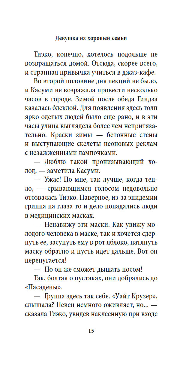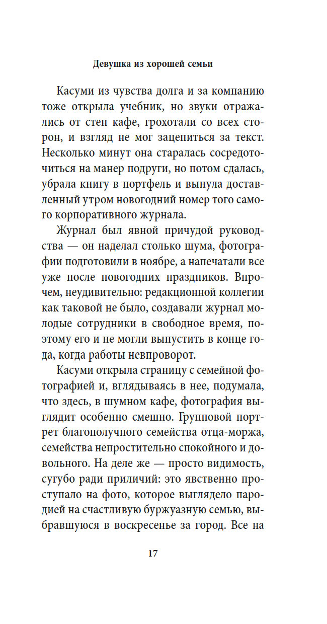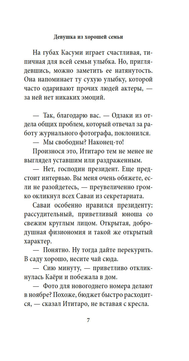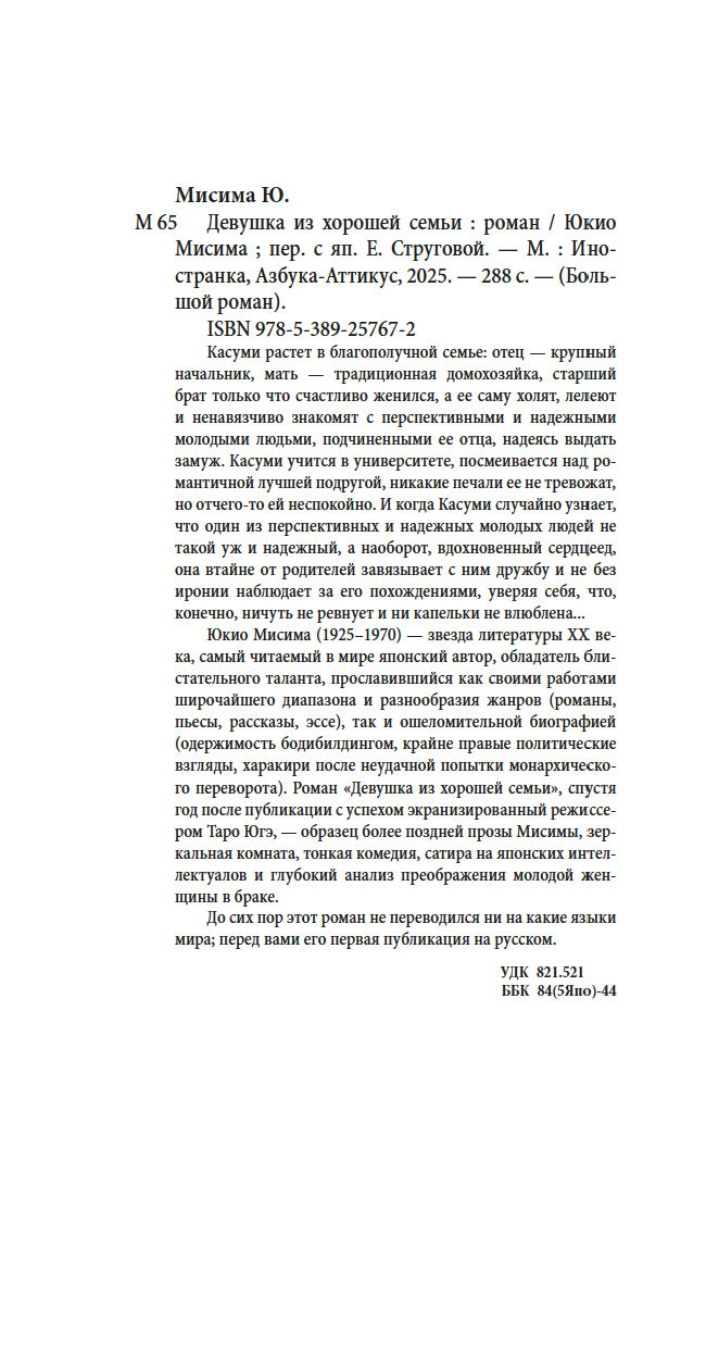 Юкио Мисима (1925-1970) – звезда литературы XX века, самый читаемый в мире японский автор, обладатель блистательного таланта, прославившийся как своими работами широчайшего диапазона и разнообразия жанров (романы, пьесы, рассказы, эссе), так и ошеломительной биографией (одержимость бодибилдингом, крайне правые политические взгляды, харакири после неудачной попытки монархического переворота). Роман "Девушка из хорошей семьи", спустя год после публикации с успехом экранизированный режиссером Таро Югэ, – образец более поздней прозы Мисимы, зеркальная комната, тонкая комедия, сатира на японских интеллектуалов и глубокий анализ преображения молодой женщины в браке.