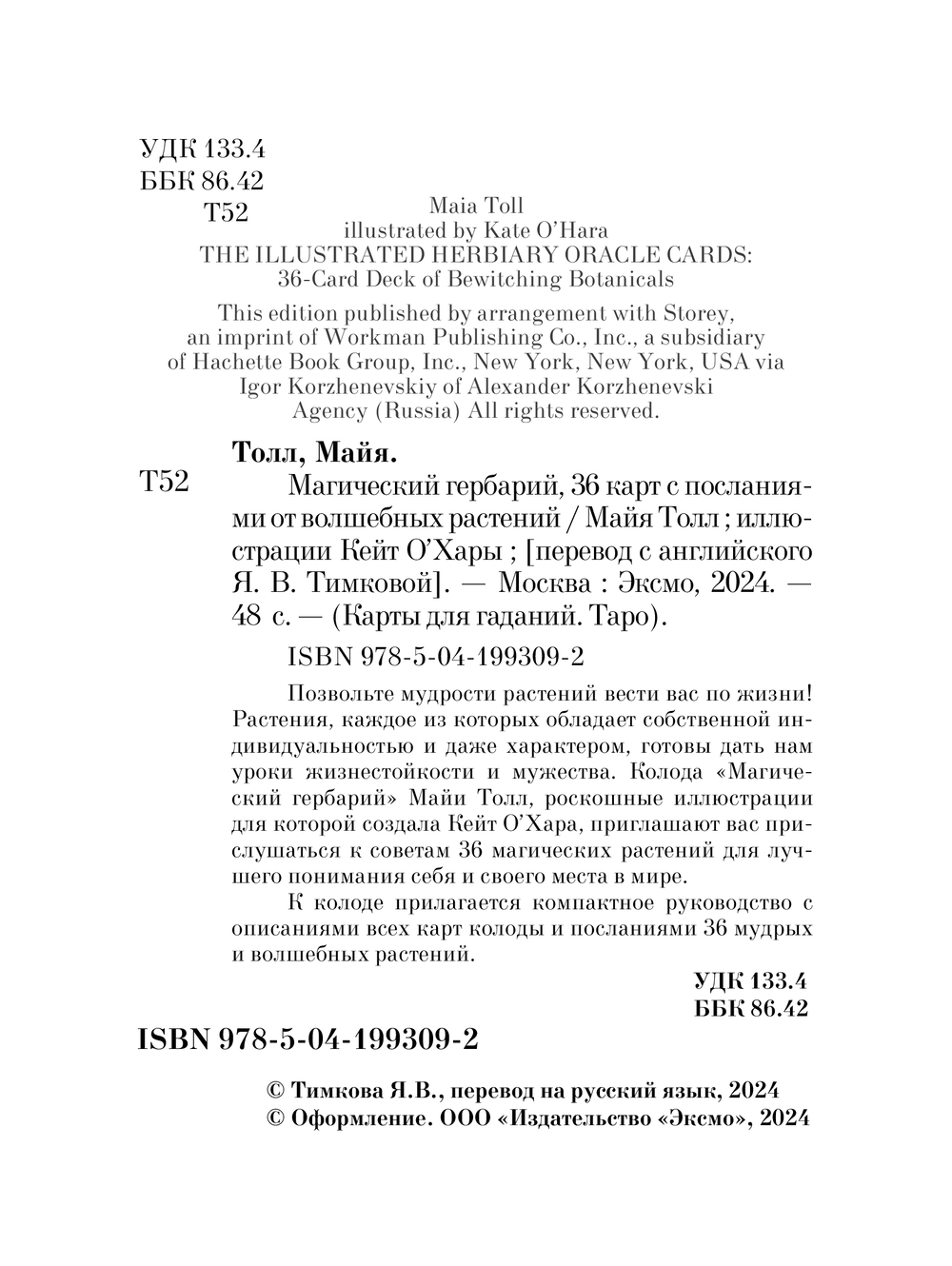 Позвольте мудрости растений вести вас по жизни! Растения, каждое из которых обладает собственной индивидуальностью и даже характером, готовы дать нам уроки жизнестойкости и мужества. Колода "Магический гербарий" Майи Толл, роскошные иллюстрации для которой создала Кейт О`Хара, приглашают вас прислушаться к советам 36 магических растений для лучшего понимания себя и своего места в мире.