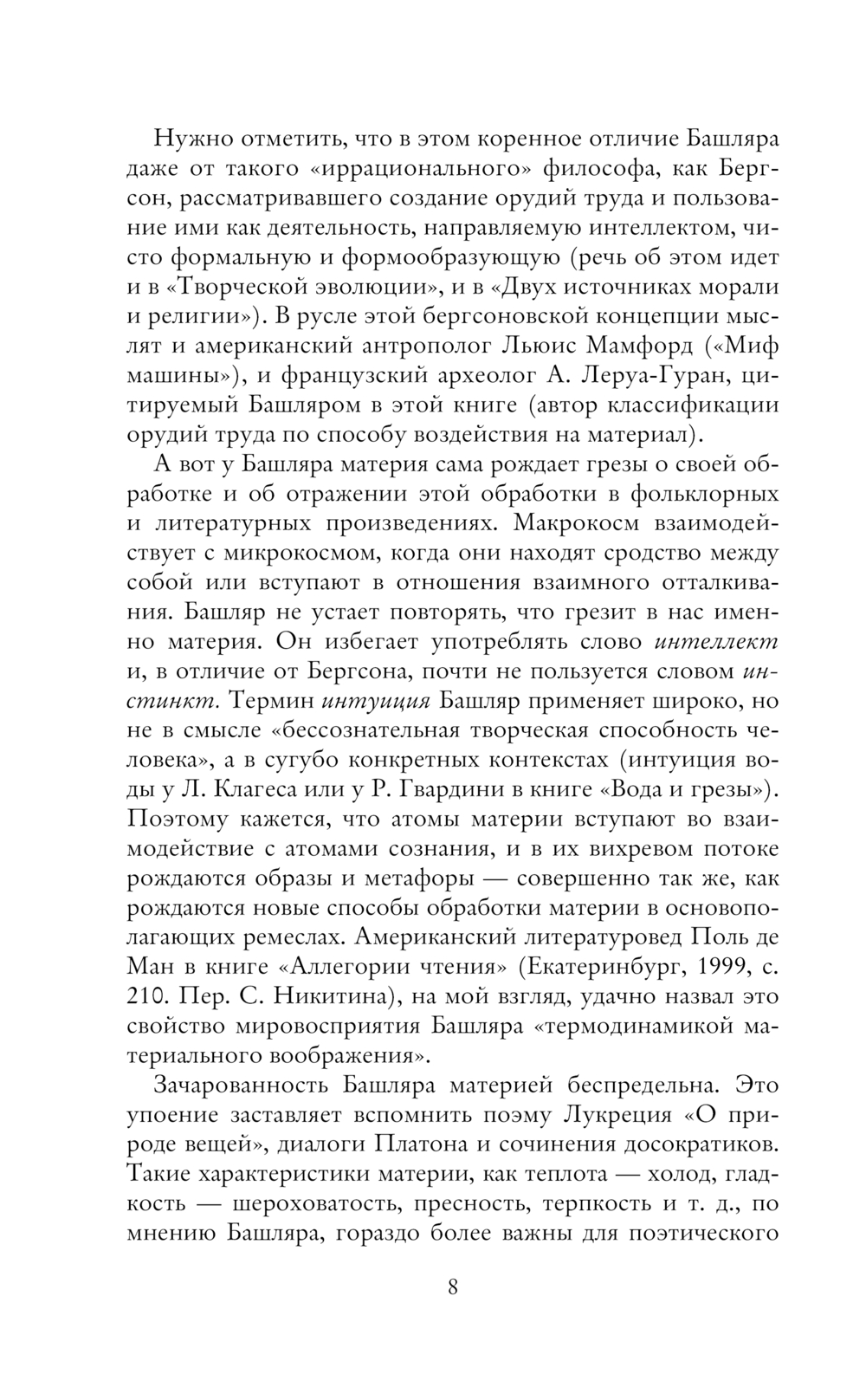 Поэтическое расследование Башляра проходит сквозь произведения таких авторов, как В. Вулф, Э. Лённрот, Г. Мелвилл, И. В. Гёте, Ж.-П. Сартр, А. Блок, А. Белый, С. Есенин и другие.