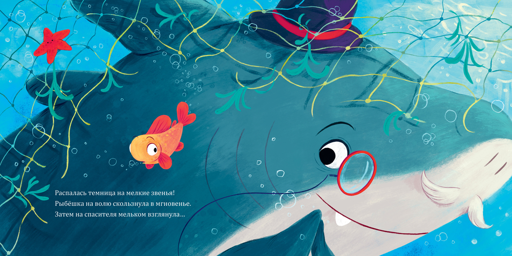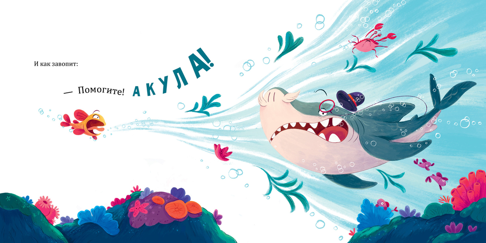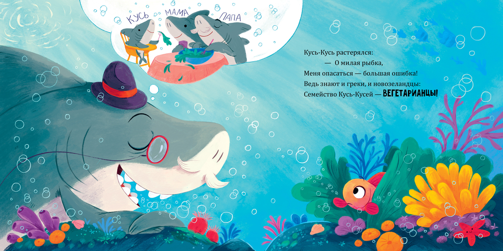 Восхитительный мистер Кусь-Кусь – главная звезда океана: он обаятелен, воспитан и всегда готов прийти на выручку, если кто-то попал в беду. Так он и поступил, когда одна несчастная рыбешка попала в сети. Мистер Кусь-Кусь отважно ринулся ее спасать, но... напугал еще больше! Ах, да... Вы же не знаете, что Кусь-Кусь не только звезда океана, но и ве-ге-та-ри-а-нец!