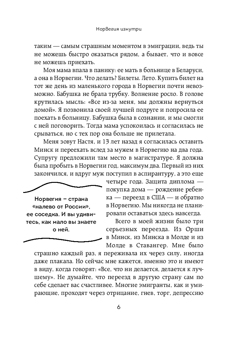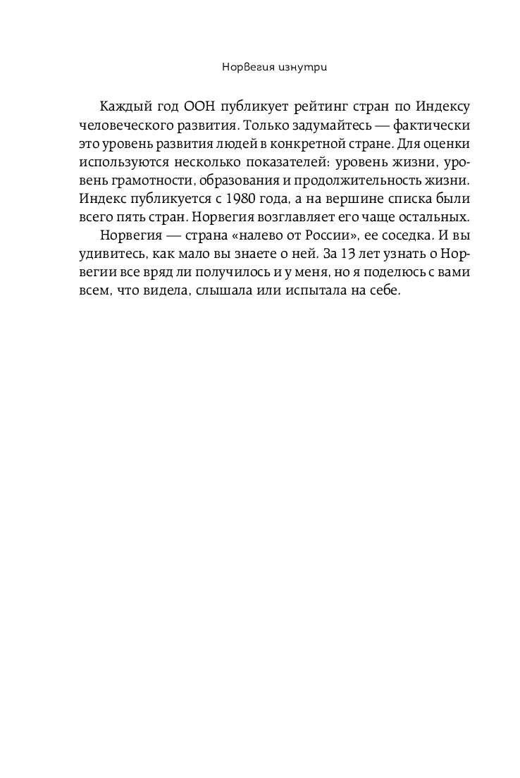 Автор книги "Норвегия изнутри" Анастасия Рубашевская приглашает вас в захватывающее путешествие по культуре и жизни в этой прекрасной скандинавской стране. Она без прикрас расскажет о том, как живут норвежцы, что для них значат семья и религия, какие особенности таит в себе местная кухня. А также попробует понять феномен норвежского счастья.